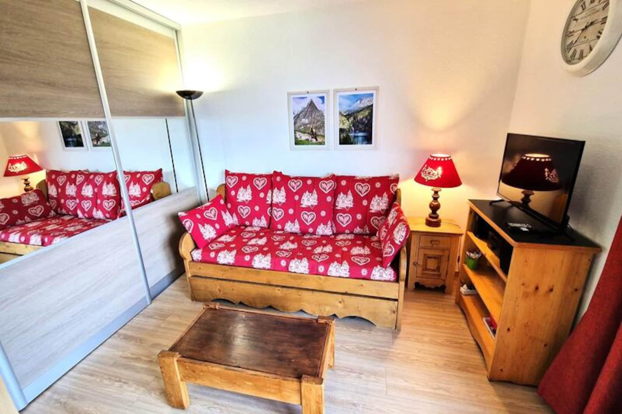 Højt over det travle feriested Les Arcs 1800 inviterer denne charmerende lejlighed dig til at opleve magien i de franske alper i enhver sæson. Fra balkonen kan du se ud over de majestætiske tinder i Vanoise-massivet, hvor sneen glimter om vinteren, og stierne lokker om sommeren. Uanset om du er her for at sno dig gennem uberørte skråninger eller udforske alpine enge, placerer denne bolig dig i hjertet af det hele, med pisterne og svævebanen kun få skridt væk. Feriestedets livlige atmosfære, kombineret med bjergenes ro, skaber en perfekt balance til din ferie. \n\nIndenfor tilbyder lejligheden en hyggelig, men funktionel indretning designet til at rumme op til otte gæster. Stuen har en udtrækssovesofa, mens en hytte med køjesenge og et separat soveværelse med en dobbeltseng giver rigelig soveplads. Tekøkkenet er fuldt udstyret med moderne apparater, herunder opvaskemaskine, ovn og mikrobølgeovn, hvilket sikrer, at du har alt, hvad du behøver for at tilberede solide måltider efter en dag med eventyr. Et badeværelse med badekar, et brusebad i soveværelset og et separat toilet bidrager til bekvemmeligheden, mens Wi-Fi og et tv sikrer, at du forbliver forbundet og underholdt. \n\nTræd udenfor, og du vil blive fordybet i det pulserende liv i Les Arcs 1800. Butikker, skiskoler og afterski-steder ligger alle inden for gåafstand, hvilket gør det nemt at nyde det bedste af feriestedet. Om sommeren forvandles regionen til et paradis for vandrere, cyklister og naturentusiaster, med Vanoise Nationalpark kun en kort tur væk. Uanset om du svæver over dalen på en paraglider eller nyder lokale Savoyard-specialiteter, er hvert øjeblik her uforglemmeligt. \n\nDenne lejlighed er mere end bare et sted at bo - det er din port til Alpernes vidundere. Med sin ideelle beliggenhed, gennemtænkte faciliteter og betagende udsigt er det det perfekte valg for både familier, venner og eventyrere.