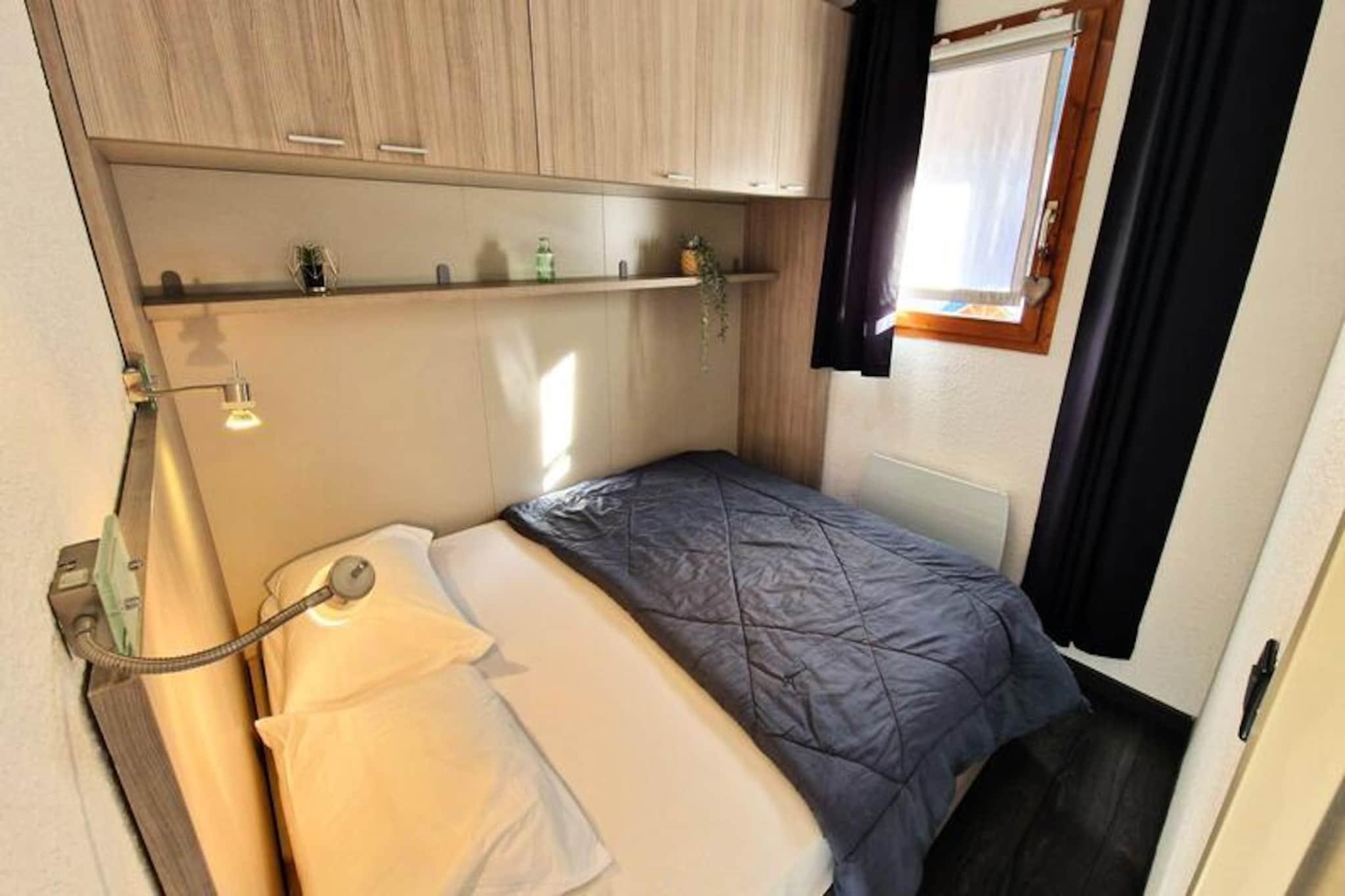 I hjertet af de pulserende franske alper inviterer denne charmerende toværelses lejlighed med hytte dig til at opleve magien ved bjerglivet. Beliggende kun få skridt fra pisterne og svævebanen tilbyder den uovertruffen bekvemmelighed for både skientusiaster og naturelskere. Forestil dig at vågne op til den friske alpeluft, nippe til din morgenkaffe på den vestvendte balkon og gå direkte ud for at udforske de uberørte snedækkede stier eller naturskønne sommerstier. \n\nLejligheden er designet til komfortabelt at rumme 4 til 6 gæster og har en hyggelig stue med en dobbelt sovesofa og tv, et roligt soveværelse med en dobbeltseng og en separat hytte med to køjesenge. Tekøkkenet er fuldt udstyret med moderne apparater, herunder køleskab, mikrobølgeovn, opvaskemaskine og fire kogeplader, hvilket gør det nemt at tilberede måltider efter en dag med eventyr. Et badeværelse med bruser, separat toilet og den ekstra bekvemmelighed af en vaskemaskine sikrer et behageligt ophold. Den vestvendte balkon er det perfekte sted at slappe af og nyde den betagende udsigt over bjergene. \n\nResidensen er ideelt beliggende i nærheden af ??butikker, skiskoler og alle de faciliteter, du har brug for til en stressfri ferie. Et skirum i stueetagen gør det nemt at opbevare dit udstyr, mens den livlige feriestedsatmosfære sikrer, at der altid er noget at se og lave. Uanset om du er her for skiløb i verdensklasse om vinteren eller de endeløse vandre- og cykelstier om sommeren, placerer denne lejlighed dig i centrum af det hele. \n\nMed sin uovertrufne beliggenhed, gennemtænkte faciliteter og hyggelige atmosfære er dette alpine tilflugtssted det perfekte valg til at skabe uforglemmelige minder i de franske alper.
