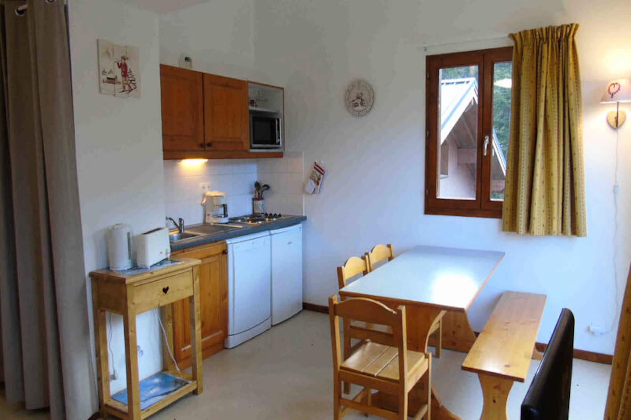 Denne charmerende toværelses lejlighed med sovealkove ligger på tredje sal i Jonquille Residence i Valfréjus og tilbyder et hyggeligt tilflugtssted for op til seks gæster. Med en betagende vestvendt udsigt over dalen og den majestætiske Vanoise Nationalpark er det en perfekt base for både vinter- og sommereventyr. Kun 200 meter fra Charmasson-liften og 500 meter fra Arrondaz-svævebanen har du ubesværet adgang til pisterne og hjertet af feriestedets aktiviteter.\n\nIndvendigt er lejligheden omhyggeligt designet til komfort og bekvemmelighed. Tekøkkenet er fuldt udstyret med et elektrisk kogeplade med fire blus, mikrobølgeovn, køleskab, opvaskemaskine og essentielle apparater som kaffemaskine, brødrister og elkedel. Opholdsstuen har et tv og en sovesofa, mens sovepladserne omfatter et hyggeligt soveværelse med en dobbeltseng, et kahytrum med køjesenge og ekstra soveplads i stuen. Et moderne badeværelse med bruser og håndvask samt et separat toilet sikrer praktisk anvendelighed for familier eller grupper.\n\nValfréjus tilbyder gratis udendørs parkering, og yderligere tjenester såsom overdækket parkering, liftkort og leje af udstyr kan arrangeres gennem udlejningsbureauet. Om sommeren gør aktivitetskort og leje af udstyr det endnu nemmere at udforske de alpine stier og nærliggende attraktioner. Resortets nærhed til Vanoise Nationalpark inviterer gæsterne til at fordybe sig i naturen, uanset om det er vandreture, dyrelivsobservation eller blot at nyde den fredfyldte bjergatmosfære.\n\nUanset om du søger spændende skidage eller rolige sommerferier, kombinerer denne lejlighed komfort, bekvemmelighed og en fantastisk udsigt for at skabe uforglemmelige ferieminder.