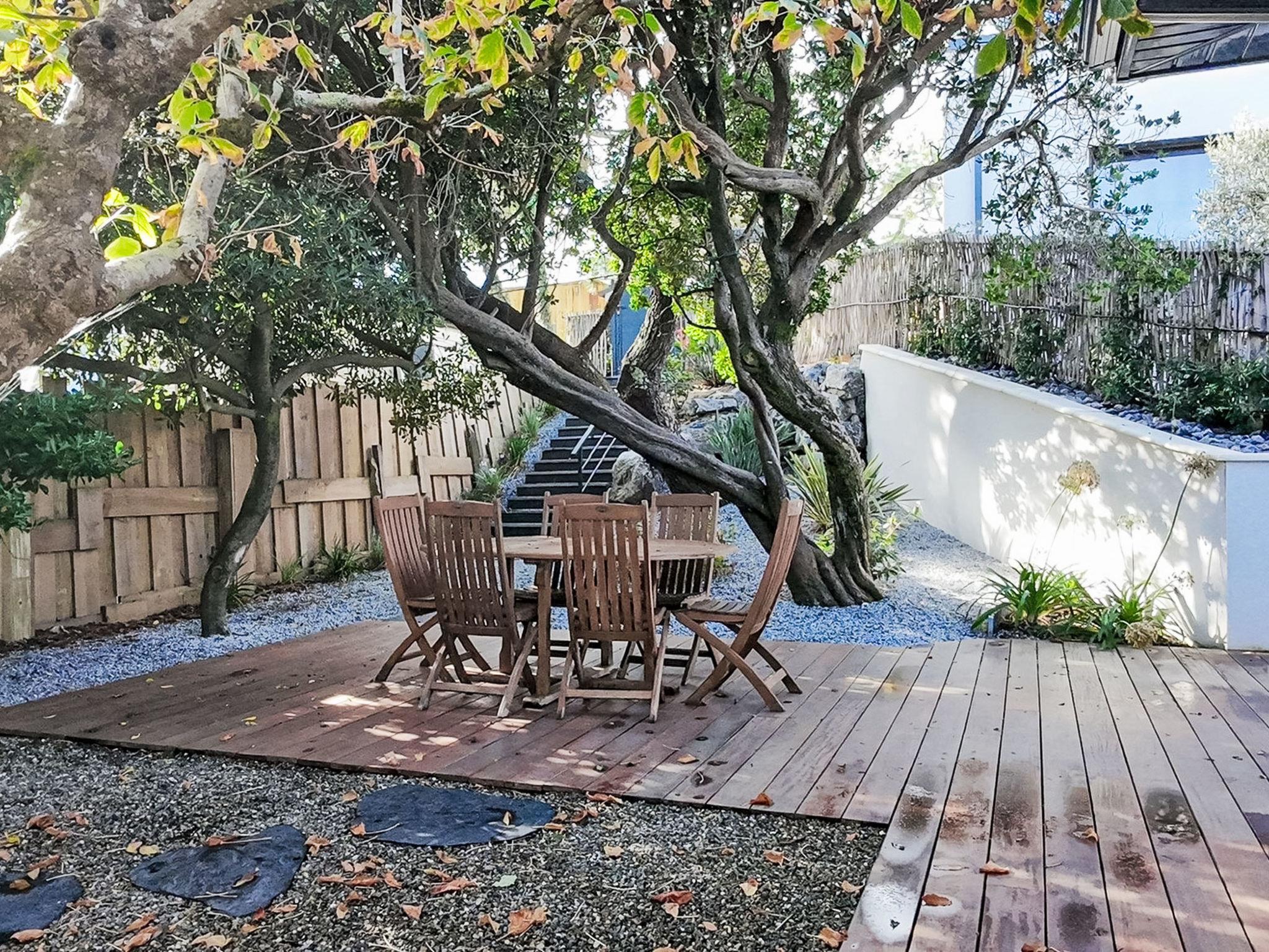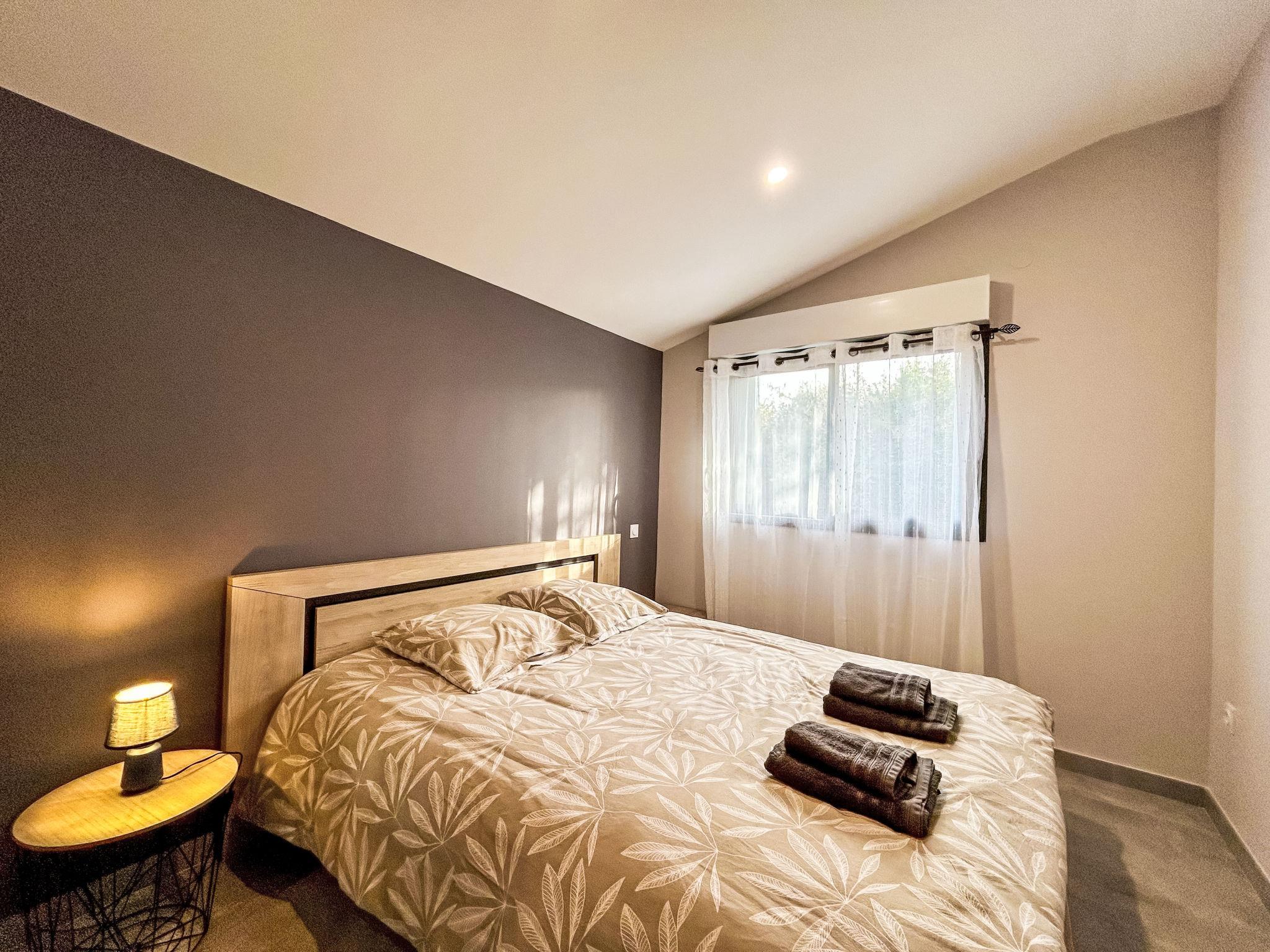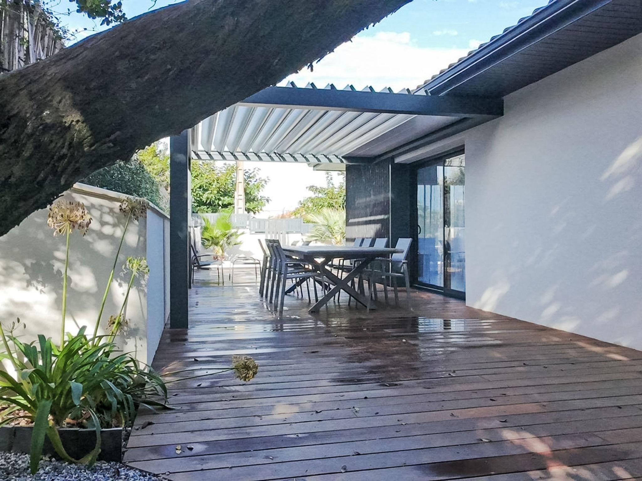 4-room house. Comfortable and modern furnishings: living/dining room 40 m2 with TV (flat screen). Exit to the garden, to the terrace. 2 rooms, each room with 1 french bed (160 cm, length 200 cm). 1 room with 2 x 2 bunk beds (90 cm, length 190 cm). Kitchenette (oven, dishwasher, 3 induction hot plates, toaster, kettle, freezer, electric coffee machine, Capsules for coffee machine (Dolce Gusto) extra). Shower, sep. WC, double hand-basin. Air-conditioning. Large terrace 70 m2, roofed, south facing position. Terrace furniture, barbecue. Facilities: washing machine, dryer, iron. Internet (WiFi, free). Parking at the house. Please note: non-smoking house. Smoke alarm. Offer by a private individual according to Art. 155, IV of CGI.