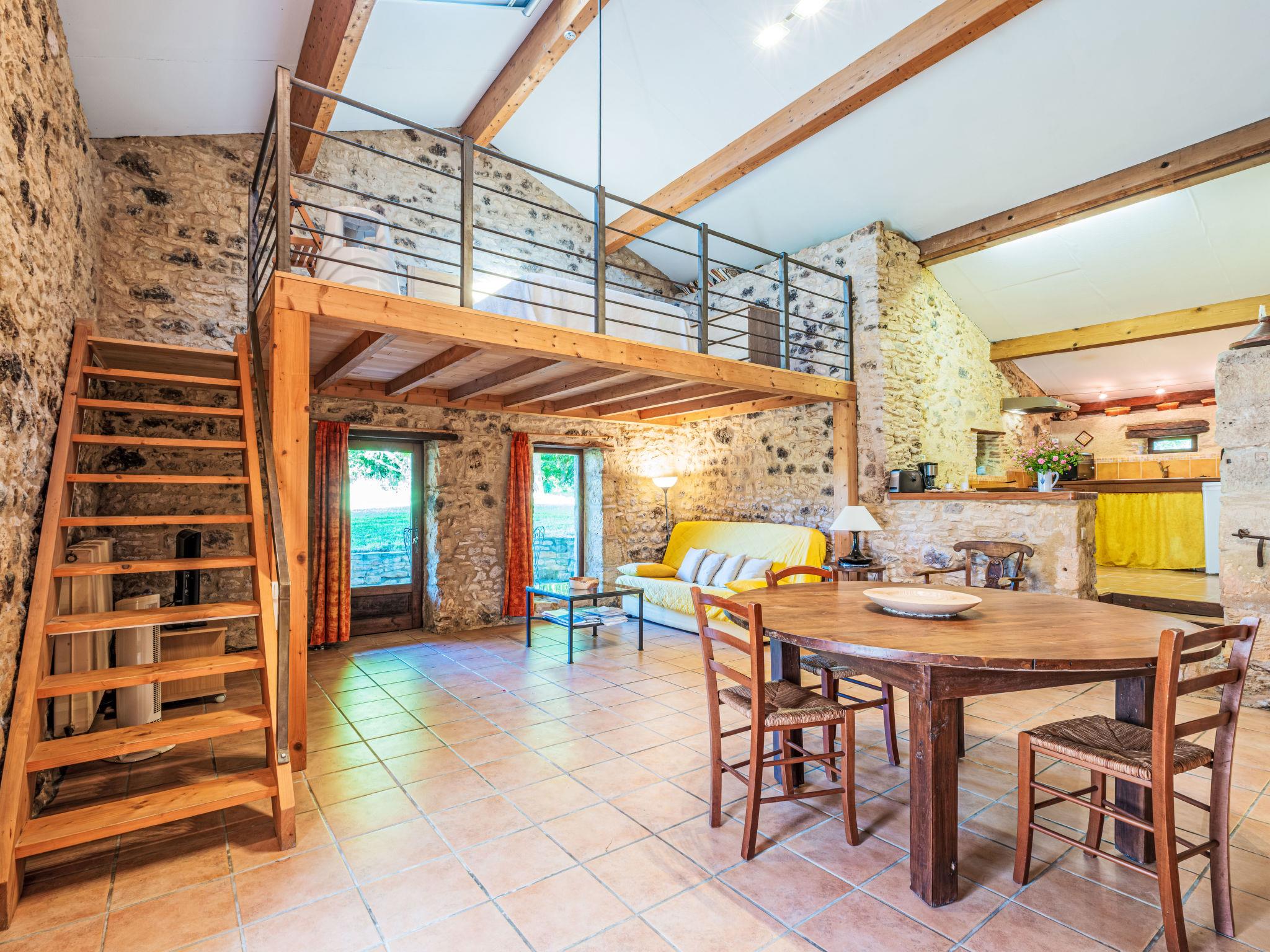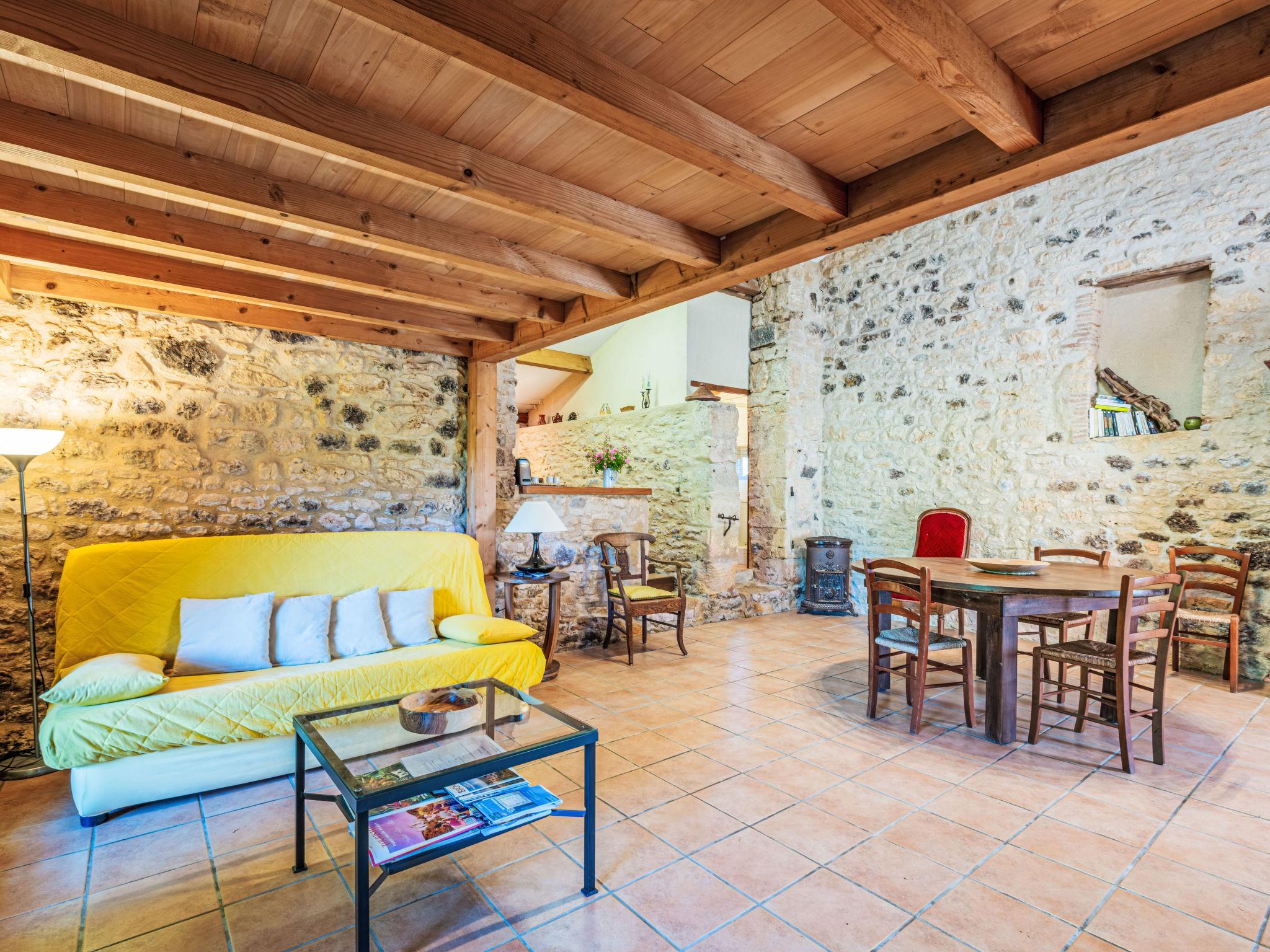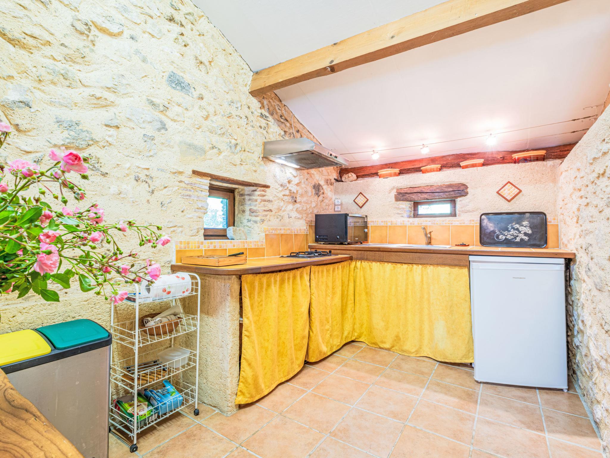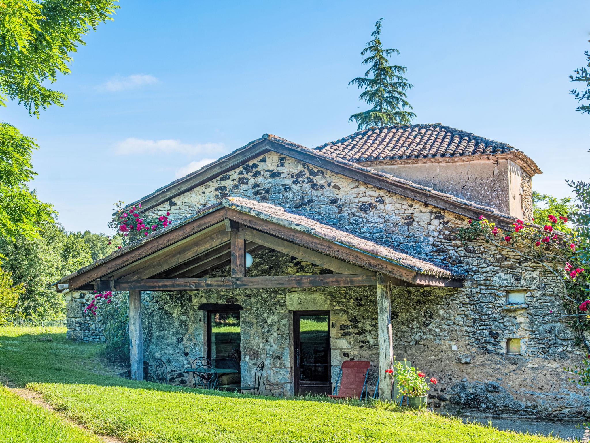 Farm estate "Gites de la Goujatte". Outside the resort, in a secluded, quiet position. For shared use: property, swimming pool (10 x 5 m, seasonal availability: 11.Apr. - 26.Sep.). Shower/WC in the pool area, parking (for 2 cars). Shop 8 km, supermarket 17 km, restaurant 4 km, bakery 10 km, bus stop 11 km, railway station 13 km. Golf course (18 hole) 22 km, riding stable 16 km. Nearby attractions: Villeneuve Sur Lot 22 km, Monflanquin 8 km, Puy-L'Evêque 29 km, Cahors 62 km, Bergerac 50 km, Sarlat 65 km. Please note: car recommended. Baby equipment on request (included). The owner does not accept any youth groups. The owner lives on the same property.