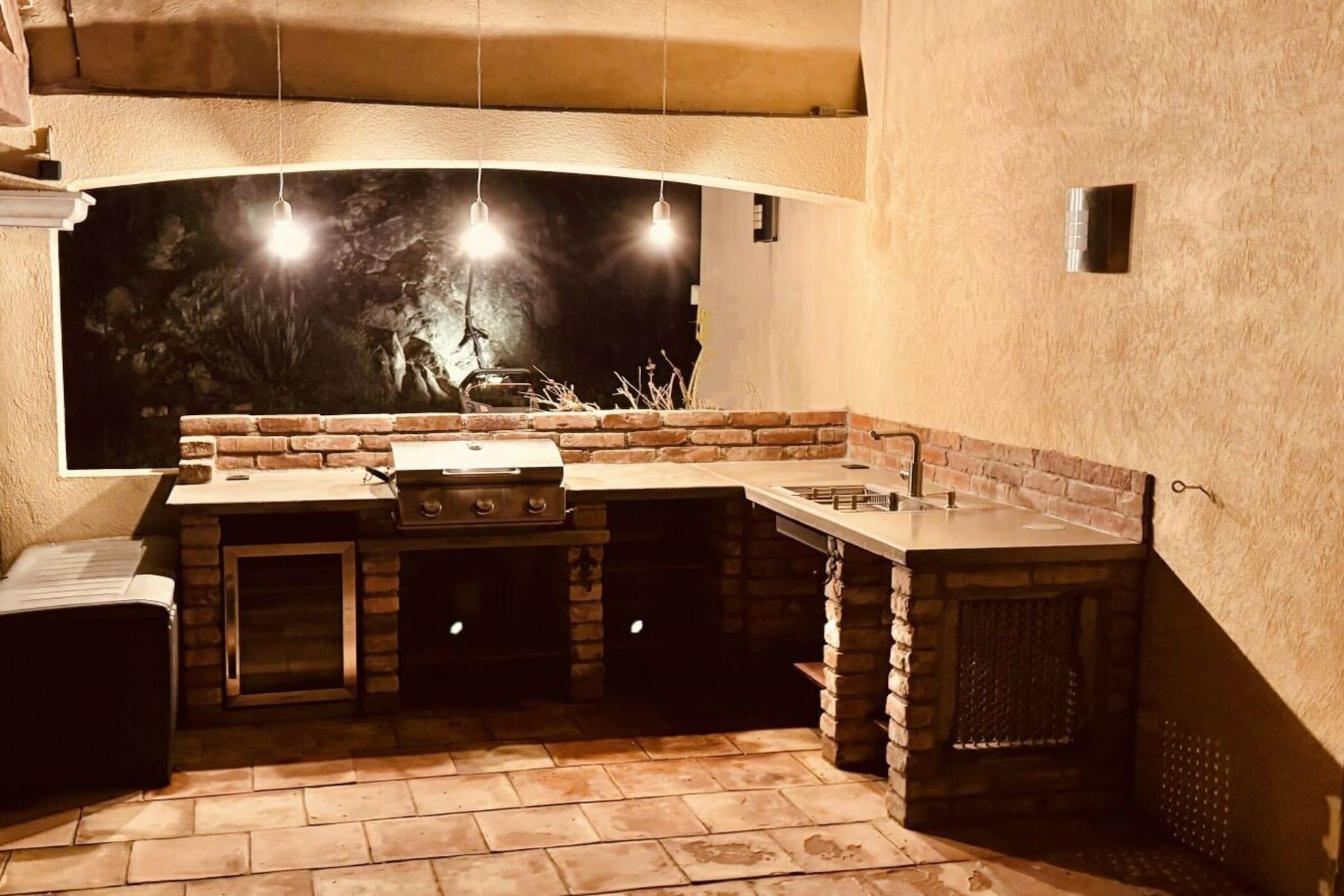Stueetage: (Køkken(, , tekøkken, Græsplæne, kakkelovn, elkedel, brødrister, komfur, kaffemaskine, ovn, mikrobølgeovn, opvaskemaskine , køleskab, fryser, varme, insektnet, Foodprocessor)) , , , , , gang(toilet, bruser, håndvask, varme), Stue(, bibliotek, Fjernsyn, Fjernsyn, pejs, DVD-afspiller, DVD-afspiller, radio, varme), spisestue(spisebord, varme), soveværelse(, , dobbeltseng, radio, varme, klimaanlæg), soveværelse(, , dobbeltseng, varme, klimaanlæg), soveværelse(, , dobbeltseng, Fjernsyn, varme, klimaanlæg), svalegang soveværelse, Børneværelse(, enkeltsovesofa, enkelthøjseng, tremmeseng, tremmeseng, varme, klimaanlæg, barneseng), badeværelse(, toilet, badekar, håndvask, varme), guest toilet(, toilet, håndvask), loungerum(sauna, bruser), veranda(havemøbler, solstole), Internetadgang, Internetadgang, Førstehjælp, vaskemaskine, varme, terrasse(, sauna, Bordtennis, havemøbler, solstole, swimmingpool), have(Græsplæne, grill, havemøbler, solstole, swimmingpool, barnestol), strygebræt, strygejern, tørreskab, Alarm, telefon,
