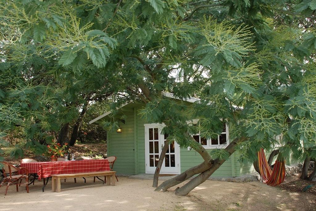 Hytten ligger omgivet af gamle egetræer og mimosaer i en mandelplantage. Den har plads til fire personer og kan prale af møbler af høj kvalitet. Ejendommen har også en gammel olivenmølle ved bækken og en økologisk cateringvirksomhed til de tidspunkter, hvor du ikke har lyst til at lave mad.