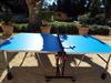 A ping-pong table and a basketball hoop for amateur players.
