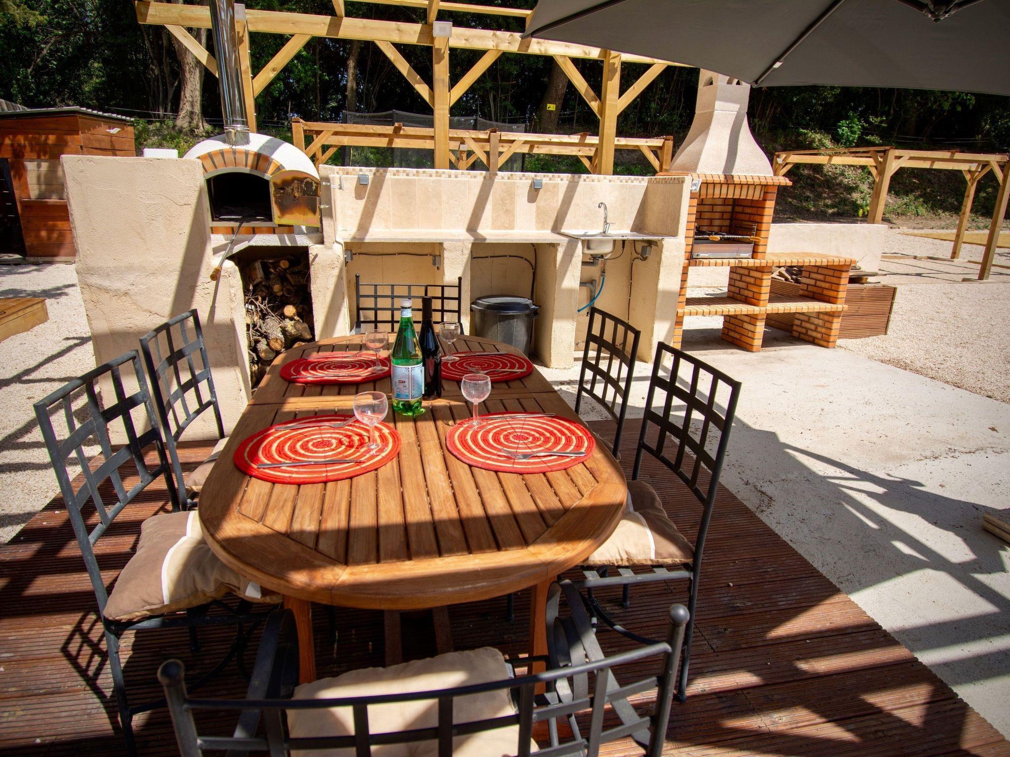 1 private terrace with barbecue, pizza oven, table and chairs, garden furniture and private fridge.