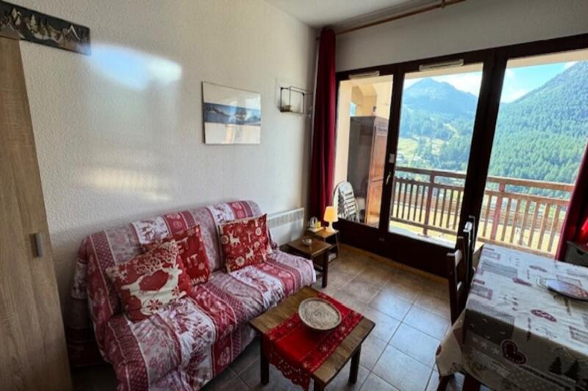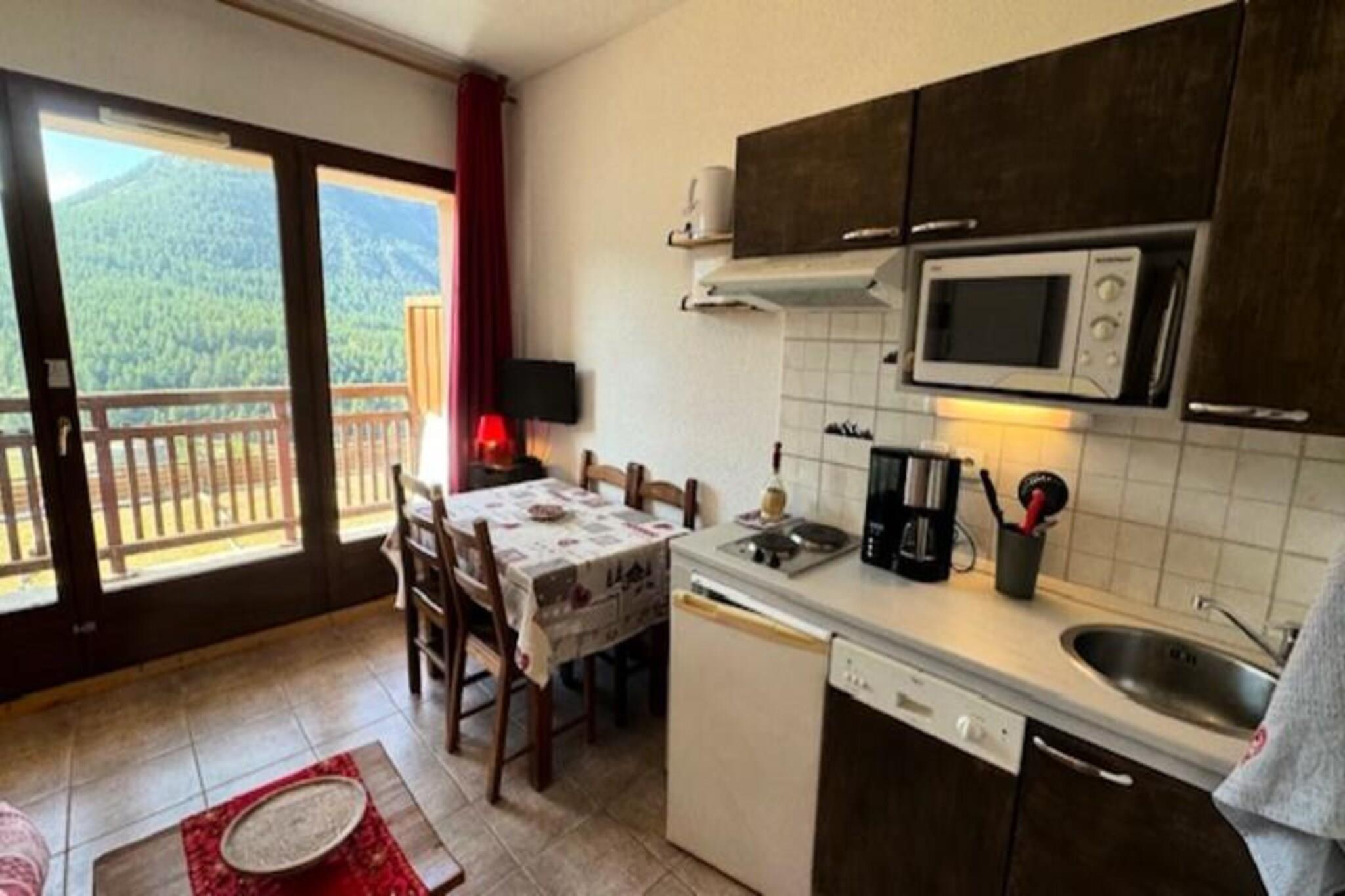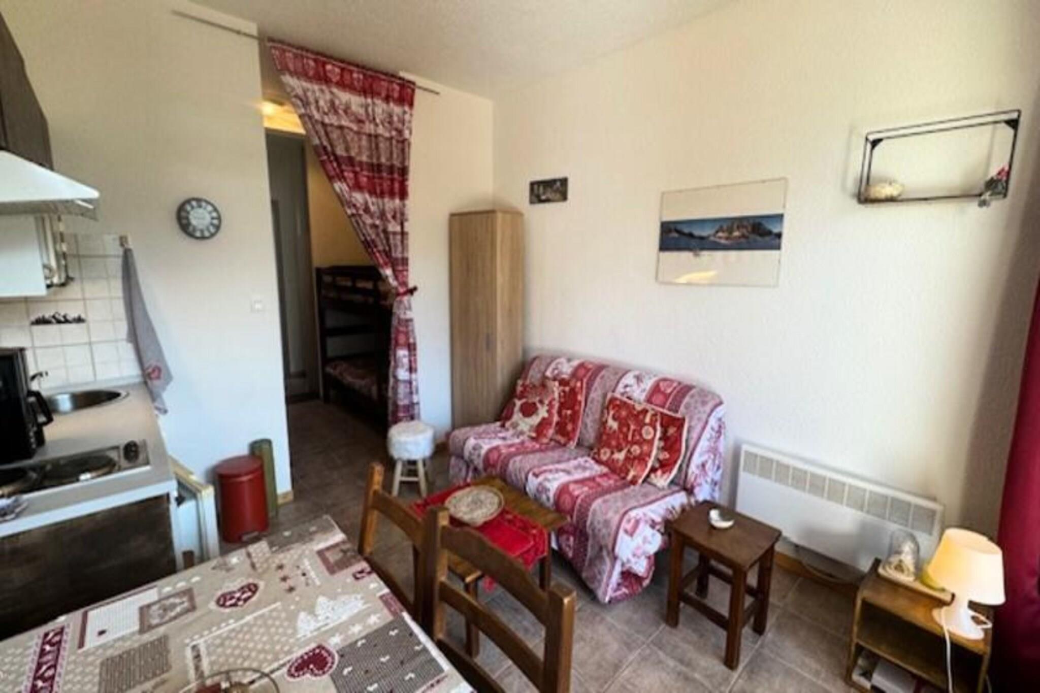 This cozy studio apartment for up to 4 people offers a comfortable stay with a convertible sofa and a mountain corner with bunk beds. The apartment is pet-friendly and located on the first floor, facing south with a stunning view of the surrounding mountains. The space includes essential amenities such as a wardrobe, cupboard, and clothes hooks for storage. A large parking lot is available for residents, and the property is non-smoking throughout. Conveniently located, the apartment provides easy access to local attractions, including the ESF & Club Piou Piou ski schools and slopes, just 800 meters away. A free ski bus service is available from the residence, offering easy transport to the slopes and the nearby Durancia Nuxe Aquatic Center and Spa, 1.5 km away. Additional amenities like a pharmacy, bus station, and various shops and restaurants are located within an 800-meter radius, ensuring everything you need is close by. The apartment features a well-equipped kitchen with two ceramic hobs, a microwave, refrigerator, dishwasher, and a coffee maker. The bathroom includes a shower cabin, WC, sink, bidet, and towel rack. A private balcony with a drying rack, small table, and chairs offers a peaceful spot to enjoy the fresh air. Services such as Wi-Fi, ski passes, and baby equipment can be arranged for an added convenience during your stay.