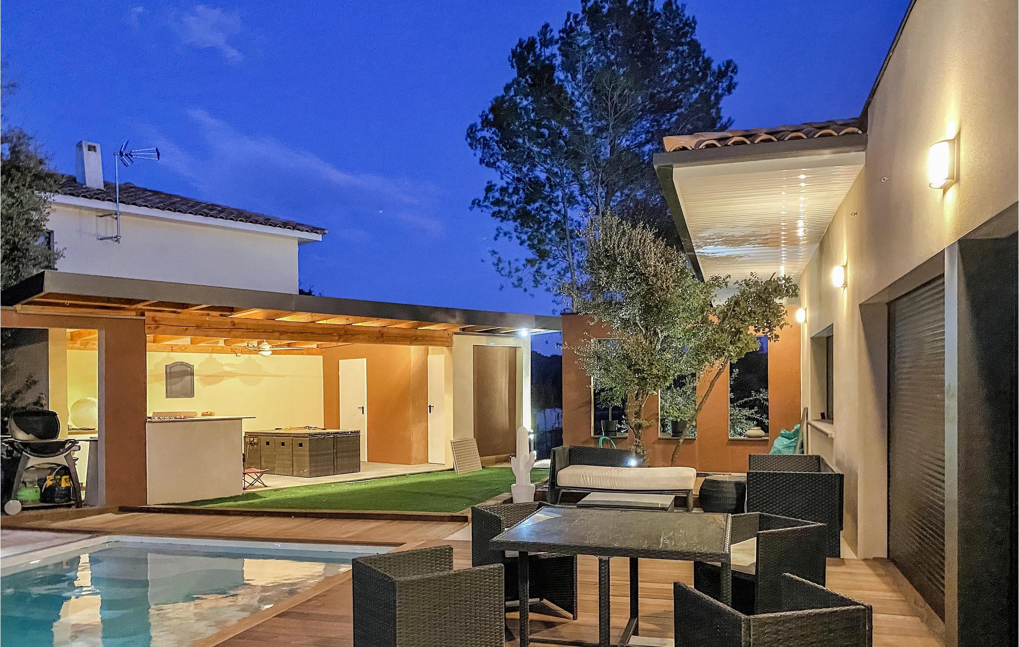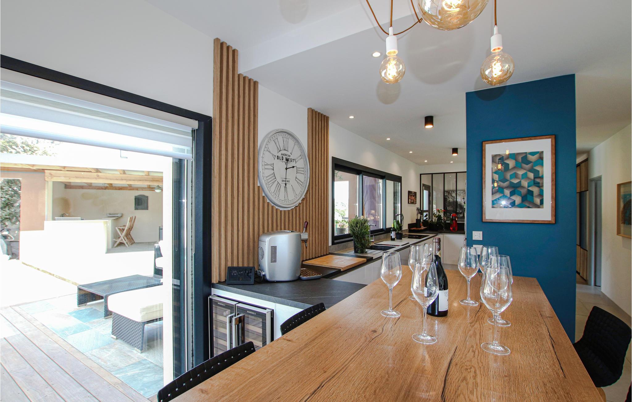 Ved porten til den kreative og attraktive metropol Montpellier inviterer dette komfortable feriehus jer til at tilbringe jeres drømmeferie. Husets rummelige interiør er lavet af smukke materialer, er meget lyst og byder på stor komfort med sin pæne og raffinerede indretning. Den smukke stue og det amerikanske køkken åbner helt ud til det udendørs område og tilbyder jer det perfekte sted at mødes for at lege, slappe af og lave mad sammen.