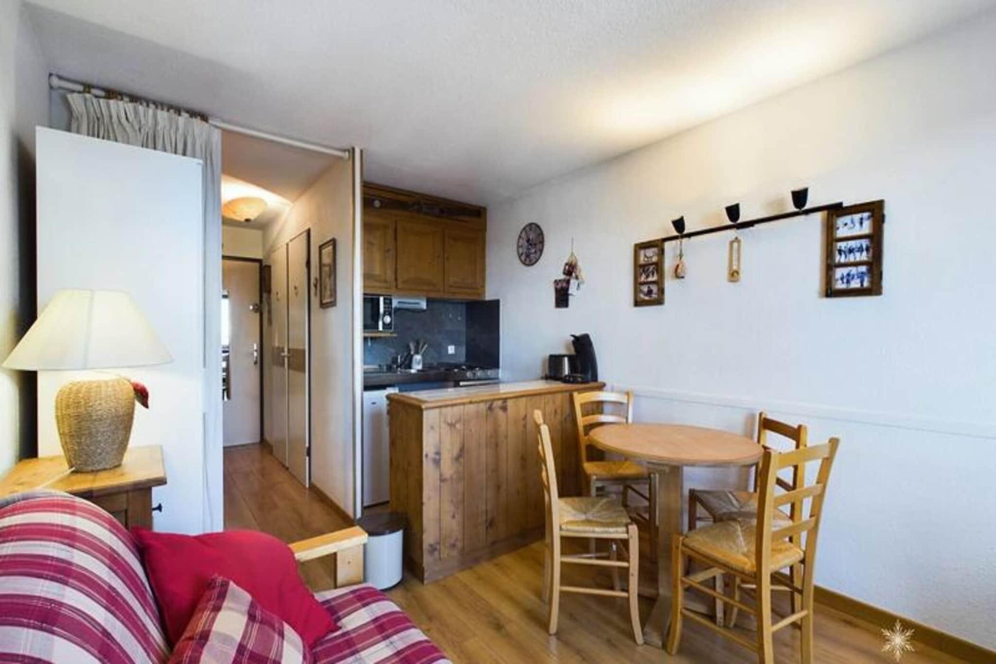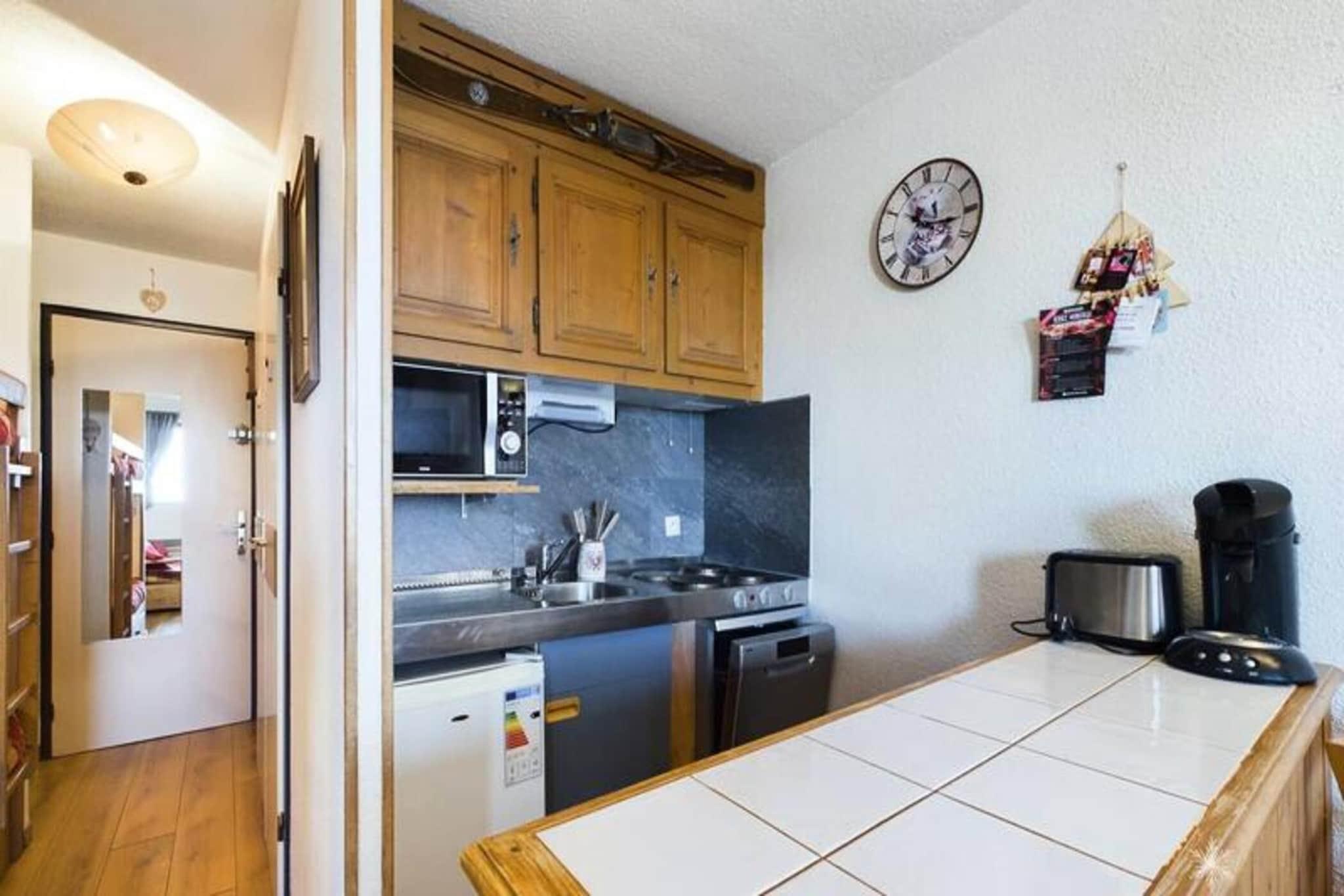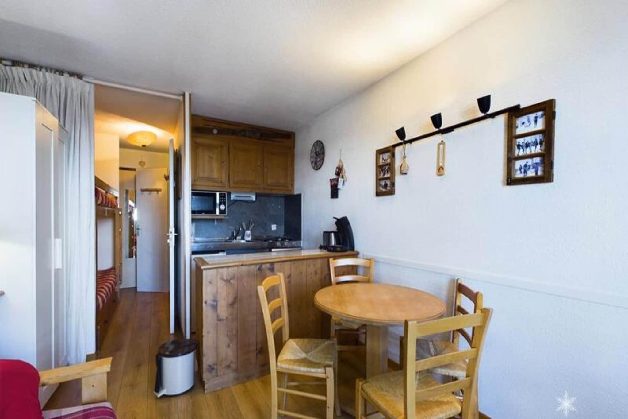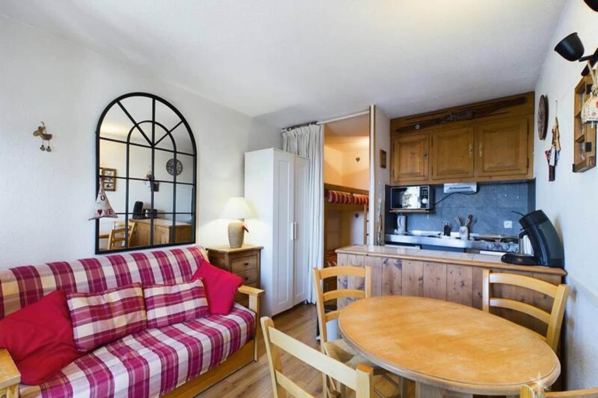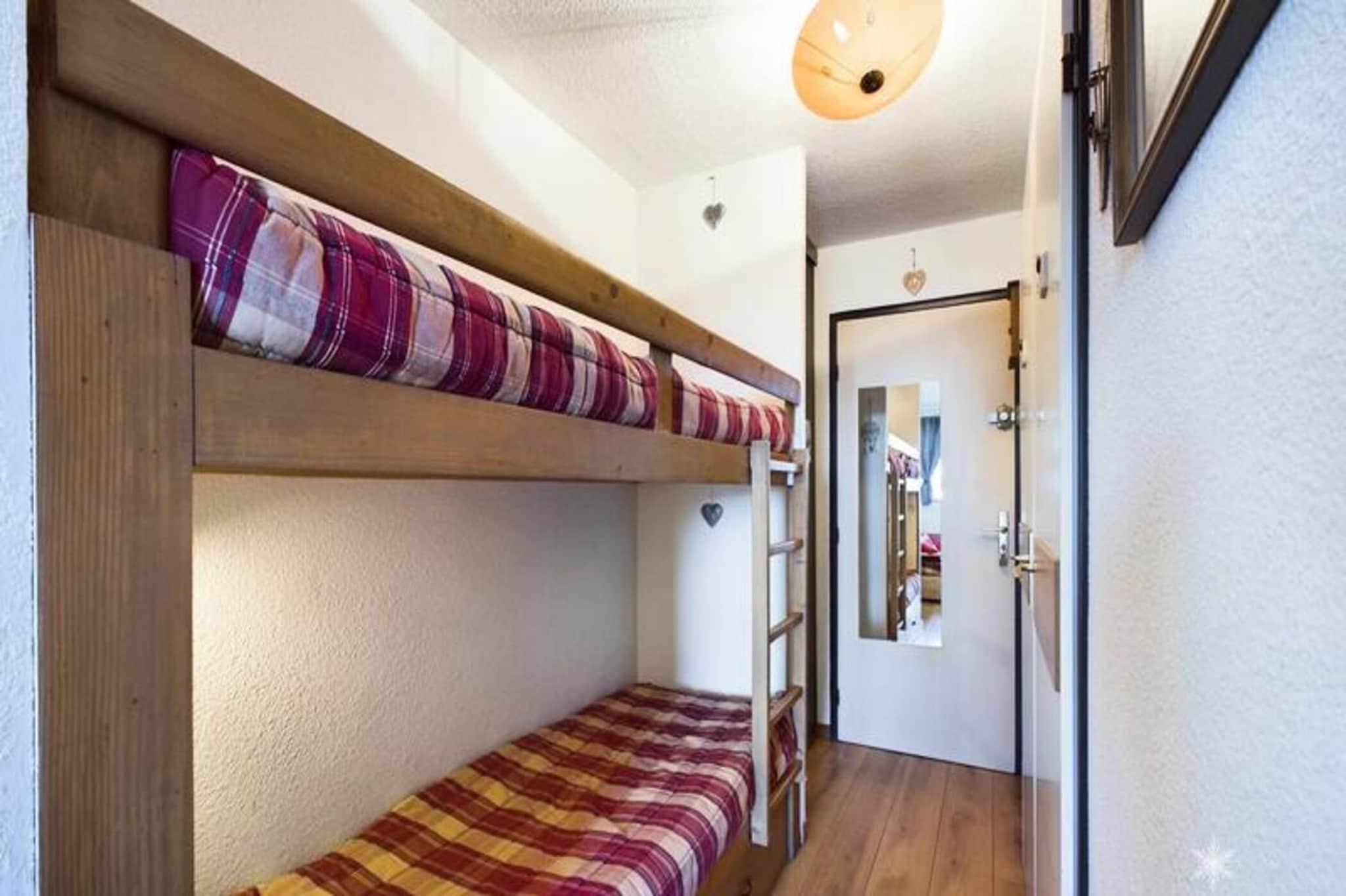 Denne hyggelige studiolejlighed, beliggende på anden sal, er designet til 4 personer. Det inkluderer to køjesenge adskilt af et gardin i indgangspartiet og en sovesofa i stuen til to. Ejendommen er ideel til små familier eller venner på udkig efter et funktionelt rum. Lejligheden byder desuden på en smuk udsigt over dalen og en sydvendt altan, perfekt til at nyde omgivelserne. Varme og tv er inkluderet, selvom lagner og håndklæder er tilgængelige mod et ekstra gebyr. Boligen er ideelt beliggende kun 200 meter fra lokale butikker og 50 meter fra børnepasningscenteret, hvilket gør det bekvemt for familier. For friluftsentusiaster er pisterne ved foden af ??ejendommen, og de giver direkte adgang til skiløb og andre aktiviteter. Placeringen giver nem adgang til både vintersport og landsbyfaciliteter, hvilket sikrer et godt ophold. Indvendigt har lejligheden et fuldt udstyret tekøkken med 3 elektriske kogeplader, et køleskab, en kombineret mikrobølgeovn og en opvaskemaskine, så gæsterne kan tilberede deres måltider komfortabelt. Badeværelset og separat toilet giver ekstra bekvemmelighed, hvilket sikrer et behageligt og funktionelt ophold for alle gæster.