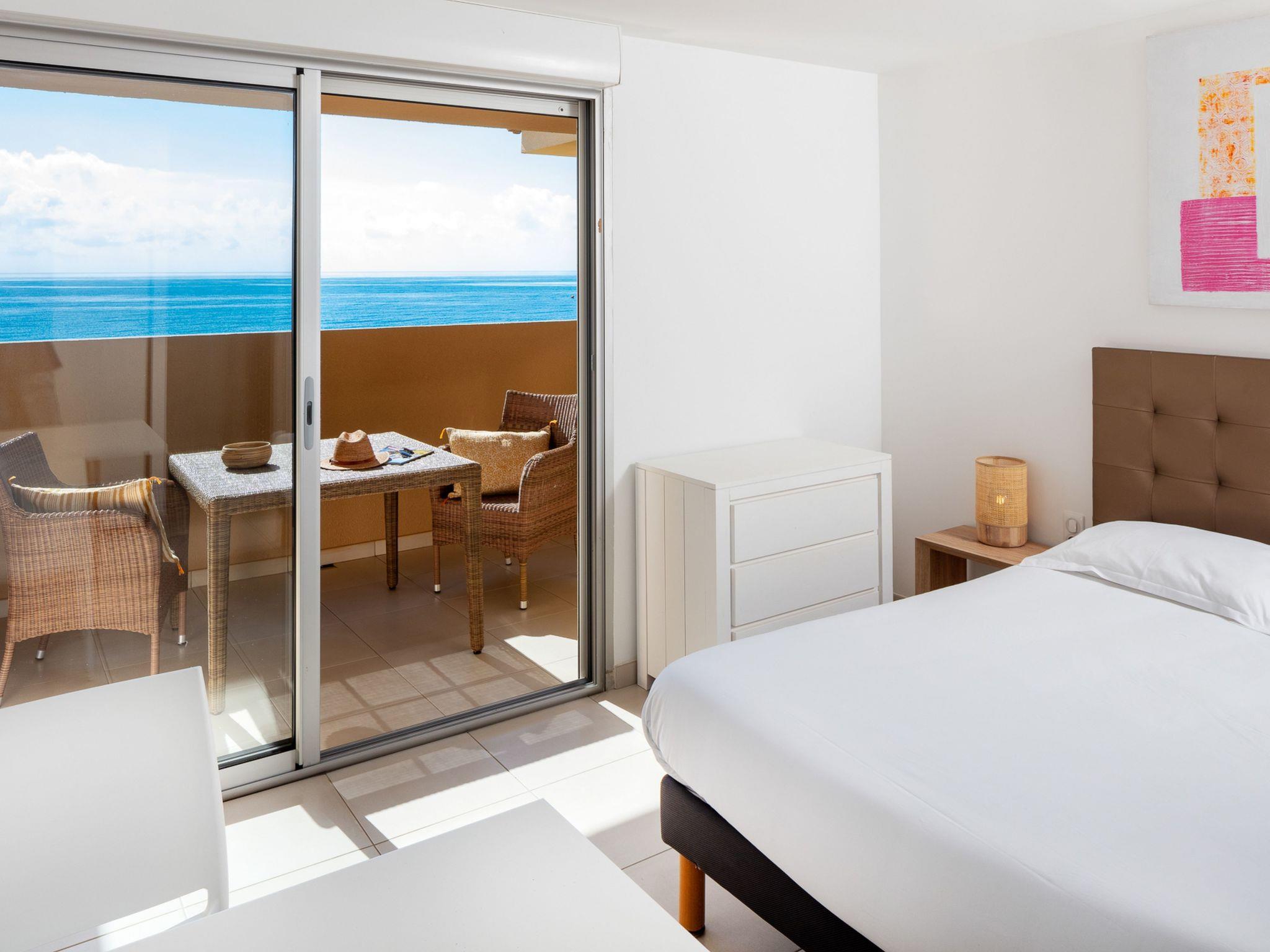 "MB2 vue mer", 1-room apartment 20 m2. Bright, renovated in 2017, practical furnishings: living/sleeping room with 1 double bed, dining table and satellite TV. Kitchenette (2 ceramic glass hob hotplates, microwave, freezer, electric coffee machine). Shower/WC. Electric heating, air-conditioning. View of the sea. Please note: suitable for families. Non-smokers only. Maximum 1 pet/ dog allowed. Smoke alarm. Offer by a commercial proprietor according to Art. 155, IV, CGI