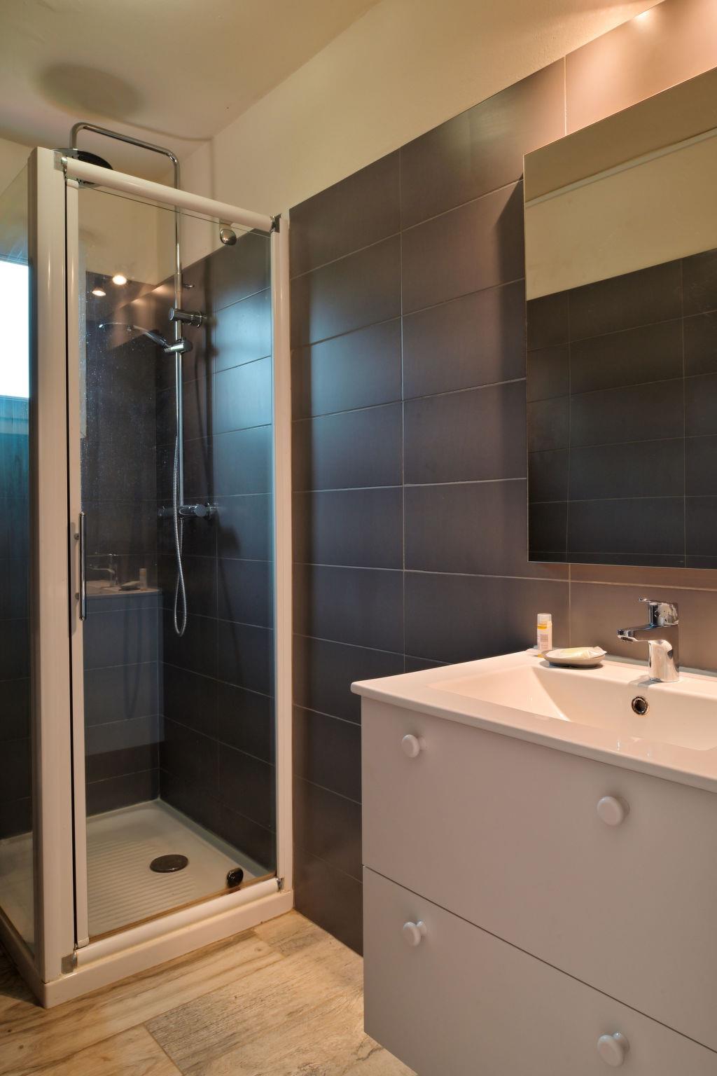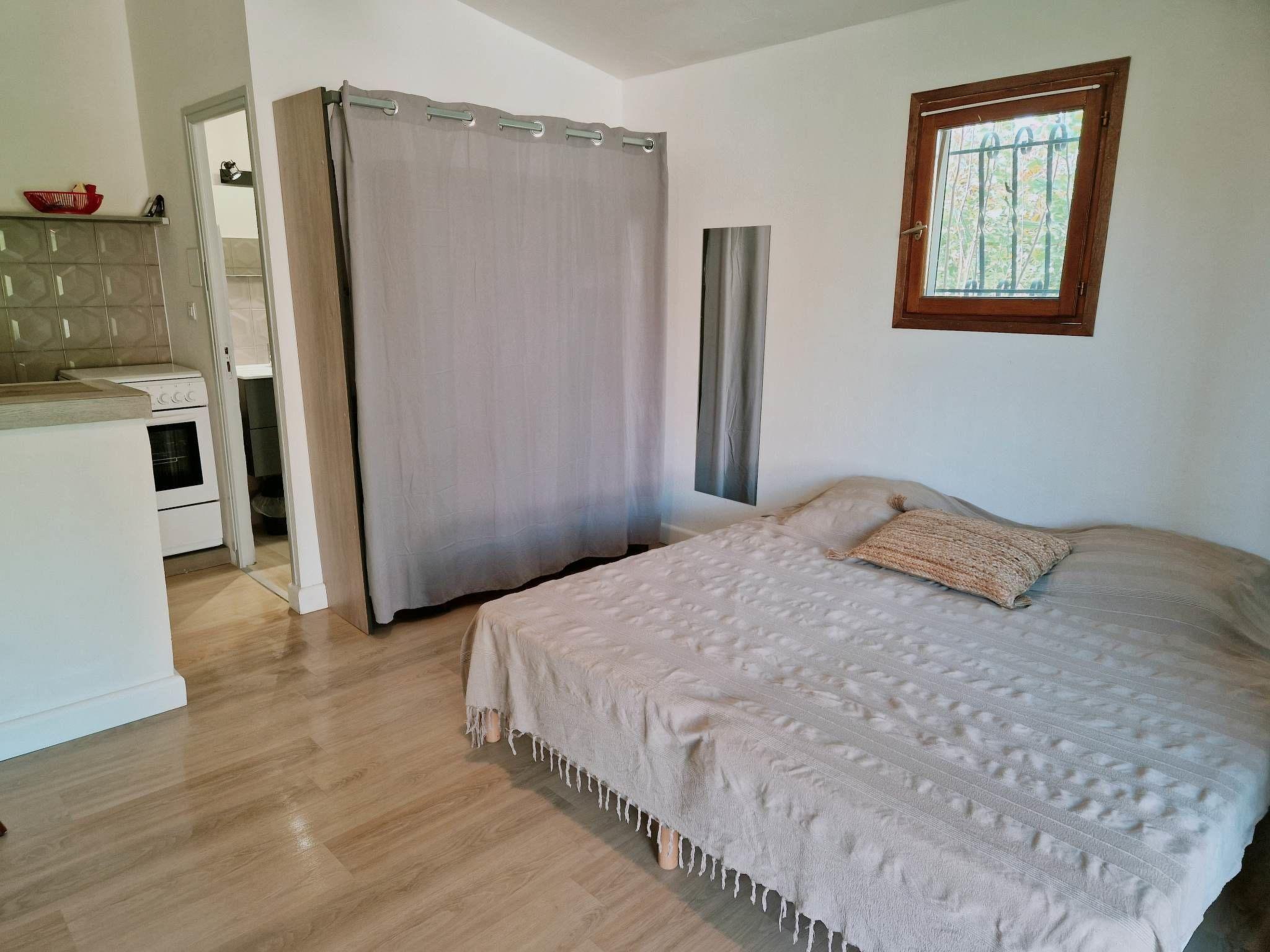 "Studio 2 personnes", 1-room studio 24 m2. Practical and comfortable furnishings: living/sleeping room with 2 beds (90 cm, length 190 cm), electric heating and air conditioning. Exit to the garden, to the terrace. Kitchenette (oven, 2 gas rings, toaster, kettle, microwave, electric coffee machine) with dining table. Shower/WC. Terrace. Terrace furniture, barbecue. Facilities: mosquito net. Internet (WiFi). Parking. Please note: maximum 1 pet/ dog allowed. Smoke alarm. Offer by a commercial proprietor according to Art. 155, IV, CGI
