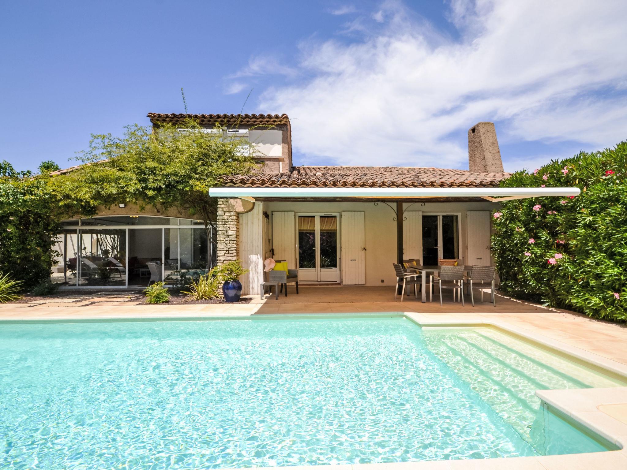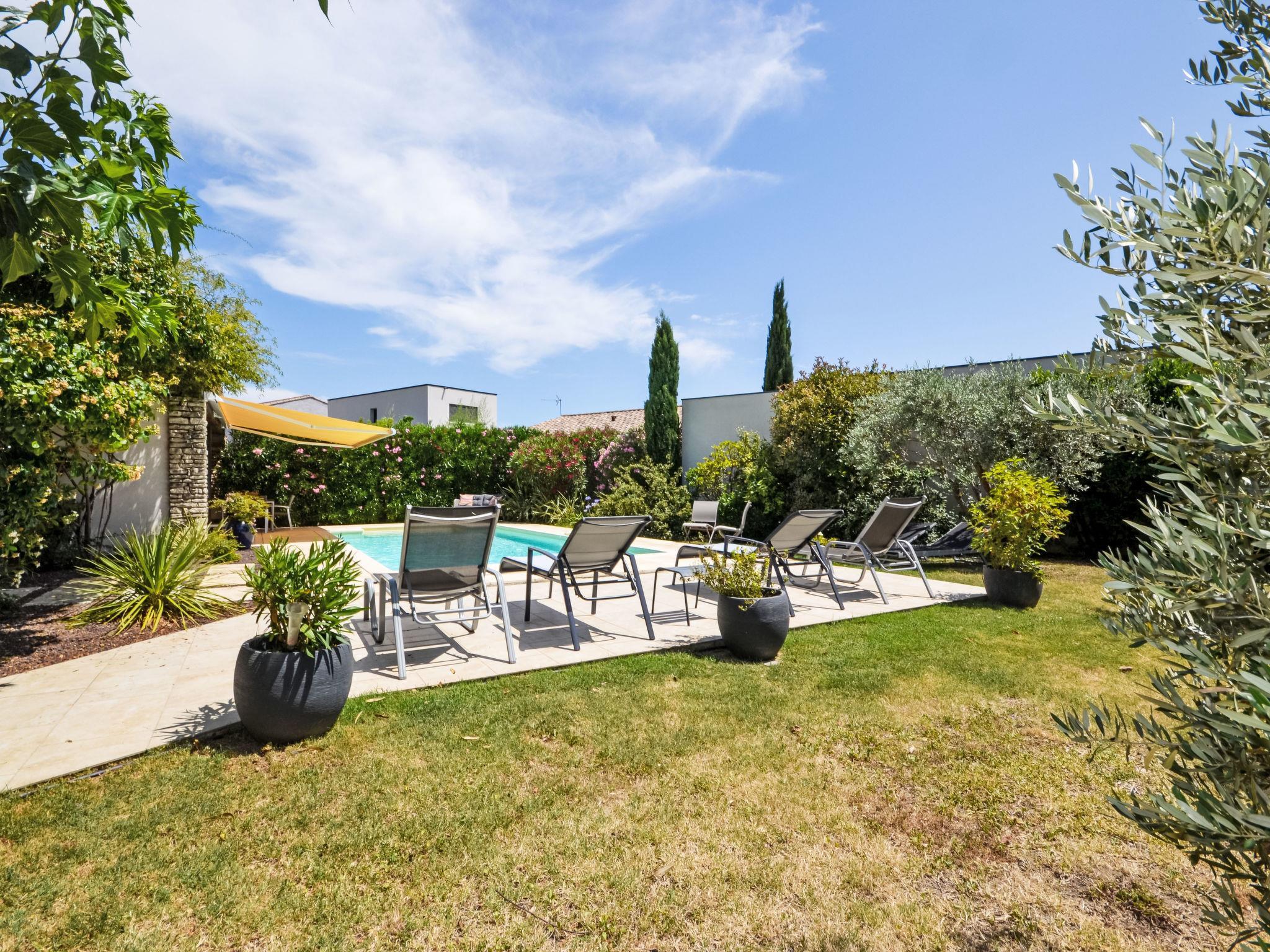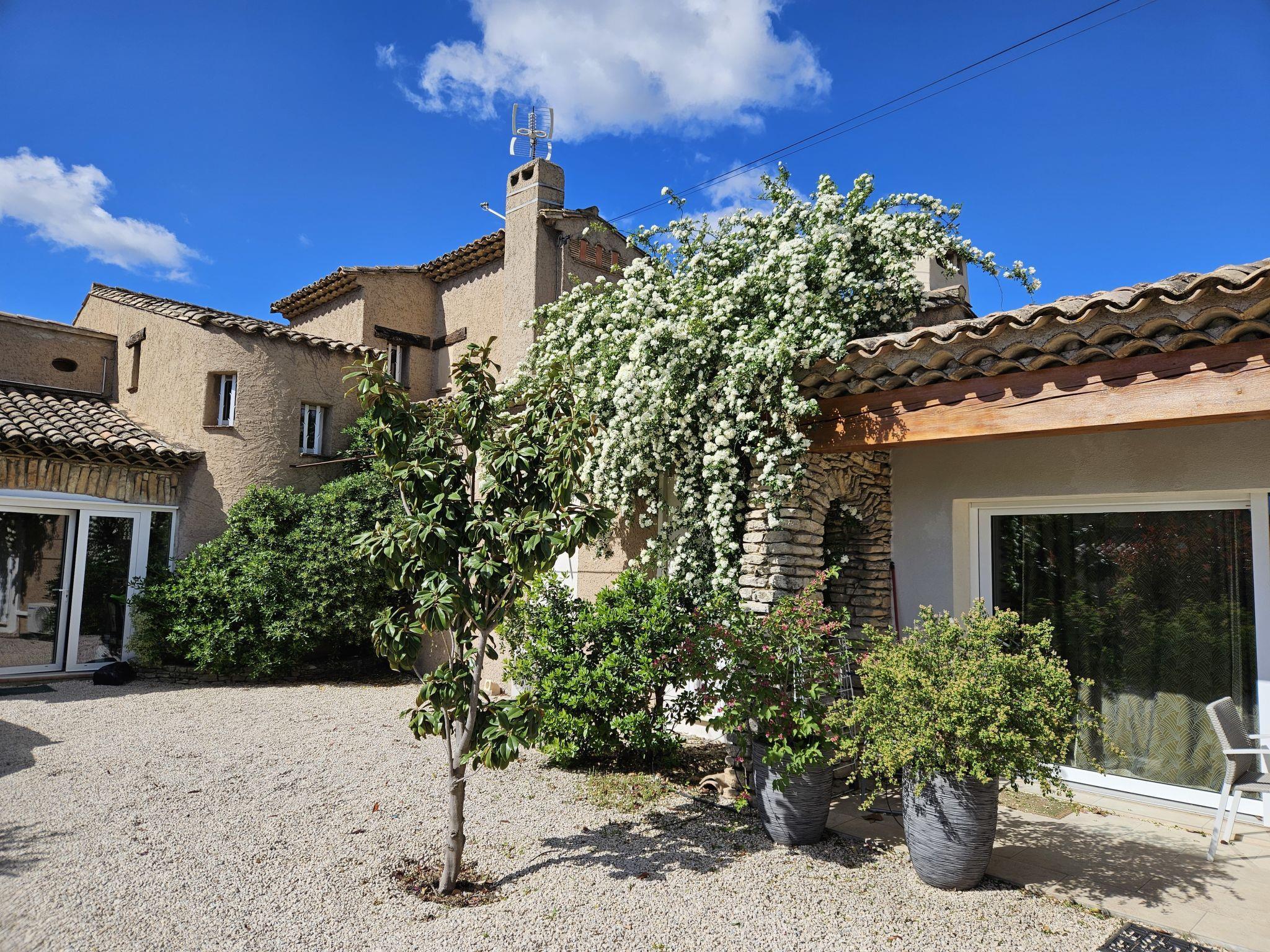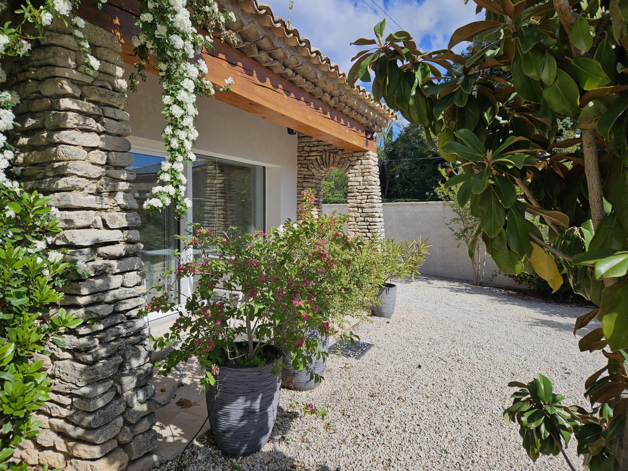 Beautiful villa "Les Angevines", renovated in 2025. In the resort 800 m from the centre of de Morières-les-Avignon, in a quiet position residential area (villas). Private: well-kept garden 1'170 m2 (fenced) with lawn and trees, swimming pool (4 x 8 m, depth 120 - 160 cm, seasonal availability: 12.Apr. - 25.Oct.) with internal staircase and alarm system. Terrace, garden furniture, barbecue, barbecue house, pool maintenance by the owner/gardener. Parking (for 3 cars) on the premises. Shop, grocery 800 m, supermarket 3.1 km, restaurant, bakery 500 m, bicycle rental 3.9 km, 5 minute walk to the centre, bus stop "Salvador" 700 m, railway station "Avignon TGV" 15 km, sandy beach 102 km. Golf course (18 hole) 400 m, tennis 50 m, riding stable 5.4 km, sports centre 50 m, children's playground 3.9 km. Nearby attractions: Avignon 10 km, L'Isle-sur-la-Sorgue 17 km, Gordes 33 km, Saint Rémy de Provence 23 km, Châteaurenard 14 km, Aéroport d'Avignon 5 km. Hiking paths: Parc Régional des Alpilles 30 km, Parc Régional du Luberon 21 km, Mont Ventoux 31 km. Please note: not suitable for small children. Not suitable for children under 6 years. The owner does not accept any youth groups. Residence with electric gates. Available: veranda, 30 m², with dining table.