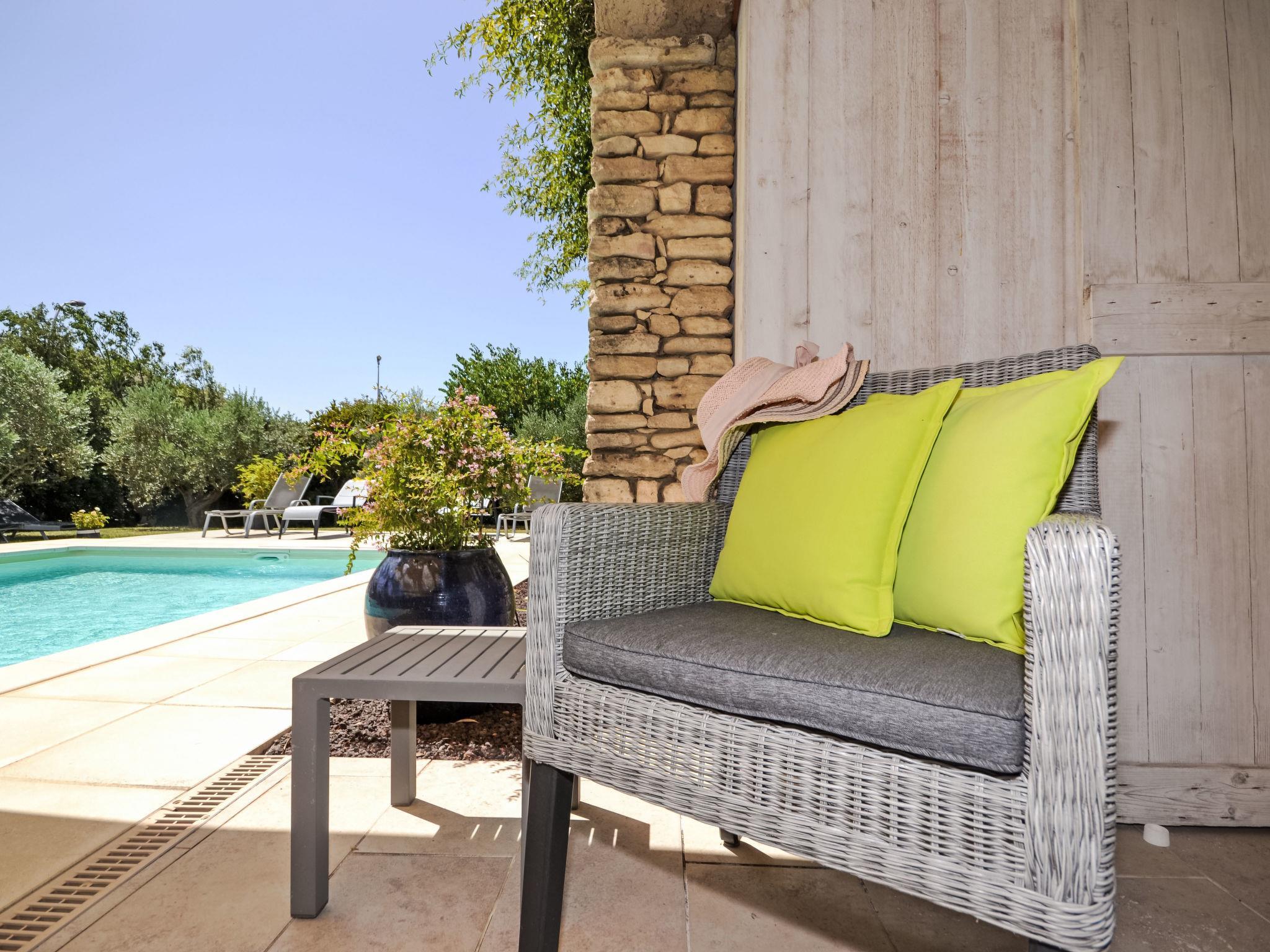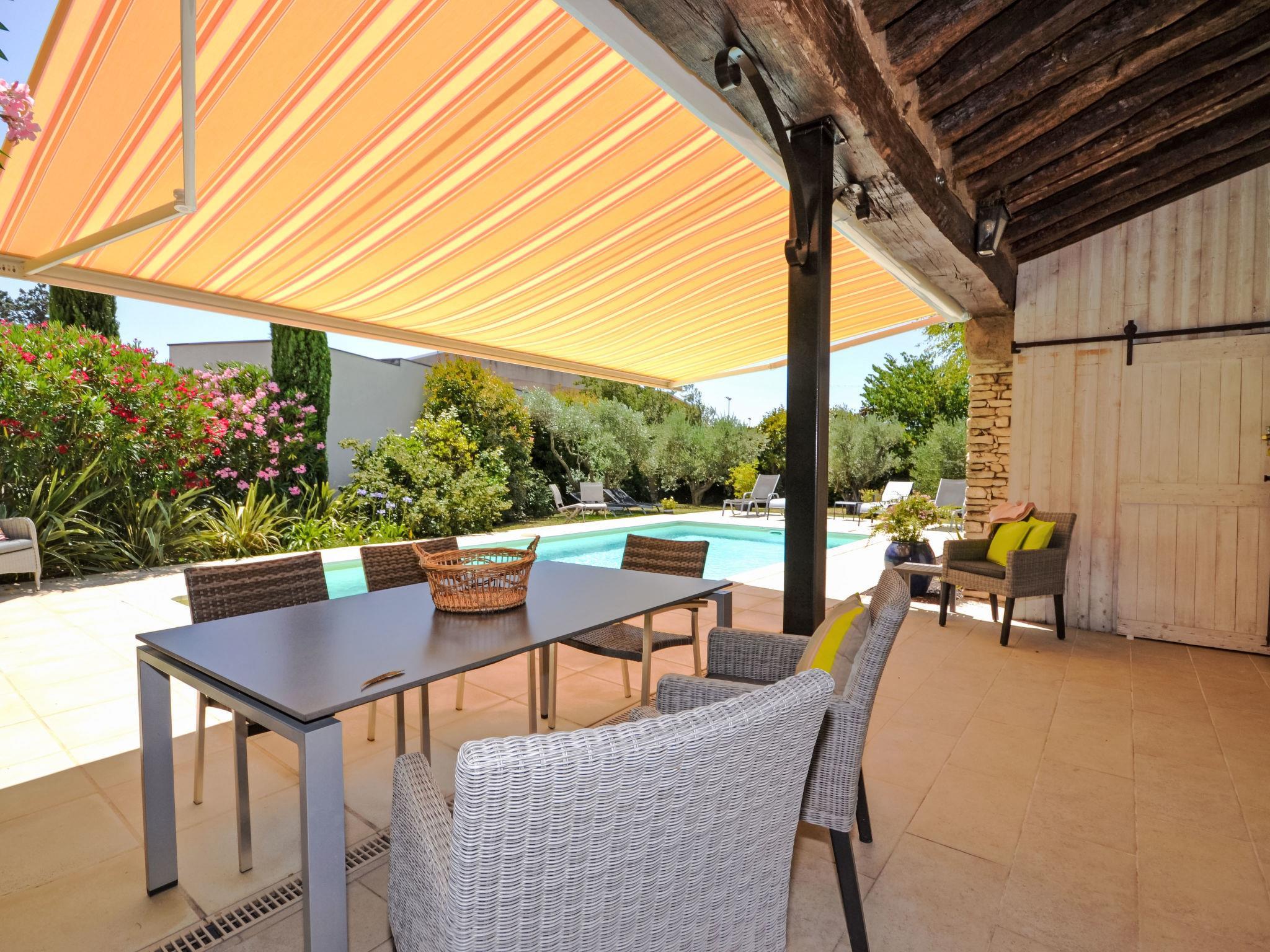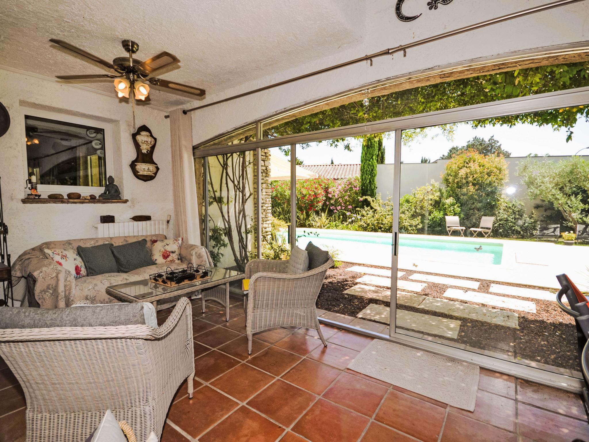 Beautiful villa "Les Angevines", renovated in 2025. In the resort 800 m from the centre of de Morières-les-Avignon, in a quiet position residential area (villas). Private: well-kept garden 1'170 m2 (fenced) with lawn and trees, swimming pool (4 x 8 m, depth 120 - 160 cm, seasonal availability: 12.Apr. - 25.Oct.) with internal staircase and alarm system. Terrace, garden furniture, barbecue, barbecue house, pool maintenance by the owner/gardener. Parking (for 3 cars) on the premises. Shop, grocery 800 m, supermarket 3.1 km, restaurant, bakery 500 m, bicycle rental 3.9 km, 5 minute walk to the centre, bus stop "Salvador" 700 m, railway station "Avignon TGV" 15 km, sandy beach 102 km. Golf course (18 hole) 400 m, tennis 50 m, riding stable 5.4 km, sports centre 50 m, children's playground 3.9 km. Nearby attractions: Avignon 10 km, L'Isle-sur-la-Sorgue 17 km, Gordes 33 km, Saint Rémy de Provence 23 km, Châteaurenard 14 km, Aéroport d'Avignon 5 km. Hiking paths: Parc Régional des Alpilles 30 km, Parc Régional du Luberon 21 km, Mont Ventoux 31 km. Please note: not suitable for small children. Not suitable for children under 6 years. The owner does not accept any youth groups. Residence with electric gates. Available: veranda, 30 m², with dining table.
