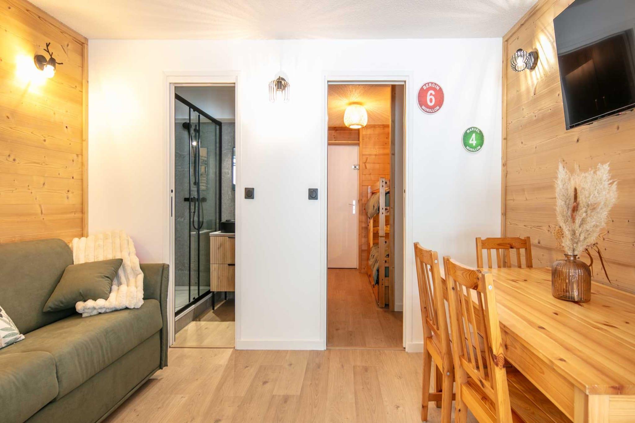 Forestil dig at træde ind i dit eget private bjergparadis, hvor den friske alpine luft i Morillon hilser dig velkommen i det øjeblik, du åbner balkondørene. Denne lejlighed på 27 m² er designet til at være den perfekte base for dine eventyr i højden og tilbyder et varmt og indbydende rum til op til seks rejsende. Efter en dag med at udforske bjergtoppene kan du trække dig tilbage til et hjem, der er helt dit eget, med et hyggeligt separat soveværelse med en dobbeltseng og en alsidig opholdsstue udstyret med både en køjeseng og en sovesofa - perfekt til at hvile dig inden endnu en dag på stierne. Dine morgener her begynder med den stille summen fra kaffemaskinen, mens du tilbereder morgenmad i det fuldt udstyrede køkken. Uanset om du rister frisk brød eller laver et solidt måltid med ovnen og moderne køkkenudstyr, har du alt, hvad du behøver for at give din gruppe energi til dagen. Den private balkon tilbyder et fredeligt sted at tjekke vejret over bjergene eller blot nyde en stille kop te, inden du tager afsted. Med et moderne badeværelse med et forfriskende brusebad føles rummet funktionelt og friskt, hvilket sikrer et behageligt ophold fra start til slut. Den sande magi ved denne beliggenhed ligger lige uden for døren. Du er perfekt placeret til den ultimative ski-in, ski-out-livsstil, blot 50 meter fra Les Esserts-skiliften og en kort gåtur fra Sairon-liften. Når solen går ned, og skiene er pakket væk, er den lokale landsbycharme kun få skridt væk. Gå 20 meter til The Oak Barrel Pub for en festlig drink, eller udforsk de nærliggende restauranter for at prøve lokale Savoyard-smage.
