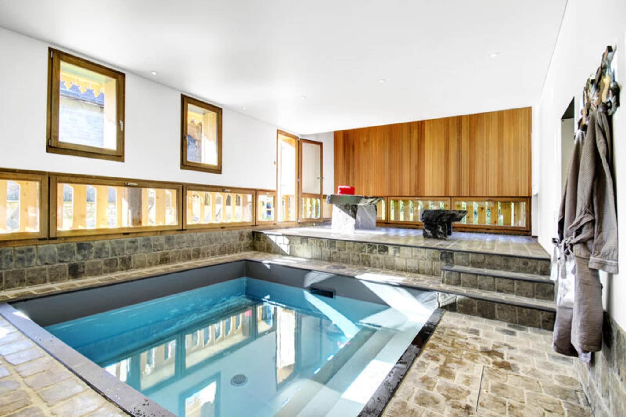 Ejendommen tilbyder sammen med sine luksuriøse faciliteter et enestående ophold for op til 14 personer. Denne 5-stjernede Savoyard-villa, der dateres tilbage til 1826 og dygtigt renoveret, kombinerer traditionel indretning med moderne teknologi. Villaen har et opholdsrum i katedralstil med panoramaudsigt, en central pejs og et hjemmebiografområde. Sovepladser omfatter flere soveværelser med eget bad, et separat uafhængigt studie og sovepladser i alkovestil under rammen. Villaen har også et lydisoleret billardrum, et swimmingpoolområde med massagebænke og en rummelig garage til op til to biler. Kæledyr er ikke tilladt, og boligen inkluderer tjenester såsom slutrengøring og sengetøj. For yderligere bekvemmelighed kan gæsterne få adgang til tjenester som leje af skiudstyr, lufthavnstransport eller endda hjemmekok-muligheder, som kan reserveres efter anmodning. Beliggende i hjertet af Portes du Soleil, det største skiområde i Europa, giver denne villa direkte adgang til både vinter- og sommeraktiviteter. Morzine, et "Famille Plus"-certificeret feriested, tilbyder en ideel destination for både familier og eventyrlystne. Gæsterne kan nyde 286 skiløjper, vandrestier, mountainbiking og meget mere. Om sommeren bliver regionen et knudepunkt for udendørs aktiviteter såsom rafting, canyoning og stand-up paddleboarding på Lake Montriond. Det nærliggende bageri og shuttlestoppested gør det nemt at få adgang til yderligere lokale attraktioner. Gæster kan også drage fordel af fordelagtige priser gennem Multipass, et pas, der giver adgang til forskellige aktiviteter på tværs af området, hvilket giver en altomfattende oplevelse. Villaens køkken er en gourmets drøm, og byder på et stort, fuldt udstyret køkken med et barområde og et designer-spisebord. Rummet er perfekt til at forberede og nyde måltider med familie eller venner. Ejendommen omfatter også moderne bekvemmeligheder såsom et lydisoleret billardrum, en opvarmet swimmingpool og et separat skirum for nemheds skyld. Til udendørs afslapning er der en rummelig terrasse og balkon med siddepladser til rådighed, som tilbyder naturskøn udsigt over bjergene. Med sit omhyggeligt kurerede design og overlegne faciliteter tilbyder villaen en perfekt balance mellem afslapning og eventyr, uanset om man nyder vinterpisterne eller sommervandreture.