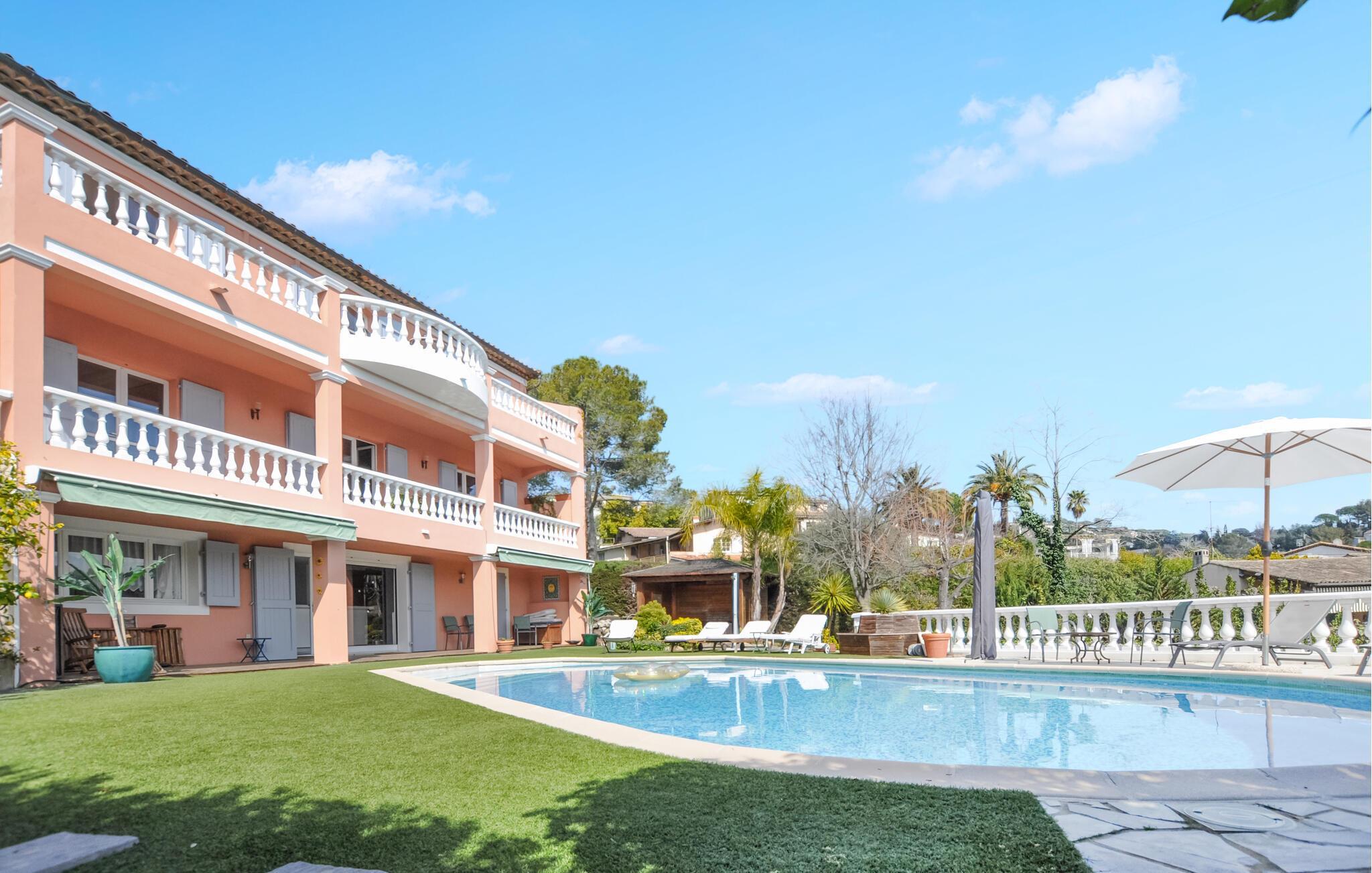 Hvis I er på udkig efter en bolig til den store familie, og hvis I ikke går af vejen for lidt overdådig luksus, er denne rummelige villa i Mougins et fremragende valg. Huset ligger i skønne omgivelser i baglandet til den franske riviera, og så er det indrettet med al den komfort, I kunne tænke jer. Indretningen fremtræder moderne og stilsikkert med et komfortabelt møblement, som gør det nemt at sænke skuldrene og hvile stængerne efter en aktiv feriedag.