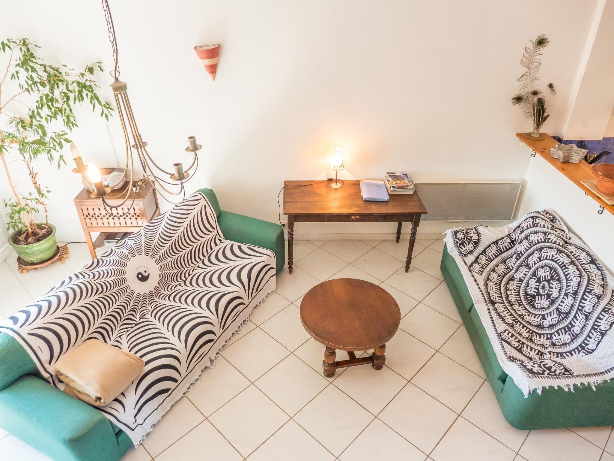 This charming gîte is located on a working wine estate in Murviel les Béziers. This large property, part of which has been converted into 2 adjoining gîtes, is set in a calm and peaceful environment surrounded by vineyards and olive groves. It's the perfect place to relax and unwind, an invitation to immerse yourself in the heart of nature, with plenty of opportunities for walks, particularly in the nearby Parc Régional du Haut Languedoc, renowned for its hiking trails. There's also a white-water sports centre nearby. And if you're a history buff, all you have to do is venture into the surrounding medieval villages, renowned for their circulades. This 72 m² gîte sleeps 4 comfortably, with a private terrace facing the setting sun. The views over the surrounding countryside are exceptional. The swimming pool area, to be shared, is in a peaceful setting, just a few dozen metres from the gîte and surrounded by nature. It has an American beach, ideal for small children with 0.20m of water. The gîte has been tastefully decorated. The combination of noble building materials and the warmth of the chosen colours gives it a great deal of charm, character and conviviality. Ground floor: large 35 m² living room with lounge, dining area and open-plan kitchen. 1st floor: 1 bedroom with 160cm bed, 1 bedroom with 2 single beds and shower room with WC. Uninterrupted view of the surrounding hills. Not overlooked by the other adjoining gîte. 1 pet allowed. The owner speaks English.