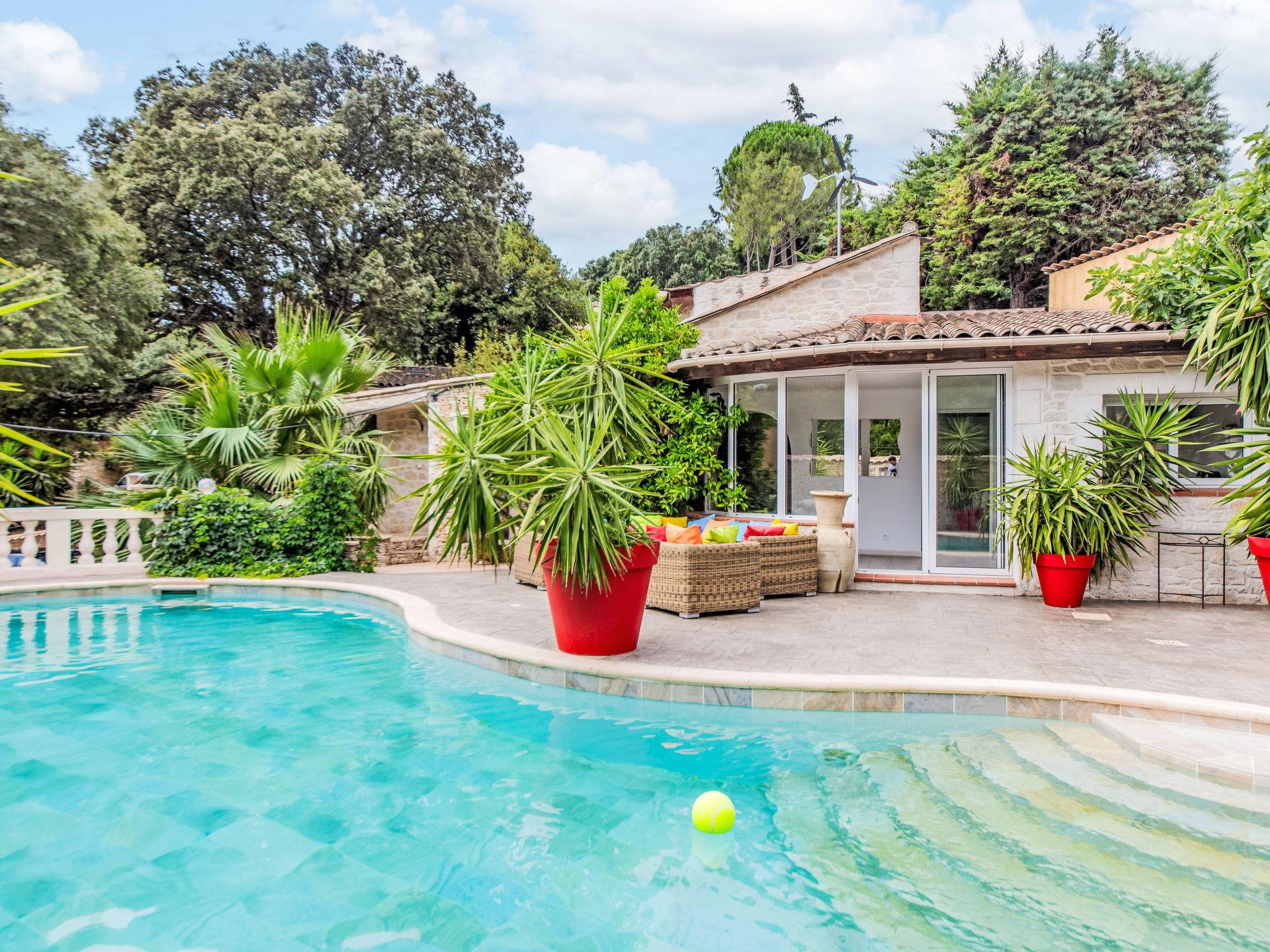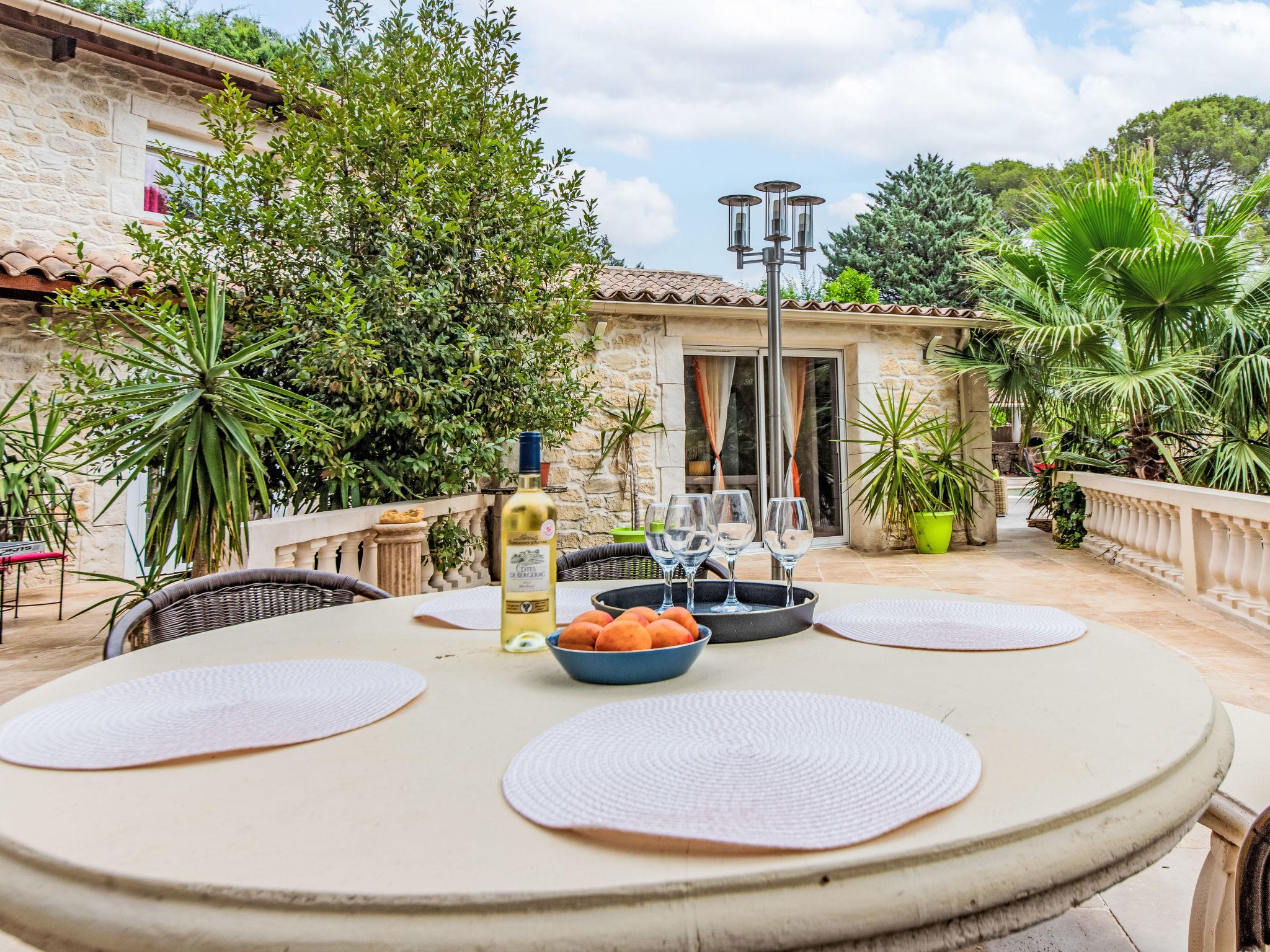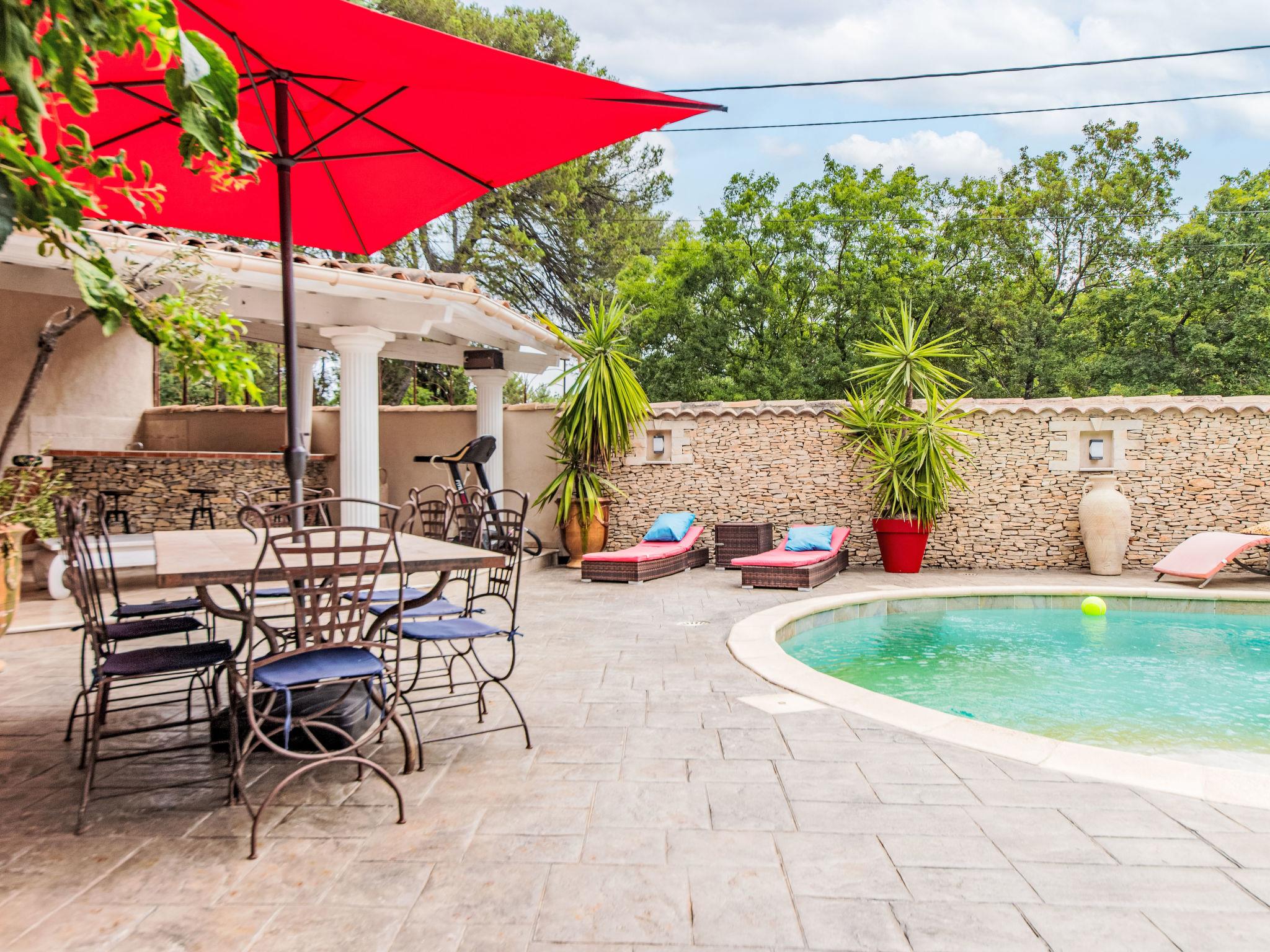 Nîmes: Very modern, beautiful villa "Villa du Soleil". In the resort, 4 km from the centre, in a quiet position in the residential district, 1 km from the edge of the forest, 54 km from the sea, 850 m from the river, in the countryside, south facing position. Private: well-kept garden 600 m2 (fenced) wildlife garden and flowers, swimming pool kidney shaped, heated, with privacy (15 x 5 m, depth 150 - 160 cm, seasonal availability: 15.May. - 15.Oct.) with alarm system. Pool house with fridge, WC and cooking stove, terrace (60 m2), garden furniture, barbecue, pool maintenance by the owner/gardener. In the house: table tennis. Bread roll service, beverage service and breakfast possible (extra). Parking (for 4 cars) on the premises. Shop 1.5 km, shopping centre 1.2 km, bakery 1.2 km, pedestrian zone 4 km, bus stop "Gabriel Faure" 1 km, park "Square Agrippa d'Aubigné" 1.8 km. Sports harbour 34 km, tennis 1.4 km, riding stable 4.1 km, walking paths from the house 2.2 km, cycle lane 3.5 km. Nearby attractions: Arènes de Nîmes 4.3 km, Pont du Gard 20 km, Jardins de la Fontaine 5 km, Maison Carrée de Nîmes 4.5 km, Camargue 18 km, Uzès 22 km. Well-known lakes can easily be reached: La Bouscarasse 31 km. The owner does not accept any youth groups. Please note: Loading and unloading of baggage is possible at the holiday house. Neighbourhood highly sensitive to noise. Quietness and good behaviour expected.
