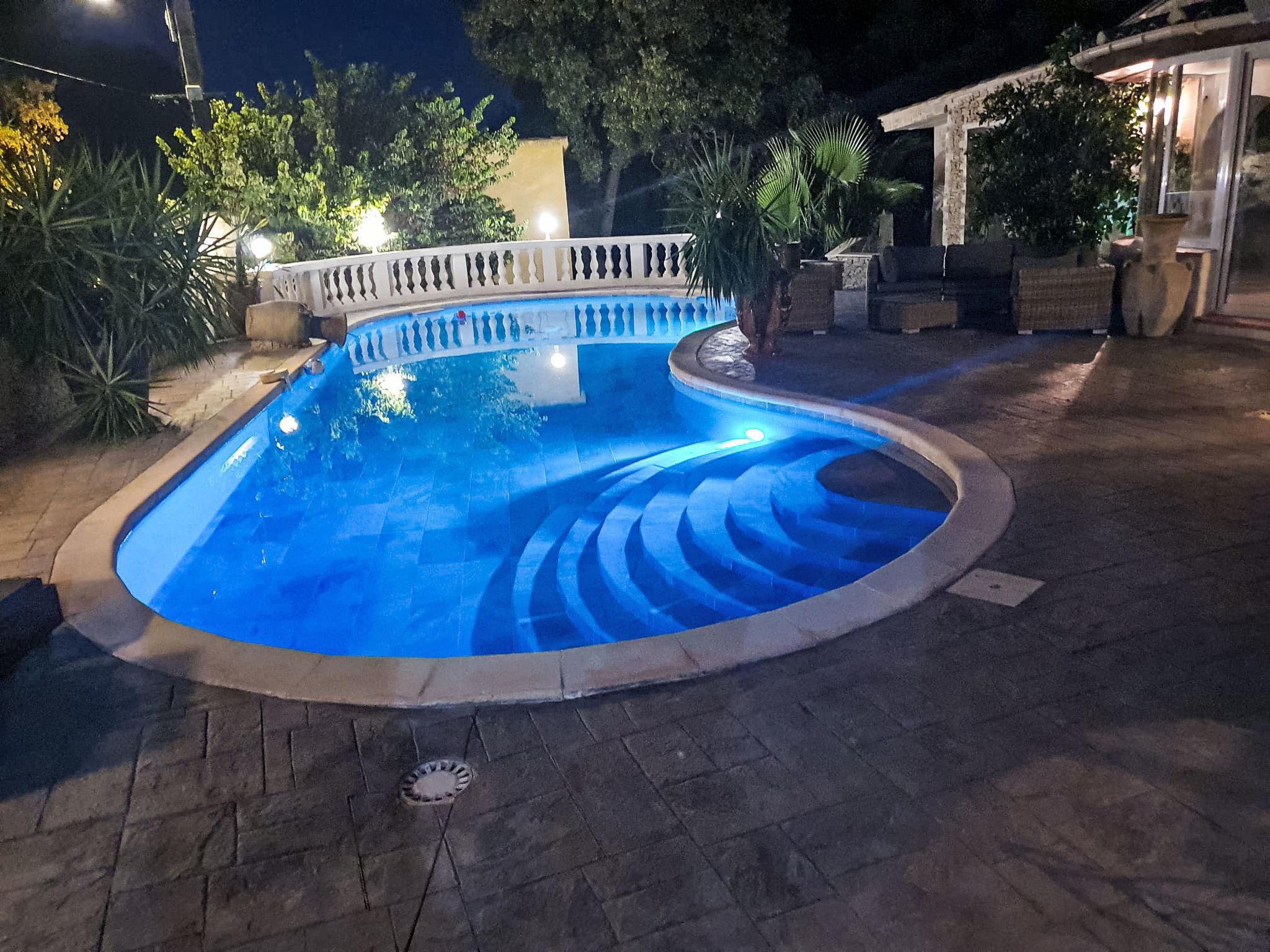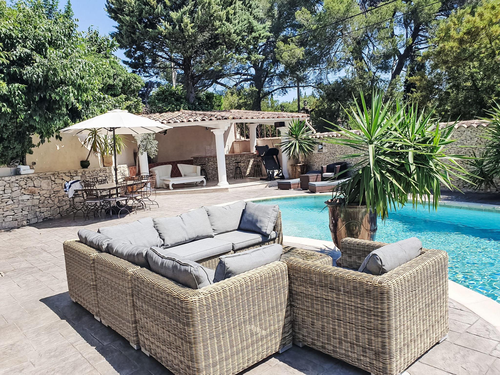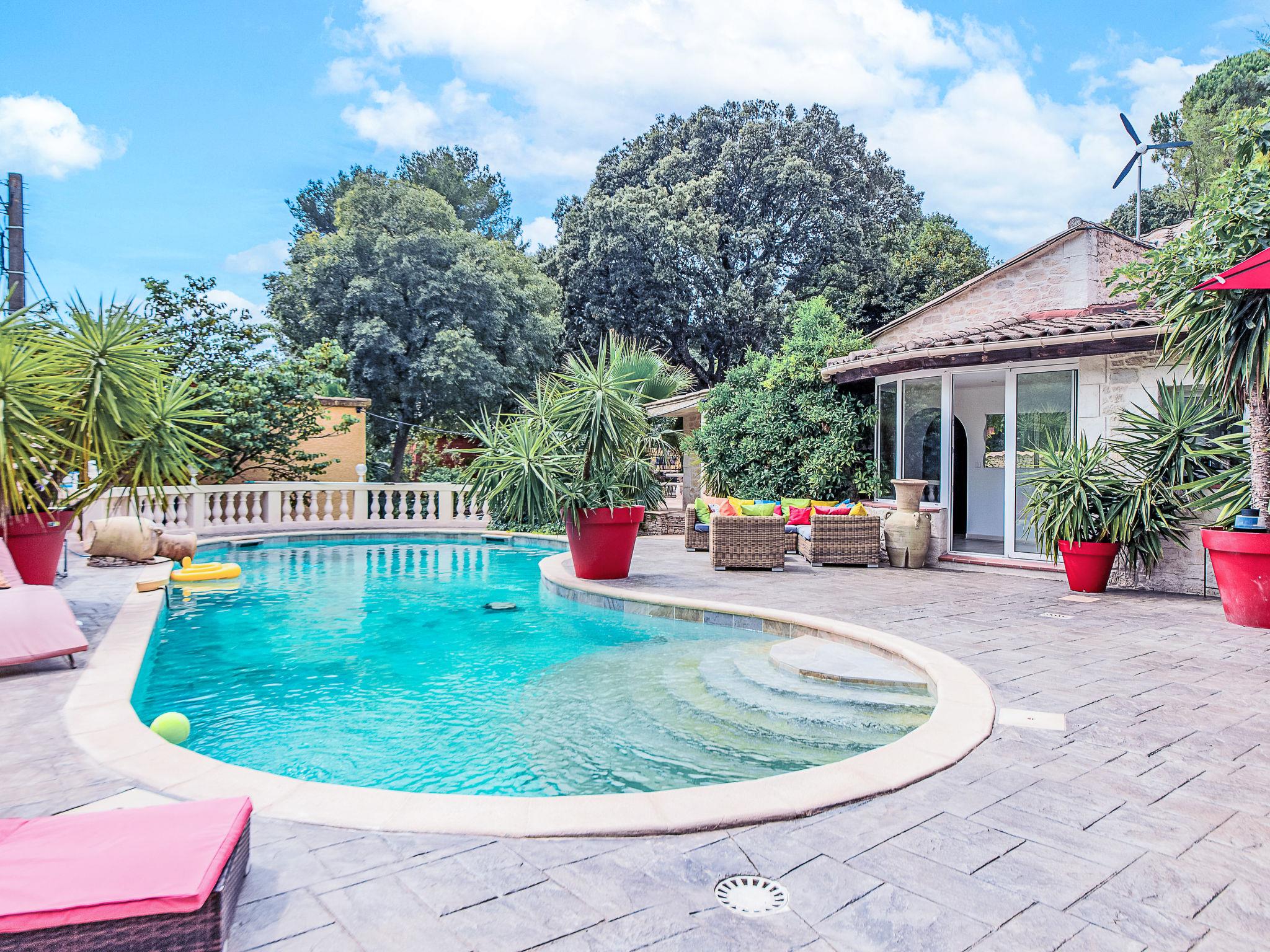 Nîmes: Very modern, beautiful villa "Villa du Soleil". In the resort, 4 km from the centre, in a quiet position in the residential district, 1 km from the edge of the forest, 54 km from the sea, 850 m from the river, in the countryside, south facing position. Private: well-kept garden 600 m2 (fenced) wildlife garden and flowers, swimming pool kidney shaped, heated, with privacy (15 x 5 m, depth 150 - 160 cm, seasonal availability: 15.May. - 15.Oct.) with alarm system. Pool house with fridge, WC and cooking stove, terrace (60 m2), garden furniture, barbecue, pool maintenance by the owner/gardener. In the house: table tennis. Bread roll service, beverage service and breakfast possible (extra). Parking (for 4 cars) on the premises. Shop 1.5 km, shopping centre 1.2 km, bakery 1.2 km, pedestrian zone 4 km, bus stop "Gabriel Faure" 1 km, park "Square Agrippa d'Aubigné" 1.8 km. Sports harbour 34 km, tennis 1.4 km, riding stable 4.1 km, walking paths from the house 2.2 km, cycle lane 3.5 km. Nearby attractions: Arènes de Nîmes 4.3 km, Pont du Gard 20 km, Jardins de la Fontaine 5 km, Maison Carrée de Nîmes 4.5 km, Camargue 18 km, Uzès 22 km. Well-known lakes can easily be reached: La Bouscarasse 31 km. The owner does not accept any youth groups. Please note: Loading and unloading of baggage is possible at the holiday house. Neighbourhood highly sensitive to noise. Quietness and good behaviour expected.