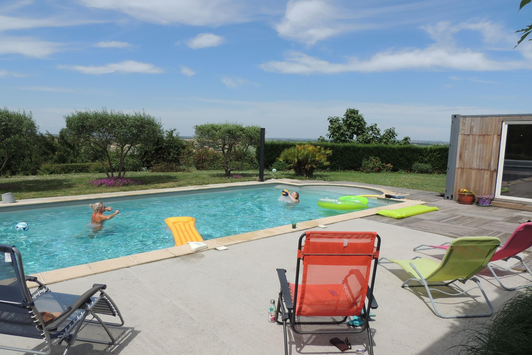 Denne villa ligger i et område med historiske byer, landsbyer og store søer i Midipyrenænerne nær Toulouse og er en times kørsel fra stranden. Toulouse er en by, der kan holde dig underholdt hele dagen, enten til fods eller på cykel Byen er krydset af La Garonne-floden og Canal de Midi. Byen byder på et væld af underholdningsmuligheder. Villaen ligger inden for gåafstand fra bageren og tæt på en stor sø, hvor du kan nyde vandsport. Boligarealerne er beliggende på første sal, hvor du også finder en panoramisk terrasse med udsigt, der holder dig til syne hele dagen og dybt om natten. Køkkenet åbner ud mod terrassen og er fuldt udstyret, herunder et amerikansk køleskab med ismaskin. Der er et satellit-tv i stuen. Der er to soveværelser med eget badeværelse og to børns soveværelser i en separat hall med eget badeværelse. Kontoret indeholder en behagelig vægtseng. Fritidsrummet ligger i stueetagen og støder op til en overdækket terrasse. Her finder du swimmingpoolen, som er sikret med et elektrisk pooldæksel. Liggestole venter på dig på terrassen. Ejendomscheferne lever i et helt separat område, så der er ingen grund til at bekymre sig om privatlivets fred.