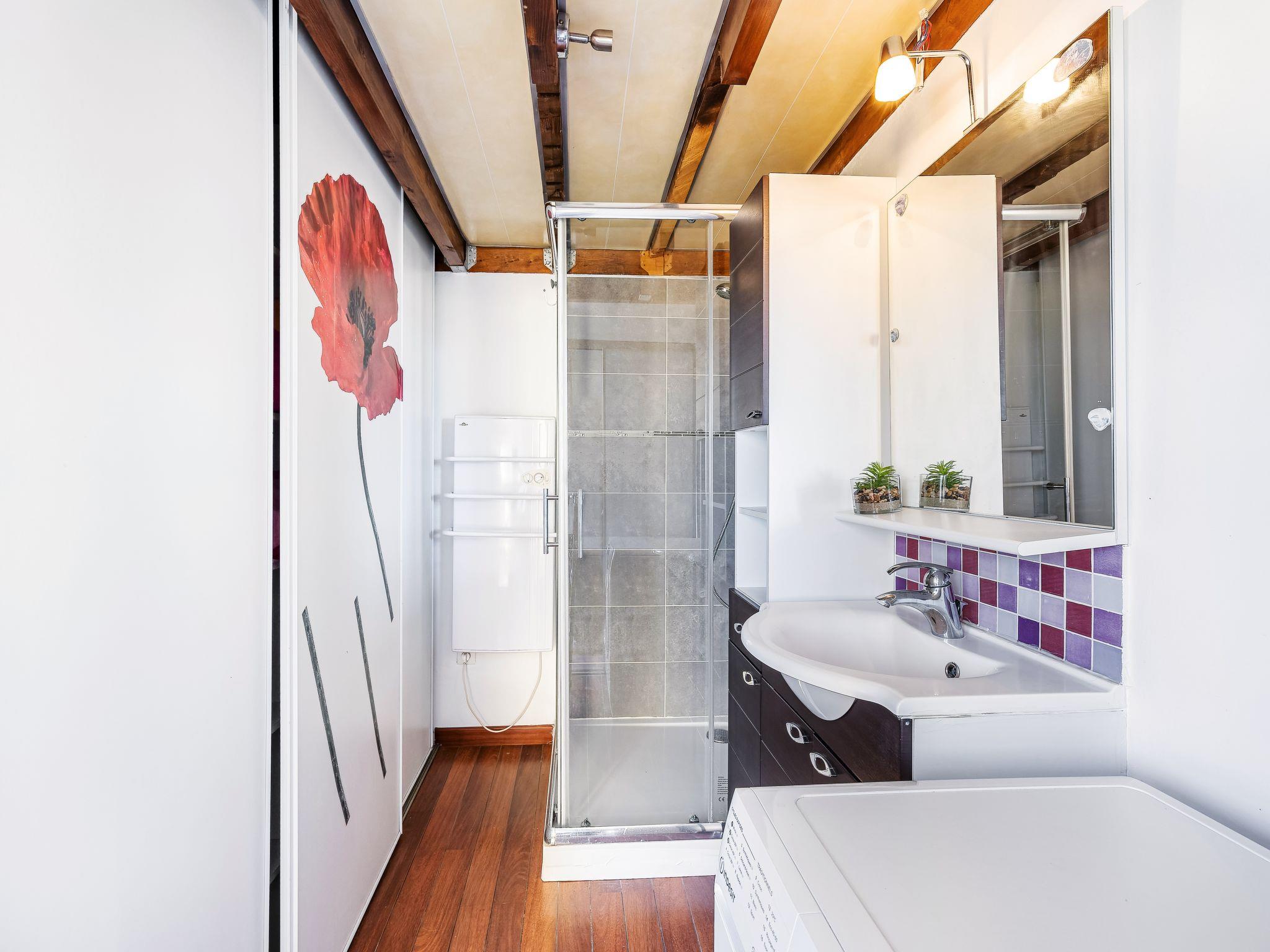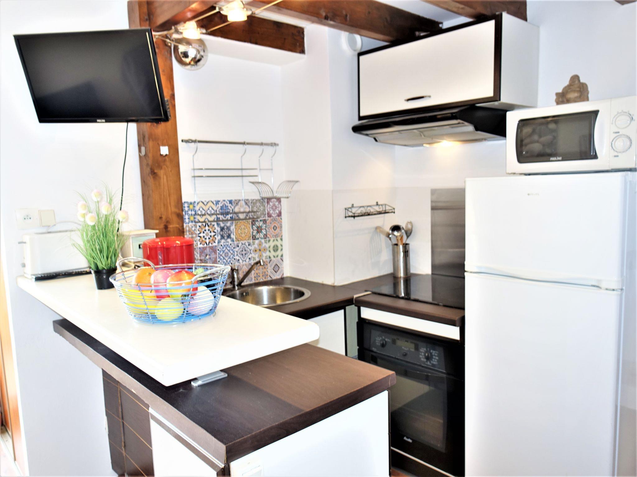 1-room studio 27 m2 on 2 levels on 3rd floor. Comfortable and beautiful furnishings: living/dining room with 1 double sofabed (140 cm, length 190 cm), TV (flat screen). Exit to the balcony. Open kitchen (oven, 3 induction hot plates, microwave, freezer). Shower, sep. WC. Electric heating. Upper floor: (steep stair) gallery with sloping ceilings, ceiling height 90 - 150 cm with rooflight with 1 french bed (140 cm, length 190 cm). Balcony 4 m2. Balcony furniture. Beautiful view of the sea. Facilities: washing machine. Internet (WiFi, extra). Parking space n 60. Please note: smoke alarm. Instead of an enclosed bedroom, some sleeping areas are located in an open-plan area (gallery, alcove, etc.). Offer by a private individual according to Art. 155, IV of CGI.
