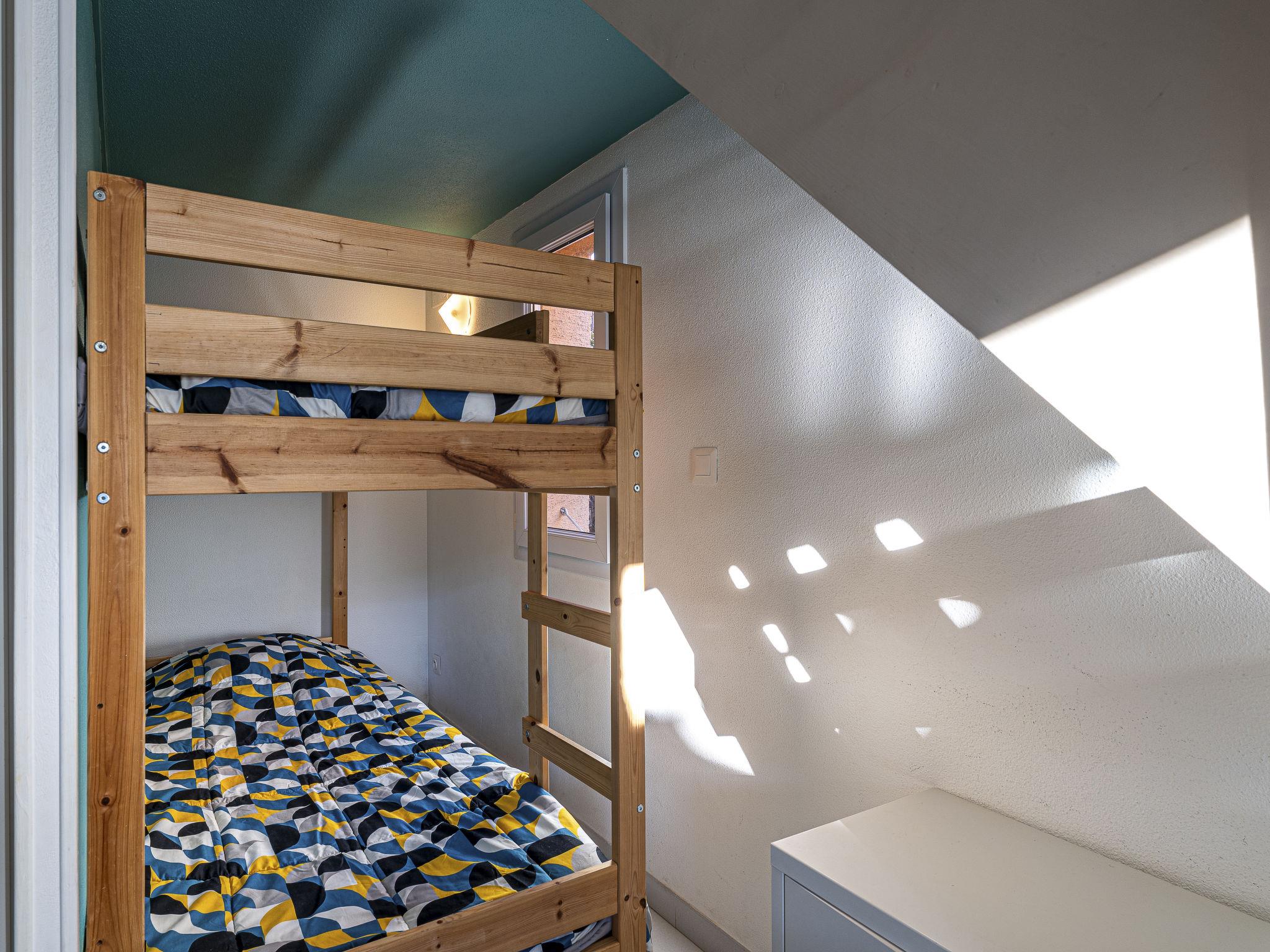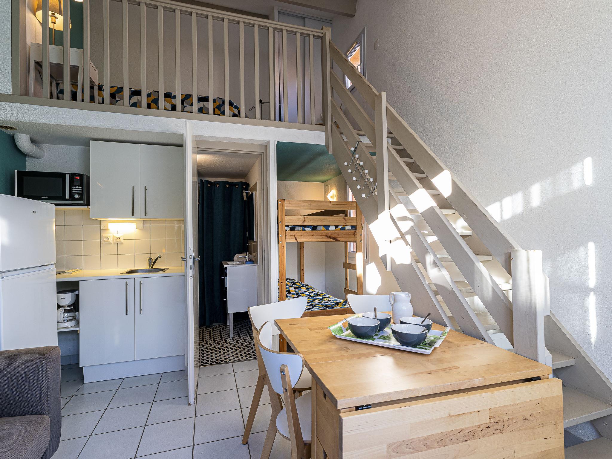 1-room terraced house 23 m2 on 2 levels. Comfortable and beautiful furnishings: living/dining room with 1 x 2 bunk beds (80 cm, length 200 cm), TV (flat screen). Exit to the terrace. Kitchenette (2 ceramic glass hob hotplates, toaster, kettle, freezer, electric coffee machine, combination microwave). Shower/WC. Electric heating. Upper floor: gallery with 1 french bed (1 x 140 cm, length 200 cm). Terrace 37 m2, south-east facing position. Terrace furniture. Parking. Please note: smoke alarm. Instead of an enclosed bedroom, some sleeping areas are located in an open-plan area (gallery, alcove, etc.). Offer by a private individual according to Art. 155, IV of CGI.