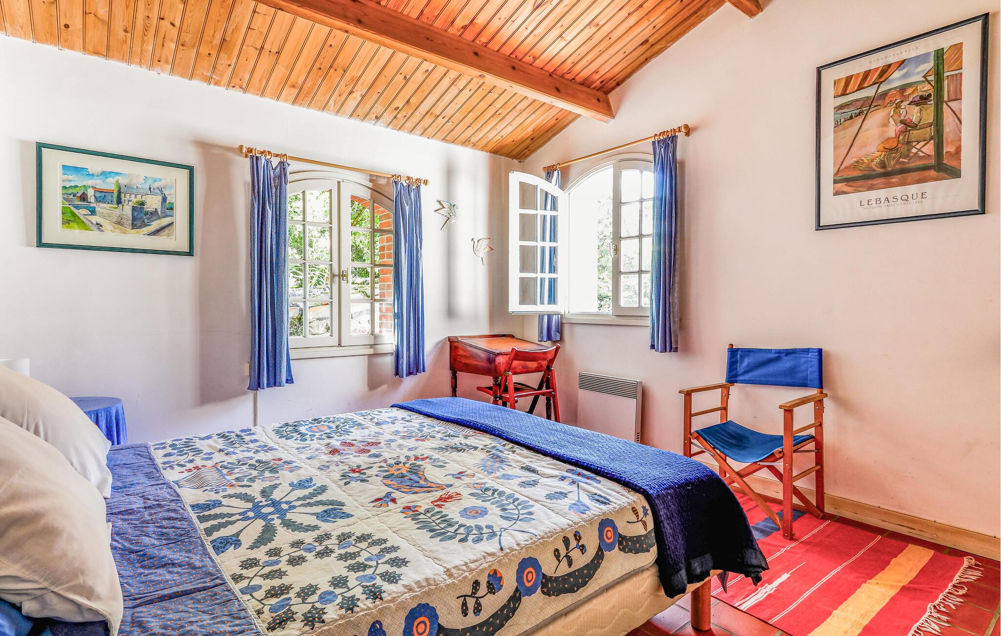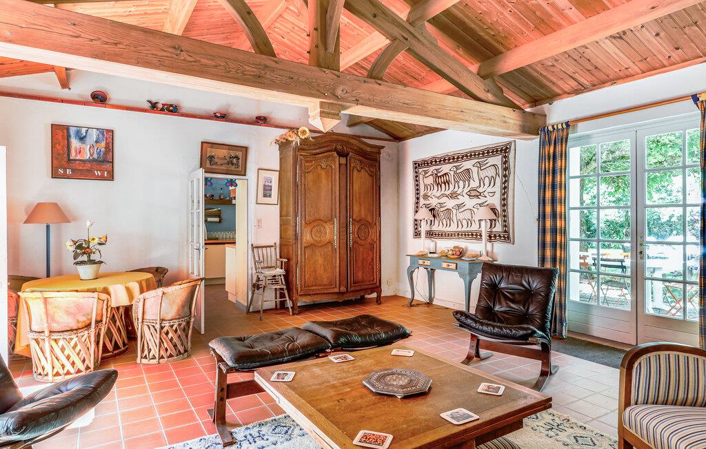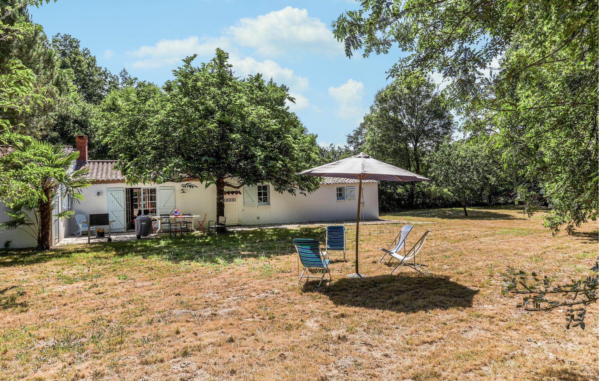 Oplev idylliske dage i dette smukke feriehus i skovbrynet og kombiner en strandferie med aktive udforskninger. Velkommen til dette hyggelige feriehus, hvor I kan lægge hverdagen bag jer med familien i en smukt designet atmosfære. Fremtryl lækre retter lavet af friske råvarer fra markedet under hyggelige madlavningsaftener, snak over et glas vin i den hyggelige stue, og afrund en begivenhedsrig dag med en harmonisk spilleaften. Den afsondrede grund er en idyllisk oase af fred, hvor I vil nyde at tilbringe tid. Lad jeres børn have en picnic, fordyb jer i en god bog under parasollen, forfrisk jer under udendørsbruseren og tænd op i grillen. Udforsk de maleriske cykel- og vandrestier i Vendée og oplev små kapeller, skyggefulde skove og idylliske søer, hvor I kan svømme og fiske. Solbad på strandene i Les Sables-d'Olonne eller Jard-sur-Mer, slentr gennem historiske La Roche-sur-Yon, eller overrask jeres børn med en tur til Les Sables Dyrepark.