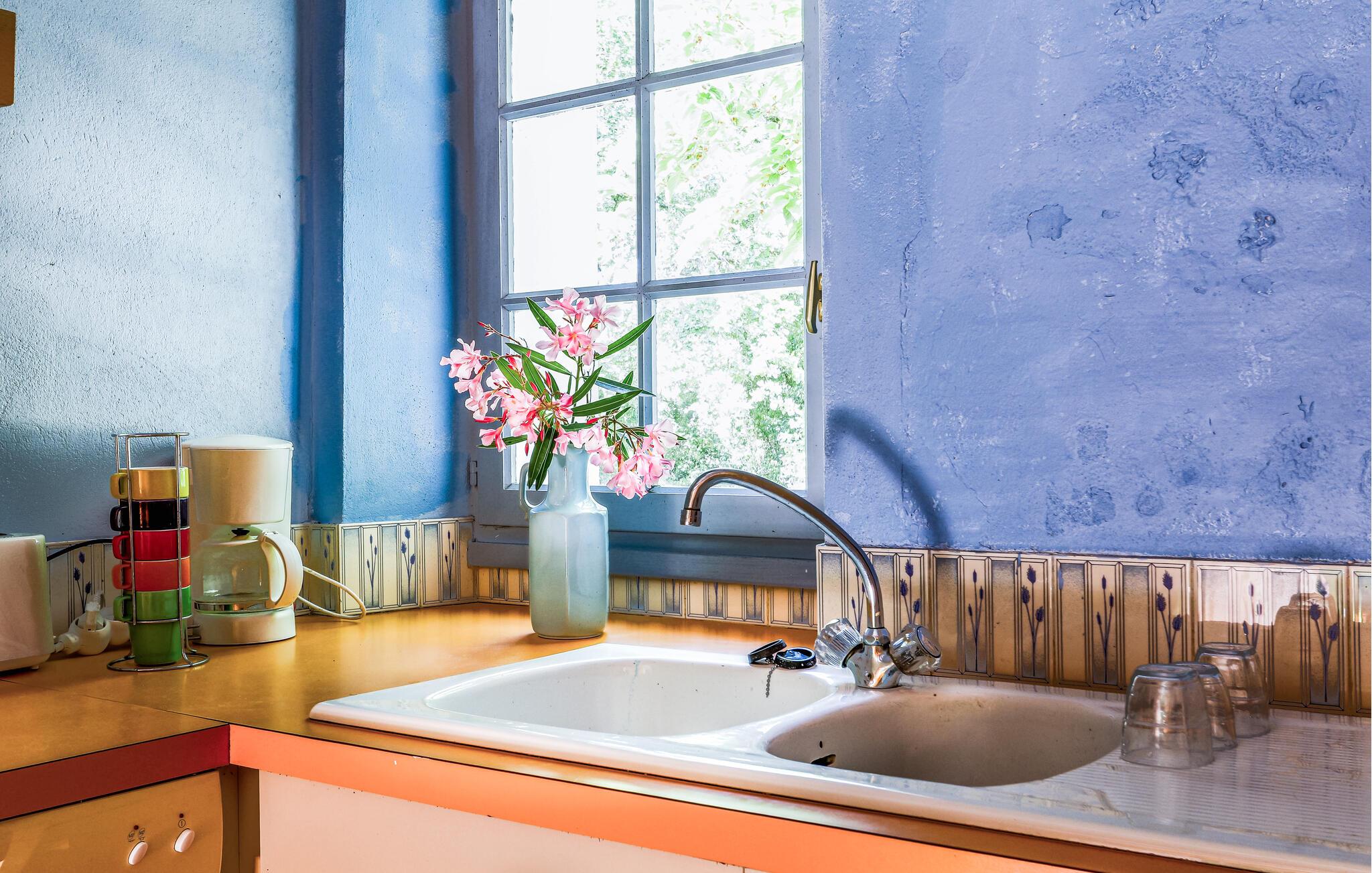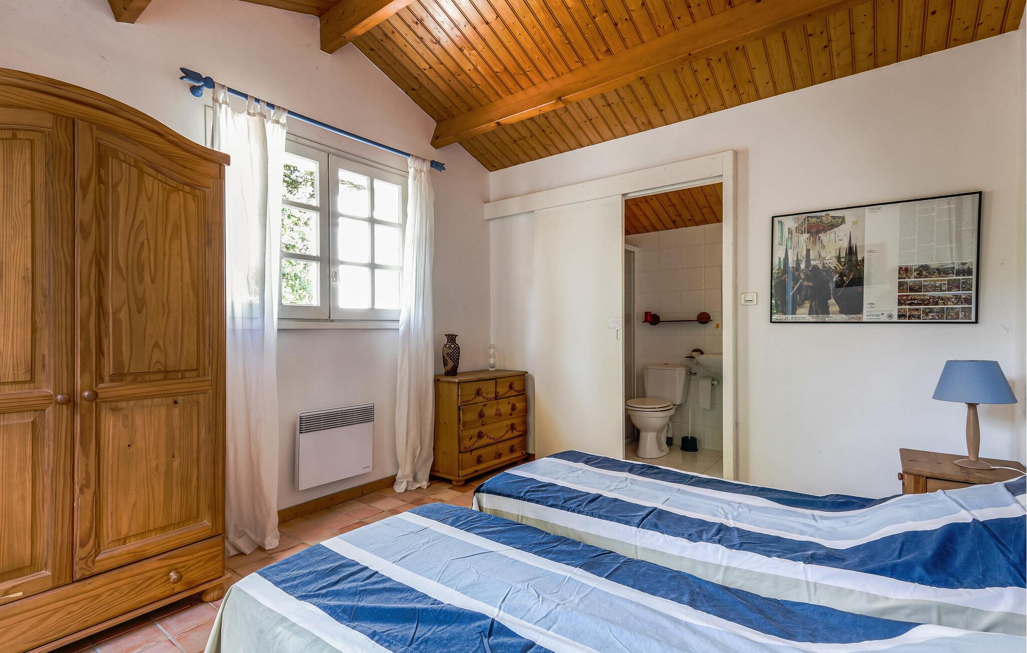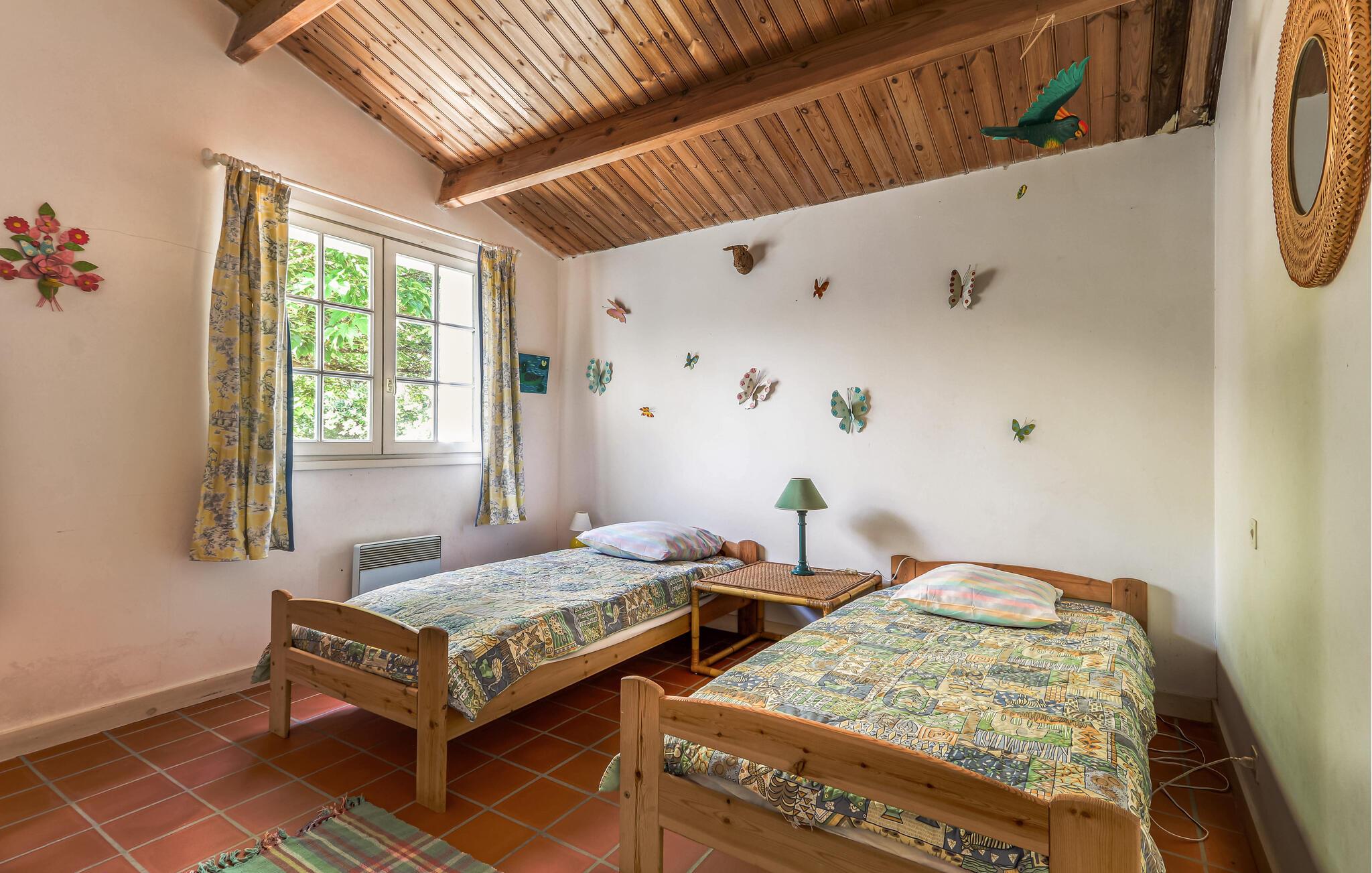 Oplev idylliske dage i dette smukke feriehus i skovbrynet og kombiner en strandferie med aktive udforskninger. Velkommen til dette hyggelige feriehus, hvor I kan lægge hverdagen bag jer med familien i en smukt designet atmosfære. Fremtryl lækre retter lavet af friske råvarer fra markedet under hyggelige madlavningsaftener, snak over et glas vin i den hyggelige stue, og afrund en begivenhedsrig dag med en harmonisk spilleaften. Den afsondrede grund er en idyllisk oase af fred, hvor I vil nyde at tilbringe tid. Lad jeres børn have en picnic, fordyb jer i en god bog under parasollen, forfrisk jer under udendørsbruseren og tænd op i grillen. Udforsk de maleriske cykel- og vandrestier i Vendée og oplev små kapeller, skyggefulde skove og idylliske søer, hvor I kan svømme og fiske. Solbad på strandene i Les Sables-d'Olonne eller Jard-sur-Mer, slentr gennem historiske La Roche-sur-Yon, eller overrask jeres børn med en tur til Les Sables Dyrepark.