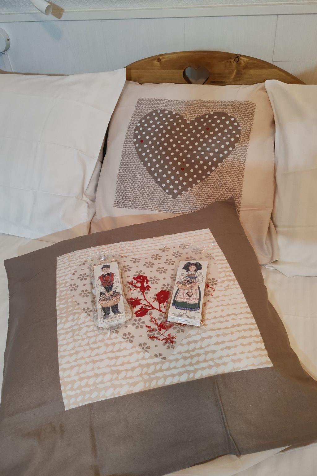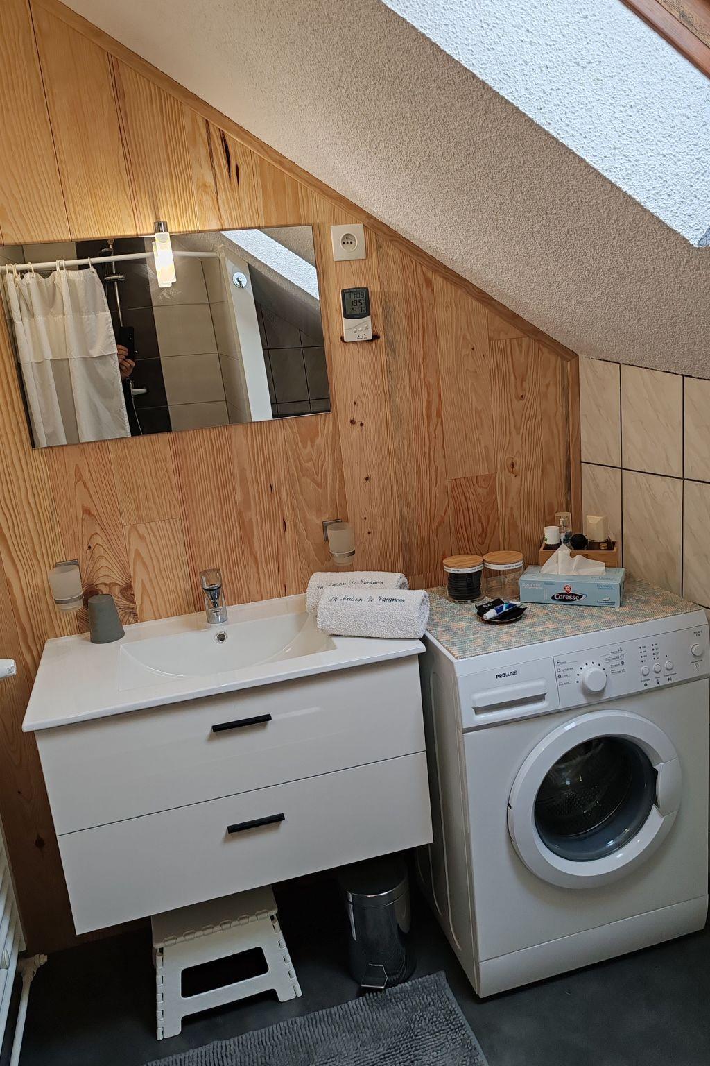 The gîte comprises: - 1 fully-equipped kitchen: oven, dishwasher, microwave, coffee machine, kettle, toaster, various frying pans, etc. - 1 living room with sofa bed, armchair, coffee table, bookcase with many books, mini-stereo with charging station for Iphone, TV (TNT HD) with DVD player (DVDs available free of charge) - 1 dining area with a large table and 6 chairs. 1 bedroom with a 160 x 200 bed, two bedside tables, a wardrobe and a cot. 1 bedroom with two separate 90 x 190 beds, wardrobe and bedside tables. - 1 WC separate from the showers. - 1 shower room with shower, washbasin, washing machine and storage cupboard for towels (provided free of charge). - 1 large covered terrace with barbecue and garden furniture. On the ground floor you will find a room dedicated to the various options we can offer you, such as breakfasts, table d'hôtes, etc.
