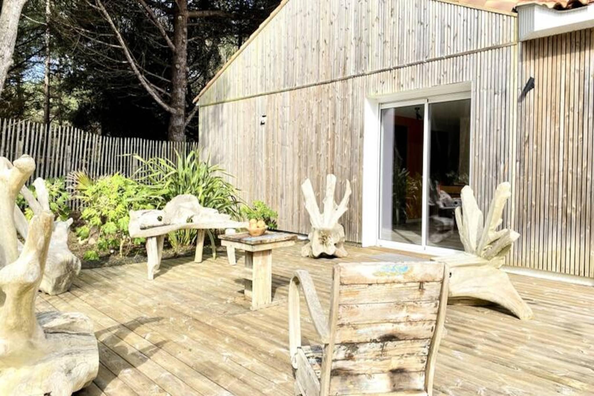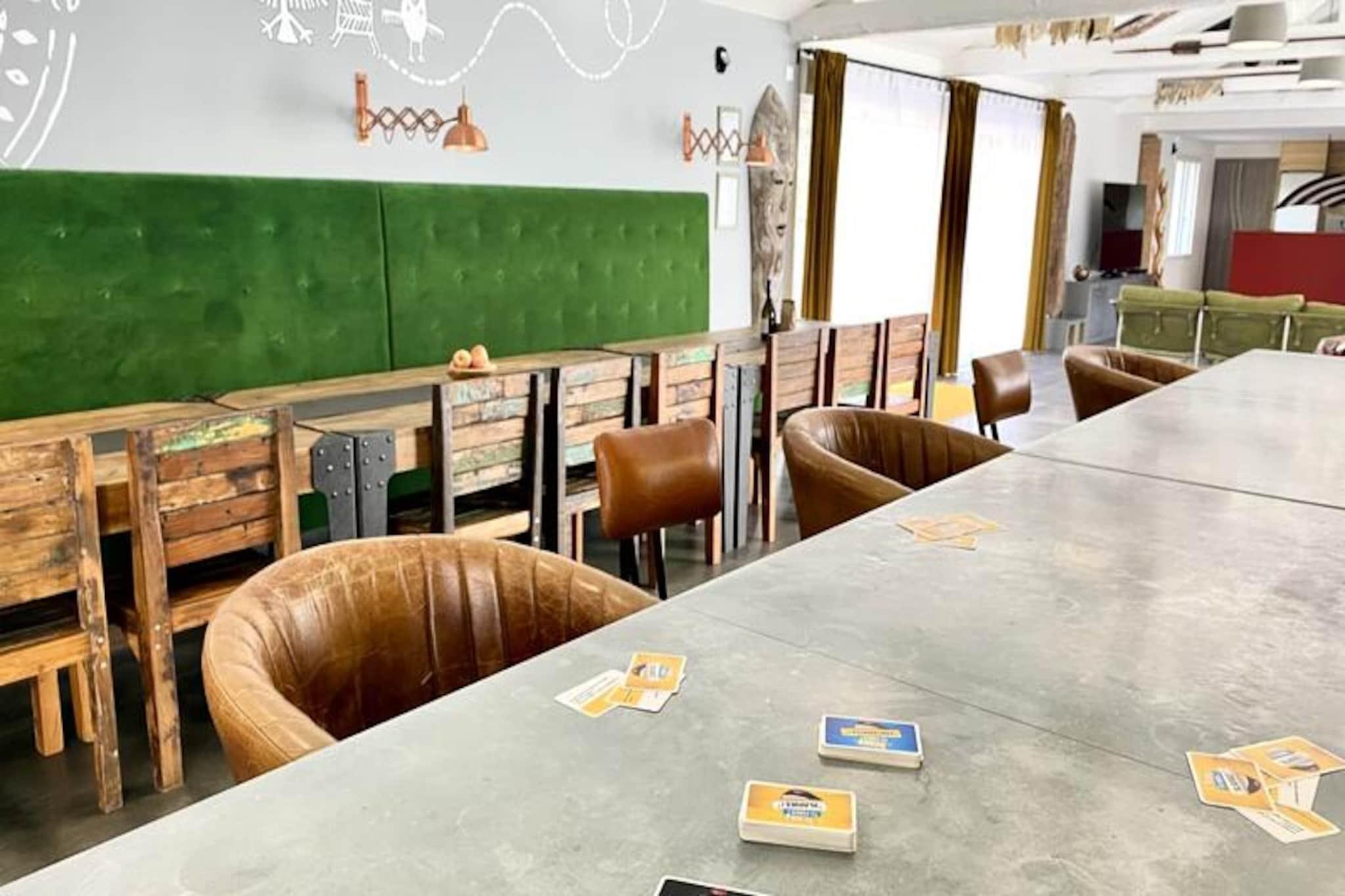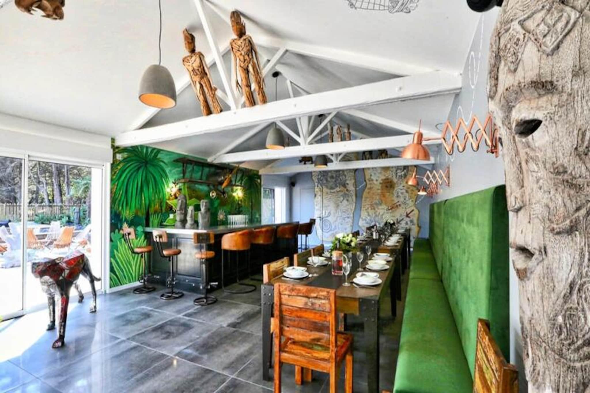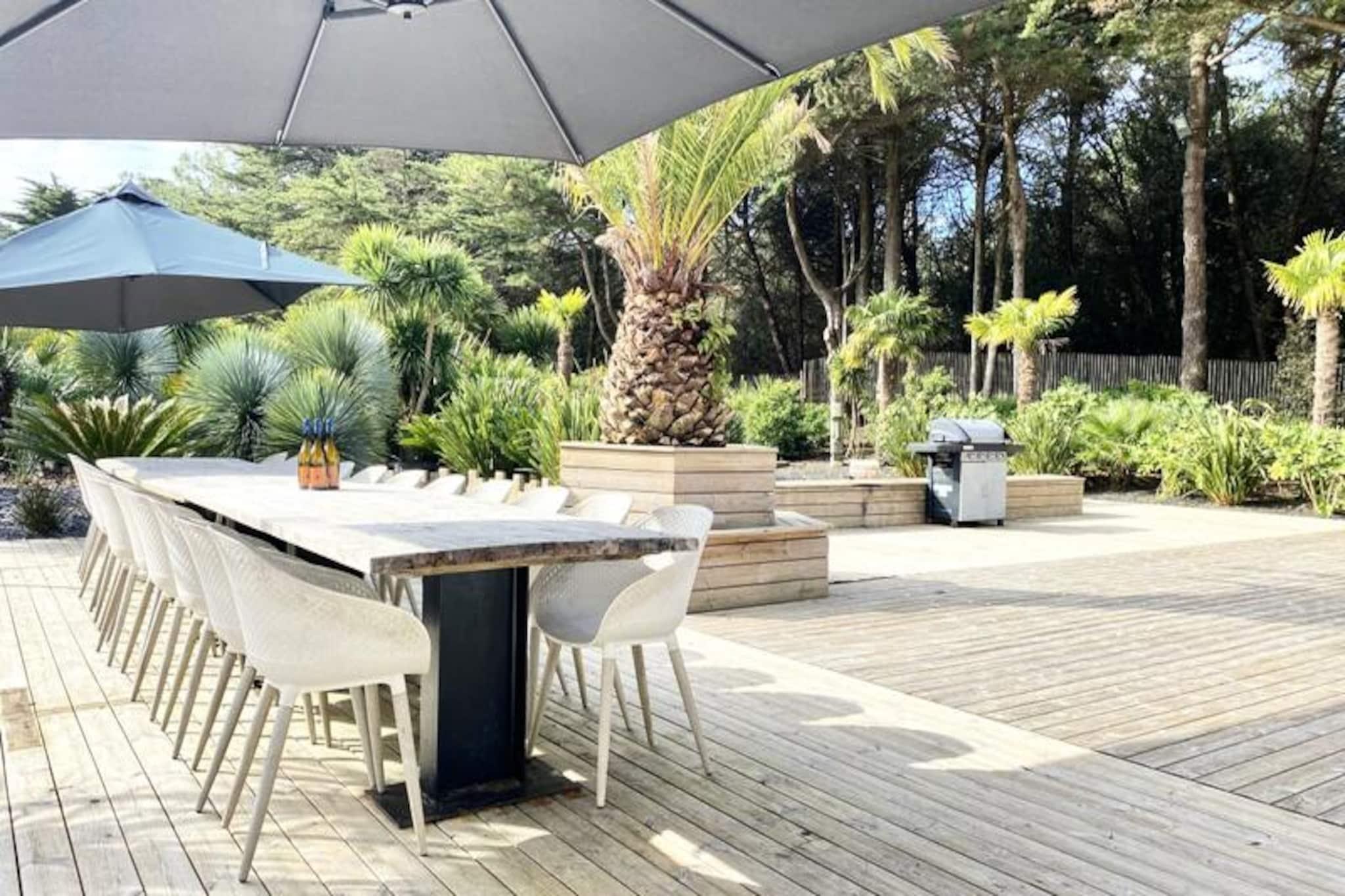 Denne rummelige villa på 280 m², beliggende i hjertet af skoven, tilbyder et roligt tilflugtssted for op til 15 personer. Det har 8 soveværelser, herunder 7 dobbeltsenge og 2 enkeltsenge (som kan omdannes til en dobbeltseng). Villaen har også 4 badeværelser og 4 toiletter, hvilket gør den perfekt til store grupper. Gæsterne kan nyde komforten i et stort receptionsområde med en lounge, stue og bar. Kæledyr under 25 kg er tilladt, hvilket gør det ideelt for familier med lodne ledsagere. Beliggende kun få minutter fra stranden, er denne villa omgivet af den fantastiske Pays-de-Monts nationalskov, der tilbyder rigelige muligheder for at udforske nærliggende cykelstier. Området giver også nem adgang til lokale caféer, markeder og butikker, hvilket gør det til en perfekt destination for både udendørsentusiaster og dem, der søger afslapning. Villaen er fuldt udstyret med moderne bekvemmeligheder, herunder et køkken med ovn, køleskab med fryser, opvaskemaskine, mikroovn og en Krups fuldkorns kaffemaskine. Et velværerum med sauna og balneo er til rådighed, og udenfor kan I slappe af på den store private terrasse med havemøbler, grill og svømmespa. Yderligere funktioner omfatter bordfodbold, brætspil og en vandcykel.