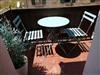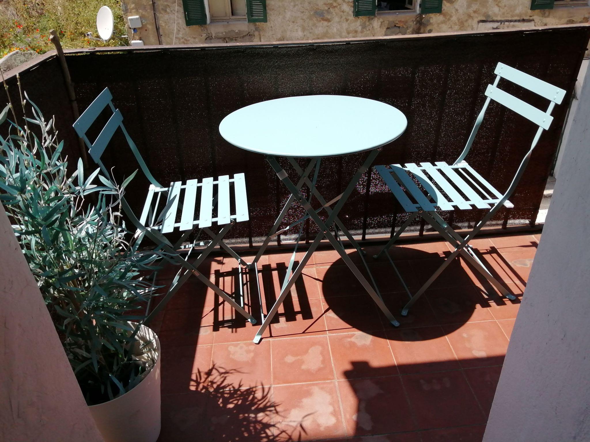 Small balcony with table and 2 chairs.