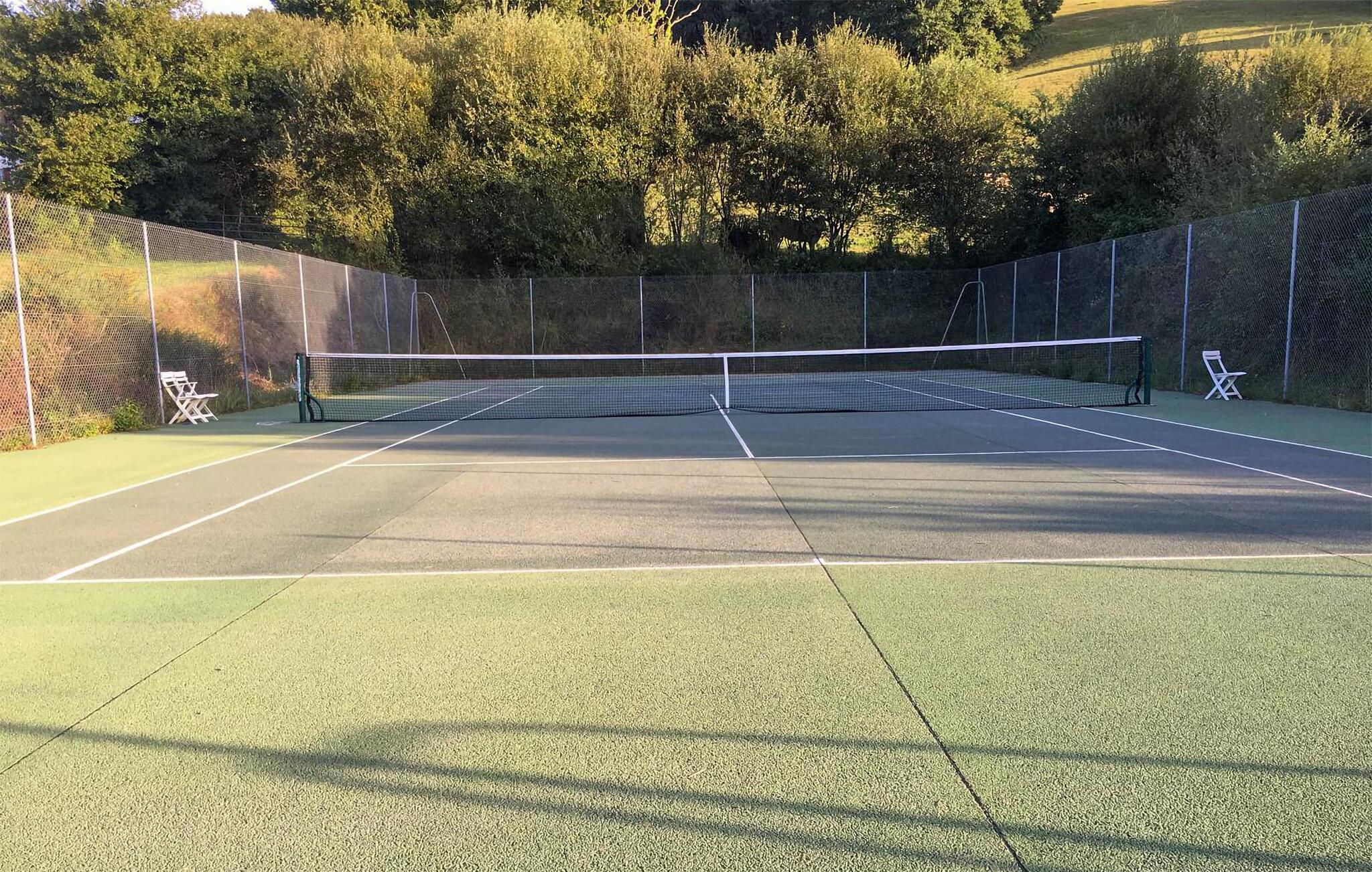 Udenfor står en stor swimmingpool, en privat tennisbane og masser af plads til leg og afslapning til rådighed for jer. Terrassen indbyder til hyggelige stunder sammen, hvor I kan nyde solen, den fantastiske udsigt og kolde drikke. Brug de skyggefulde terrasser til måltider under åben himmel eller blot til at nyde roen i landskabet.