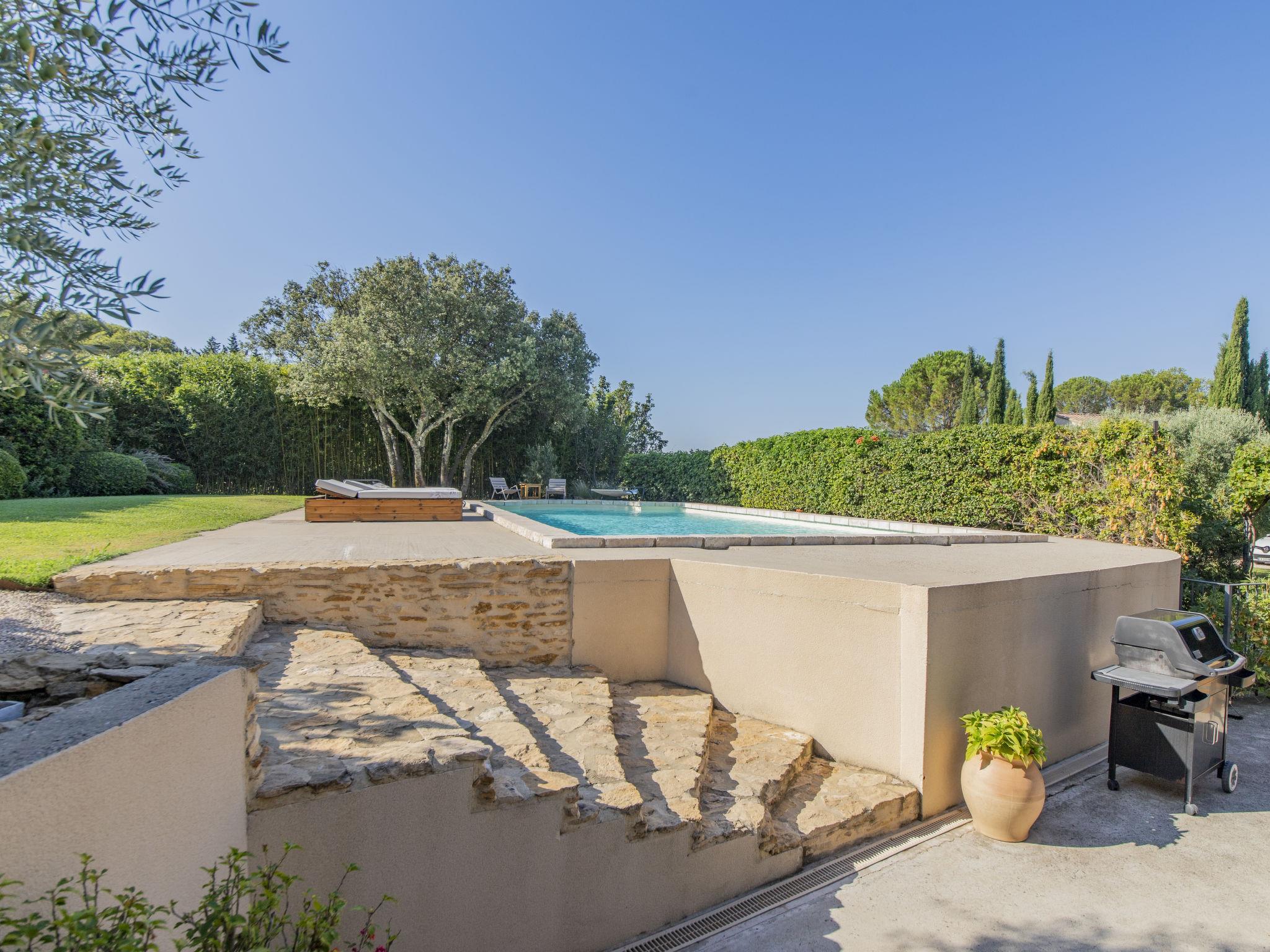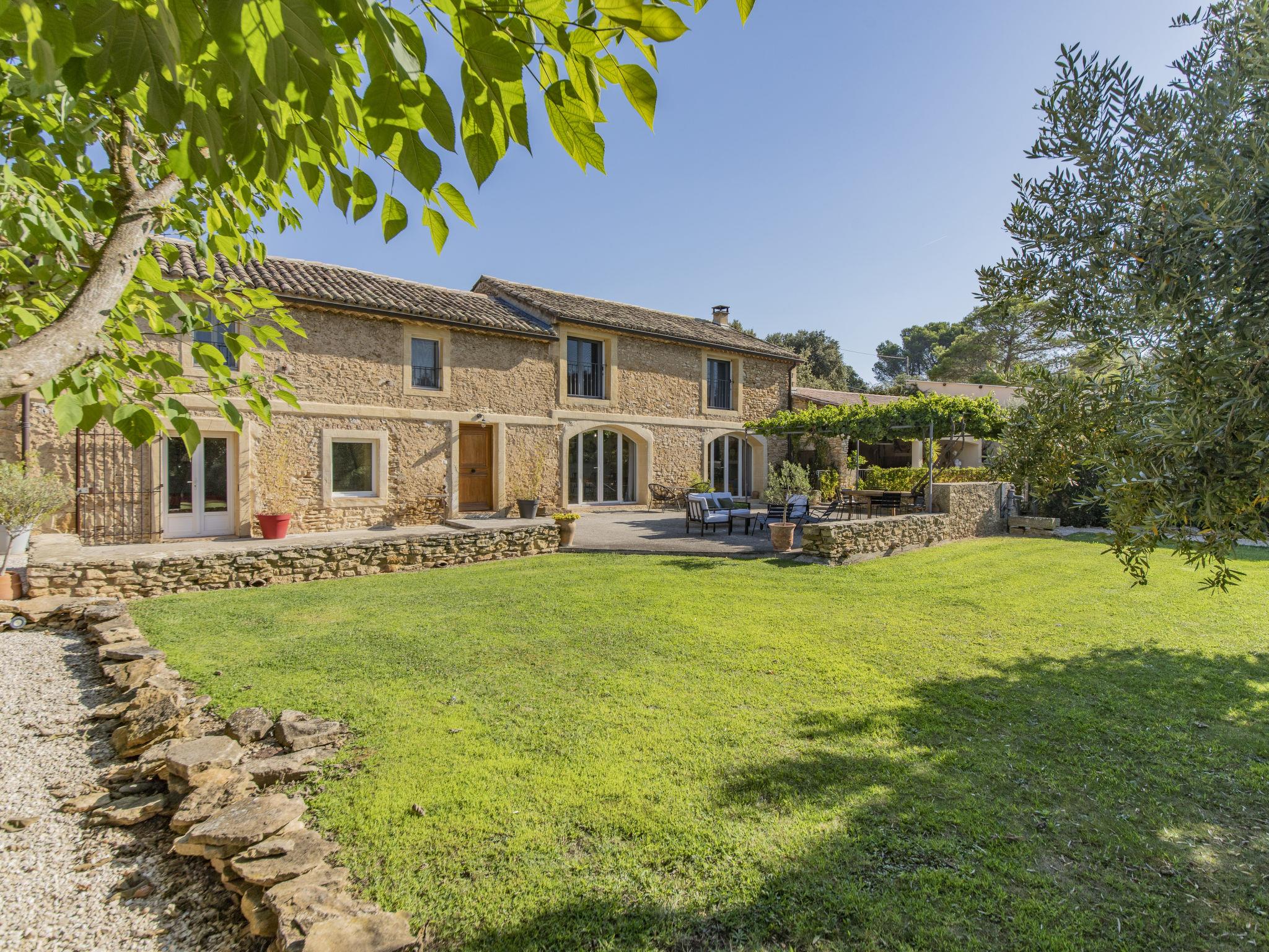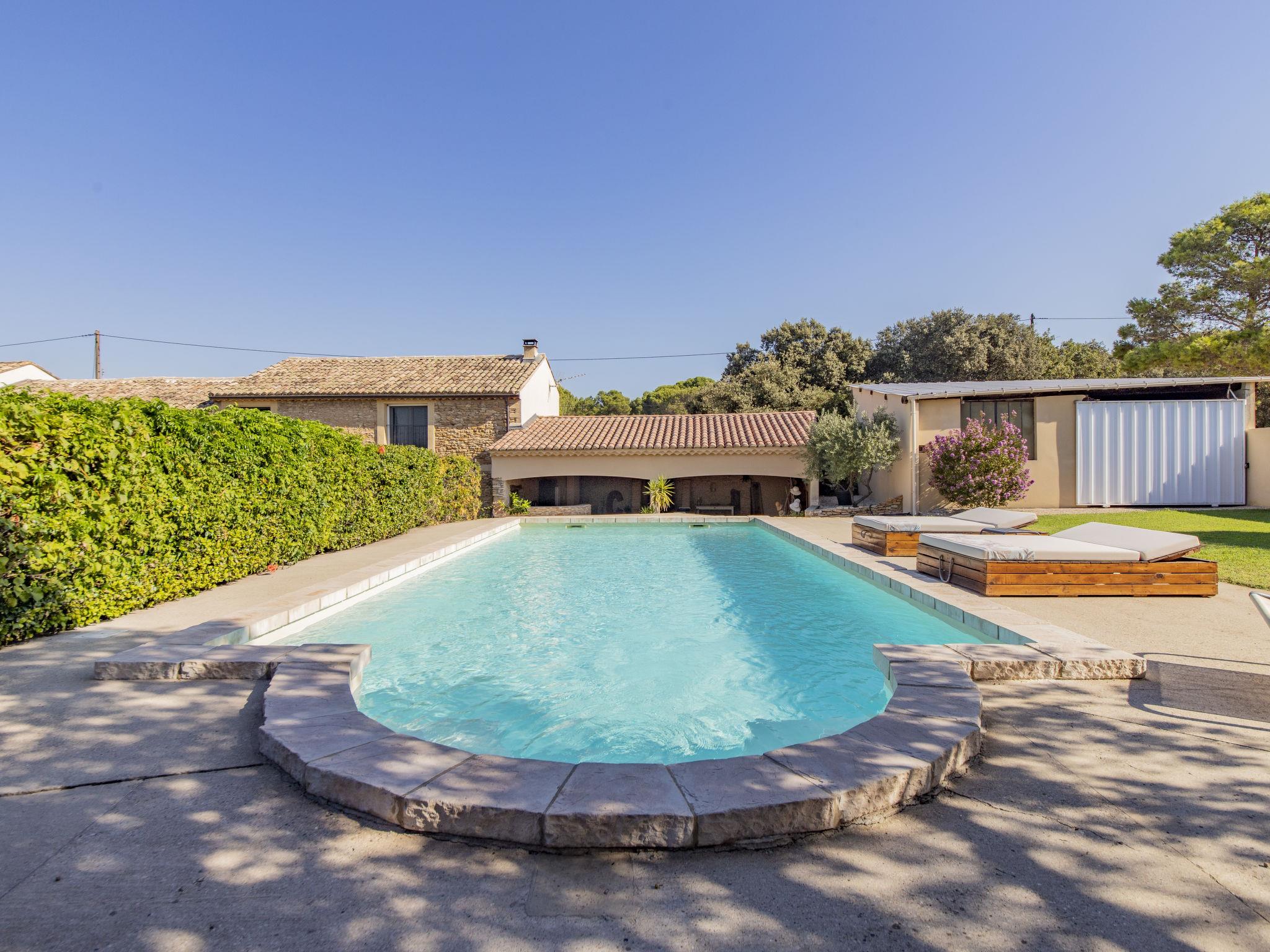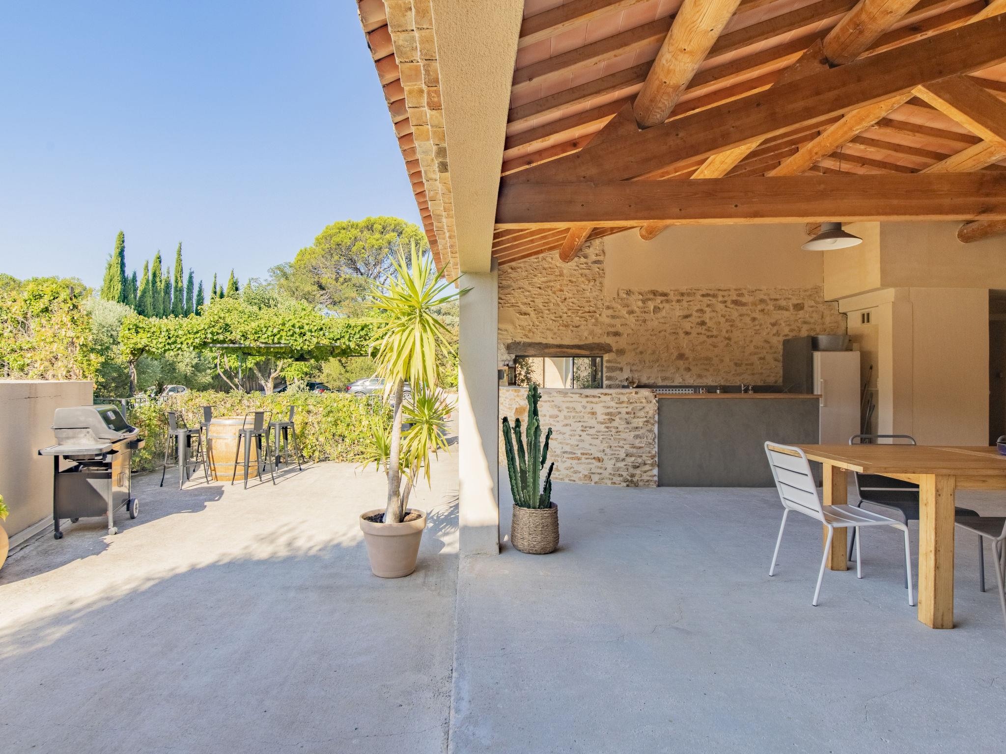 Pool house 80mq with full summer kitchen (fridge, hotplates, barbecue) and WC. Mas "Le Mas des Buis", renovated in 2016. In the resort 1.5 km from the centre of Uchaux. Private: property 4'500 m2 (fenced), swimming pool (10 x 5 m, depth 140 - 140 cm, seasonal availability: 01.Jun. - 30.Sep.). Linen change weekly. Towel change weekly. Room cleaning weekly (included). Parking on the premises. Shop 1.5 km, supermarket 5 km, restaurant 500 m, bakery 150 m, bus stop "Centre Serignan du Comtat" 4.3 km. Nearby attractions: Orange 8 km, Vaison la Romaine 32 km, Avignon 41 km, Mont Ventoux 62 km. Please note: car recommended. Suitable for families.