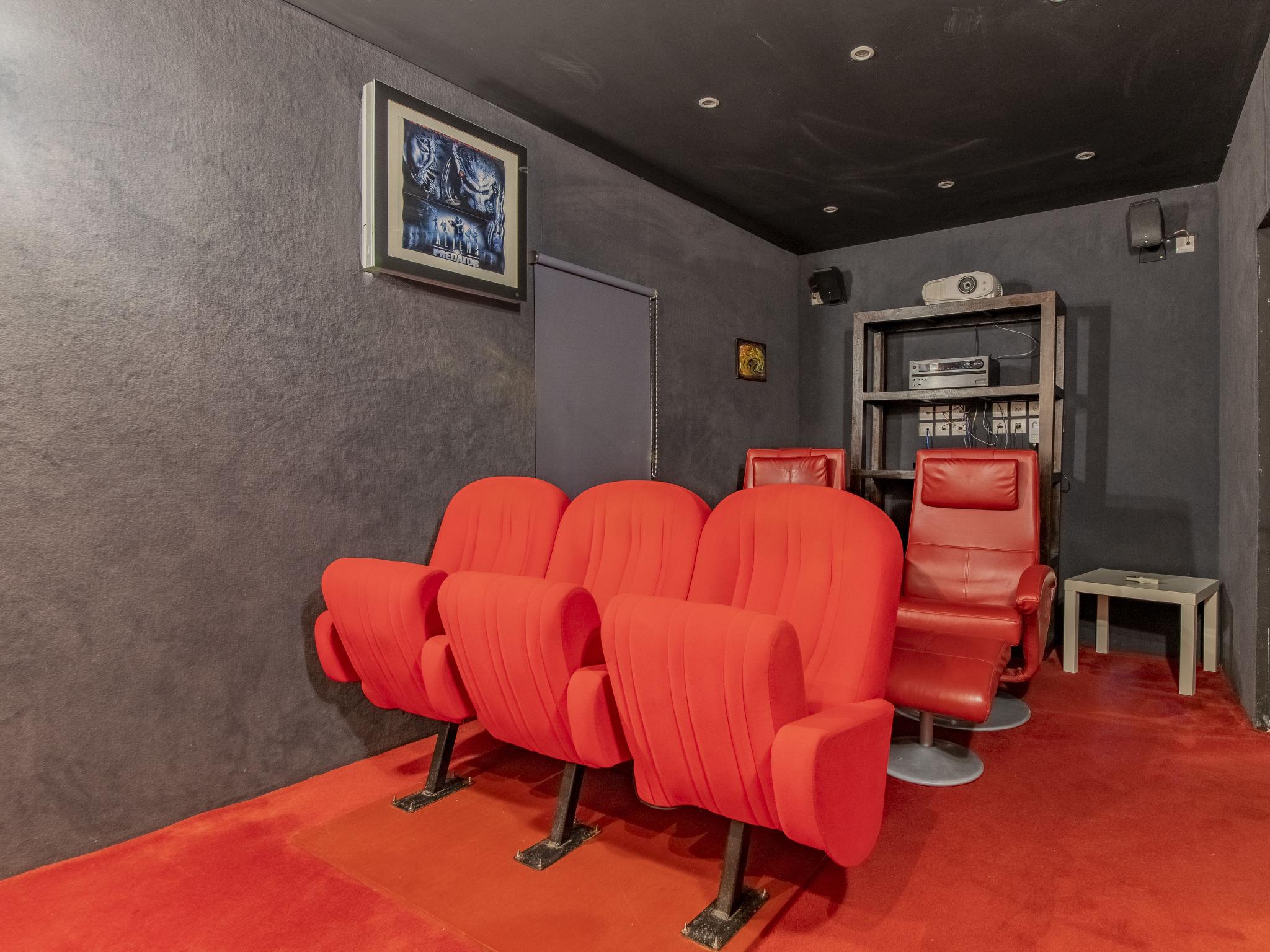 7-room house 250 m2. Living/dining room with TV (flat screen), air conditioning. Exit to the terrace. Billiard room. Open kitchen (4 hot plates, oven, dishwasher, microwave, freezer, electric coffee machine, Capsules for coffee machine (Nespresso) extra). Sep. WC. Heating. Upper floor: 1 room with 1 french bed (140 cm, length 190 cm), air conditioning. 2 rooms, each room with 1 french bed (140 cm, length 190 cm). 1 room with Dressing room with 1 french bed (180 cm), shower/WC and TV (flat screen), air conditioning. Shower, sep. WC, double hand-basin. Terrace 200 m2 partly roofed. Terrace furniture, barbecue, deck chairs. Facilities: washing machine, iron. Internet (WiFi, free). Parking (4 cars). Please note: smoke alarm. Movie theater - video included in the rental.