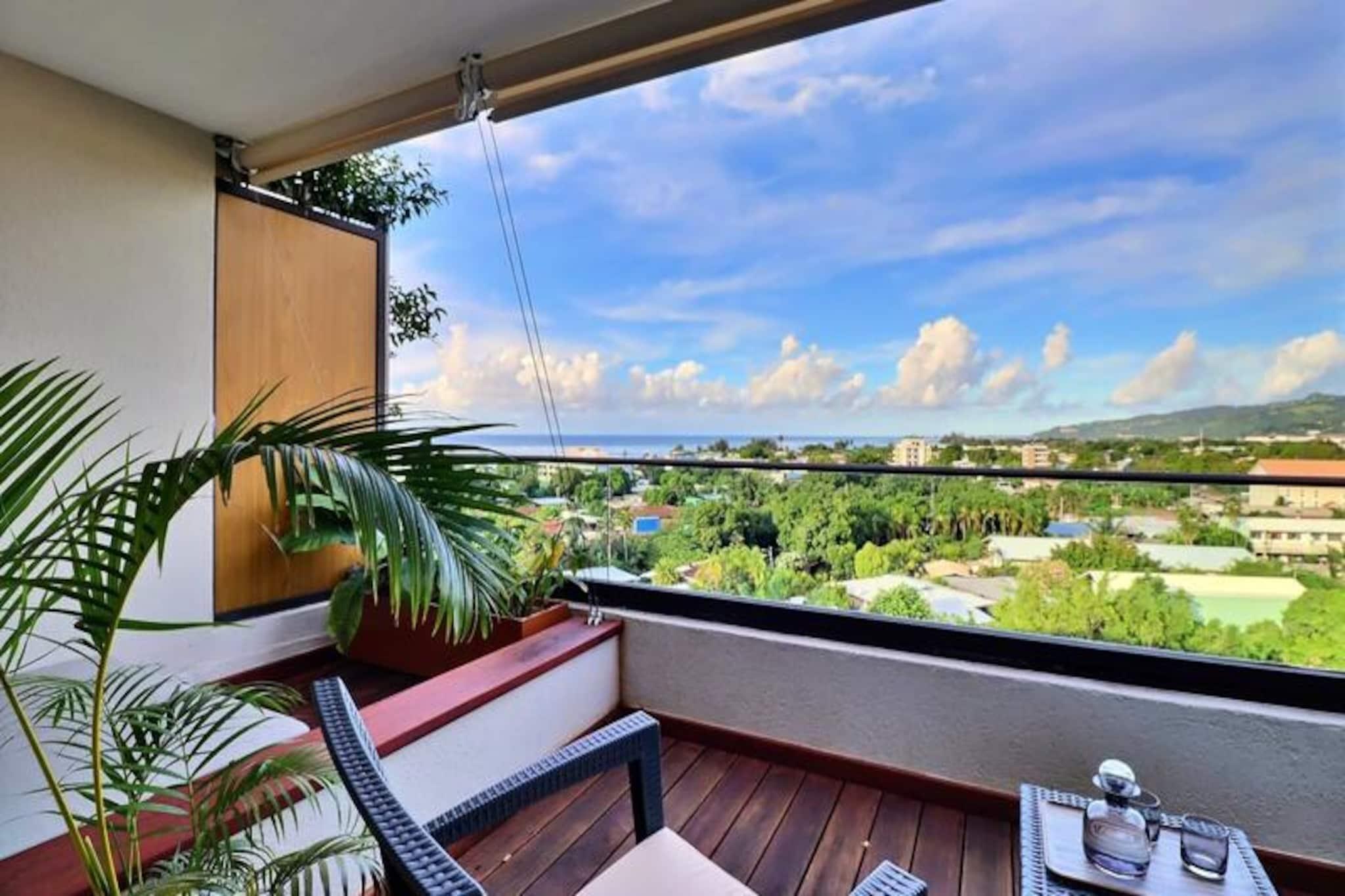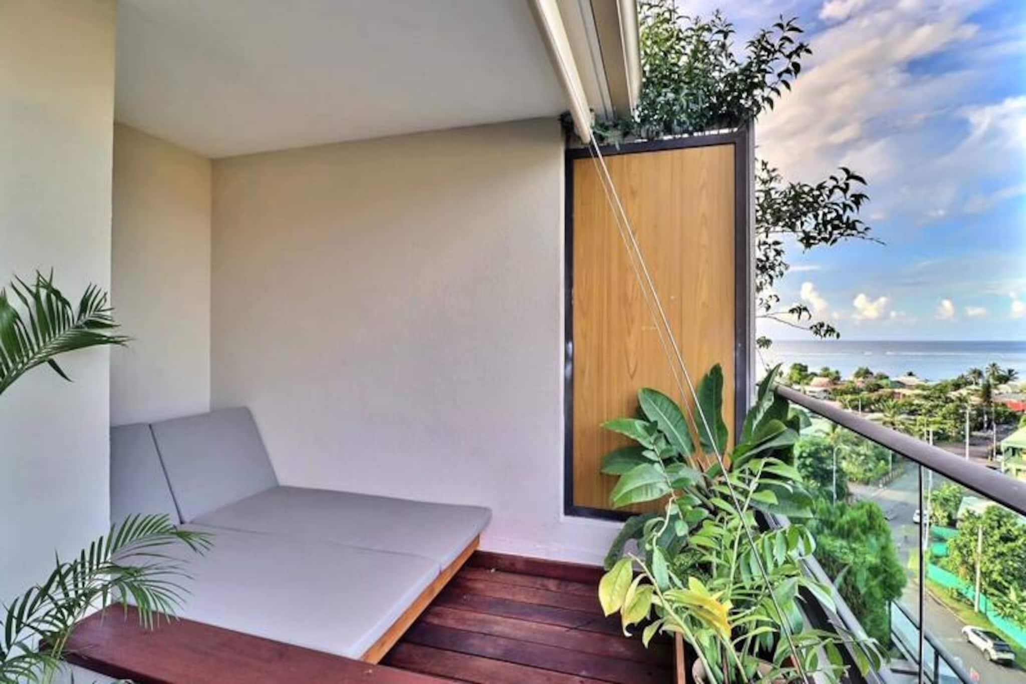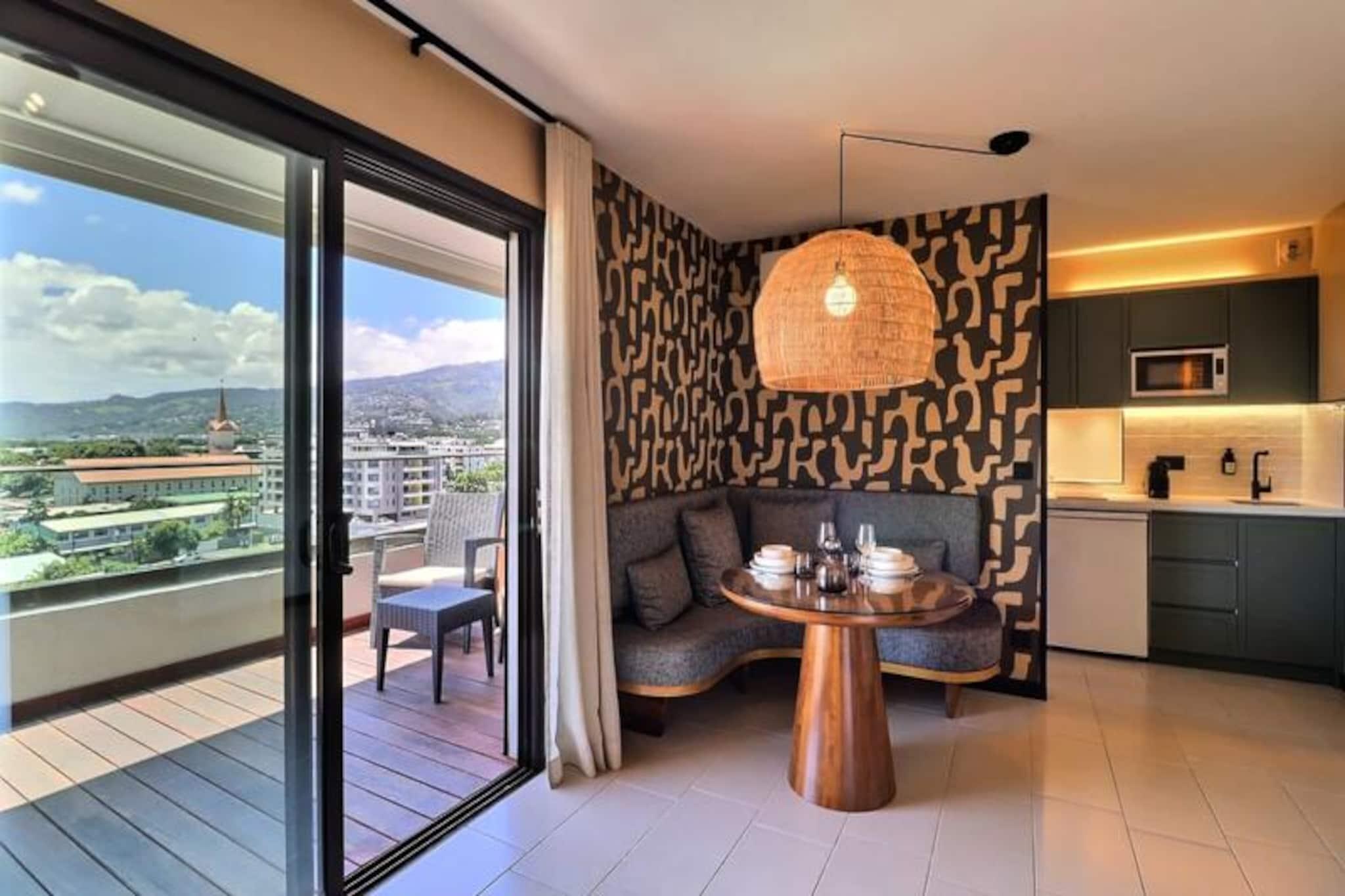 Højt over Papeetes pulserende gader tilbyder Mahana Suite en betagende tilflugtssted, hvor bylandskaber møder den turkisblå lagune og frodige bjerge. Beliggende på 8. sal i den nyrenoverede Lagon Bleu-residens inviterer dette moderne tilflugtssted dig til at fordybe dig i Polynesiens skønhed, mens du nyder komforten ved et moderne liv. Fra den panoramiske terrasse kan du se solen stå op over havet eller byens lys funkle mod nattehimlen - en udsigt, der føles som et levende postkort hvert øjeblik af dit ophold.\n\nTræd indenfor og oplev et rum designet til afslapning og elegance. Suiten har aircondition, hvilket sikrer komfort i det tropiske klima, og har en raffineret indretning med omhyggelige finish. Den lyse stue åbner ud til terrassen og skaber en problemfri forbindelse mellem indendørs og udendørs ophold. Et hyggeligt soveområde, adskilt af en elegant dekorativ skillevæg, tilbyder privatliv, mens det moderne køkken er udstyret med alt, hvad du behøver, inklusive komfur, kaffemaskine og vaskemaskine. Højhastigheds-Wi-Fi og et smart-tv sørger for underholdning og bekvemmelighed, hvilket gør denne suite ideel til både ferie- og forretningsrejsende.\n\nGæster i Mahana Suite har også eksklusiv adgang til faciliteterne på Lagon Bleu-residensen. Køl af i swimmingpoolen under den tahitiske sol eller få energi i det veludstyrede fitnesscenter. Uanset om du er her for at udforske Polynesiens vidundere eller blot slappe af, tilbyder denne residens den perfekte balance mellem urban elegance og ø-charme.\n\nMed sin uovertrufne beliggenhed, fantastiske udsigt og luksuriøse faciliteter er Mahana Suite din indgang til at opleve Papeetes magi i stil og komfort.