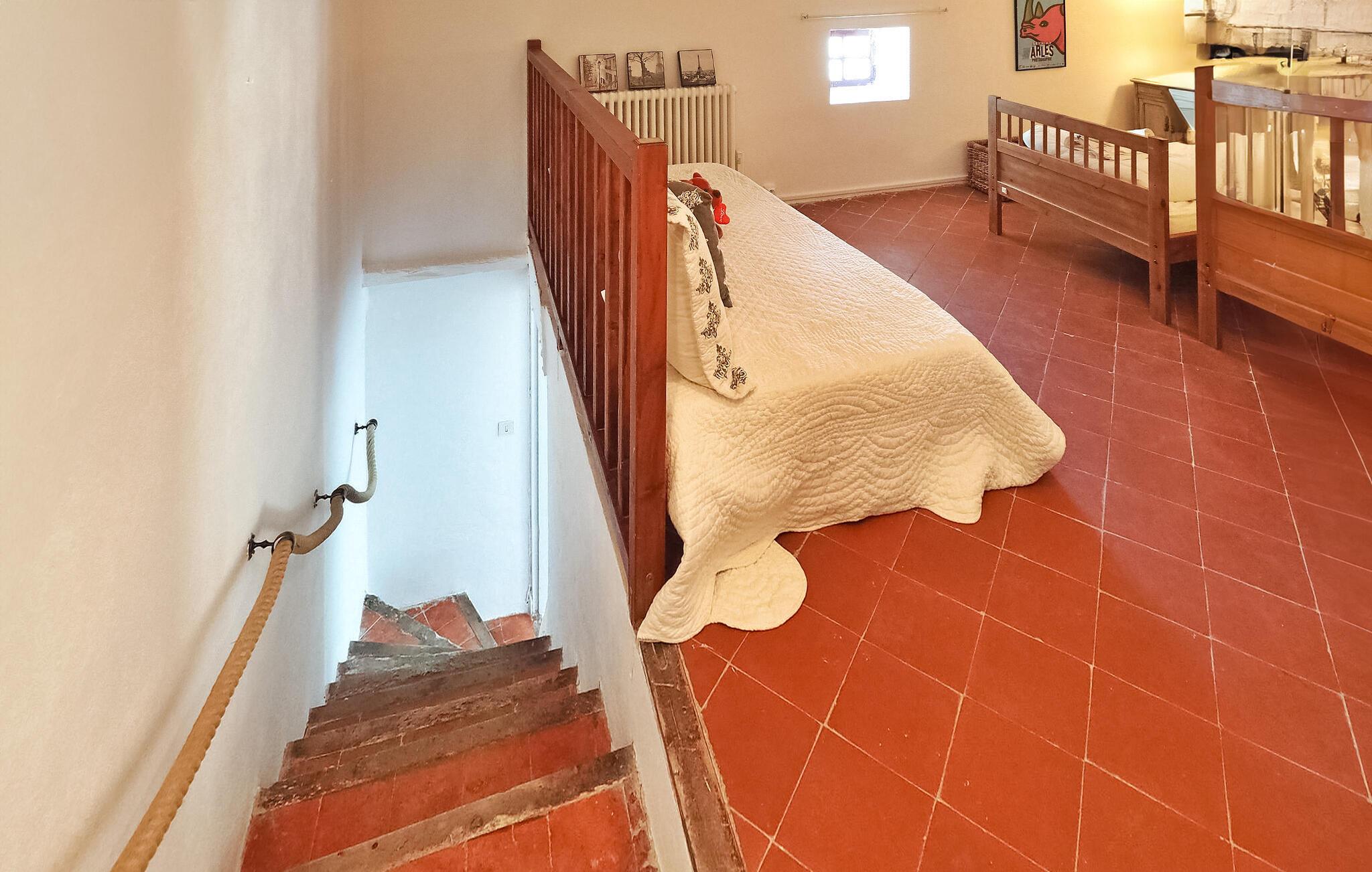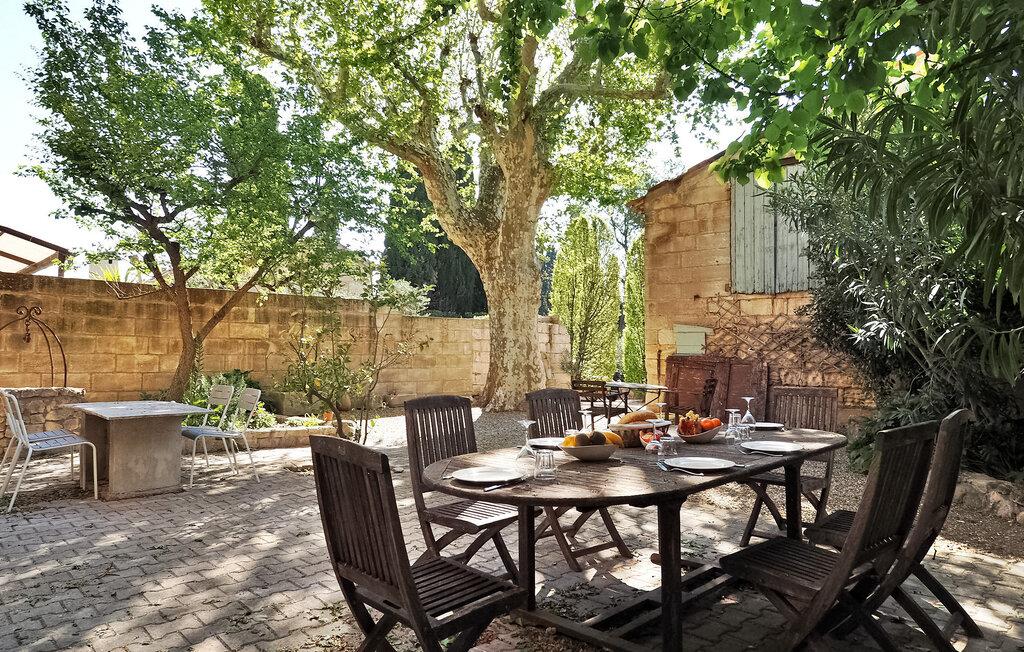Feriehuset i Paradou har egen pool og skyggefuld have. Fordelt på tre etager omfatter det faciliteter som en tv-stue, et veludstyret køkken, vaskefaciliteter, en stue/spisestue og fire soveværelser, der deler to badeværelser med delvist aircondition. Udenfor er der et skyggefuldt område med siddepladser til rådighed ved siden af en privat pool. Venligst ikke, at der er en sikret brønd på ejendommens grund. Beliggende lige ved vejen, der fører til landsbyen Paradou, er huset kun omkring 400 m fra det lokale bageri, slagtere, minimarked, cykeludlejning, læger og bar. Nyd din ferie i en bondegård (mas) din feriebolig i Bouches-du-Rhône i Provence.