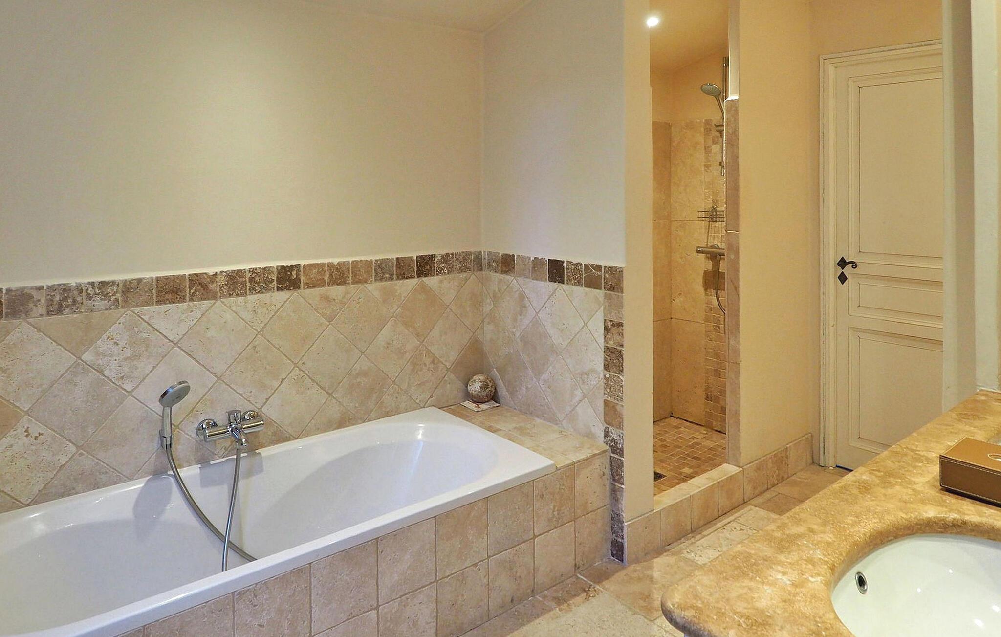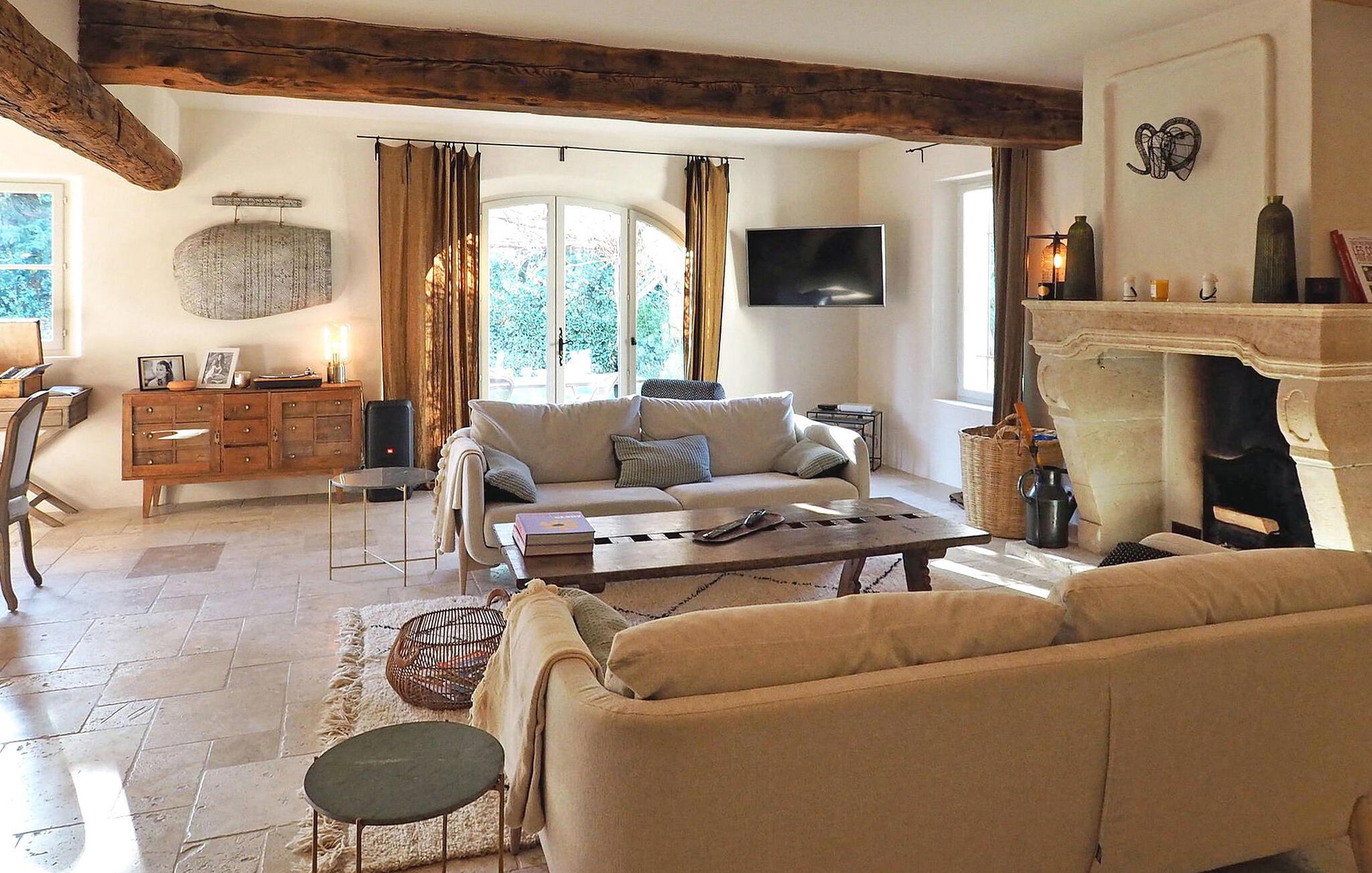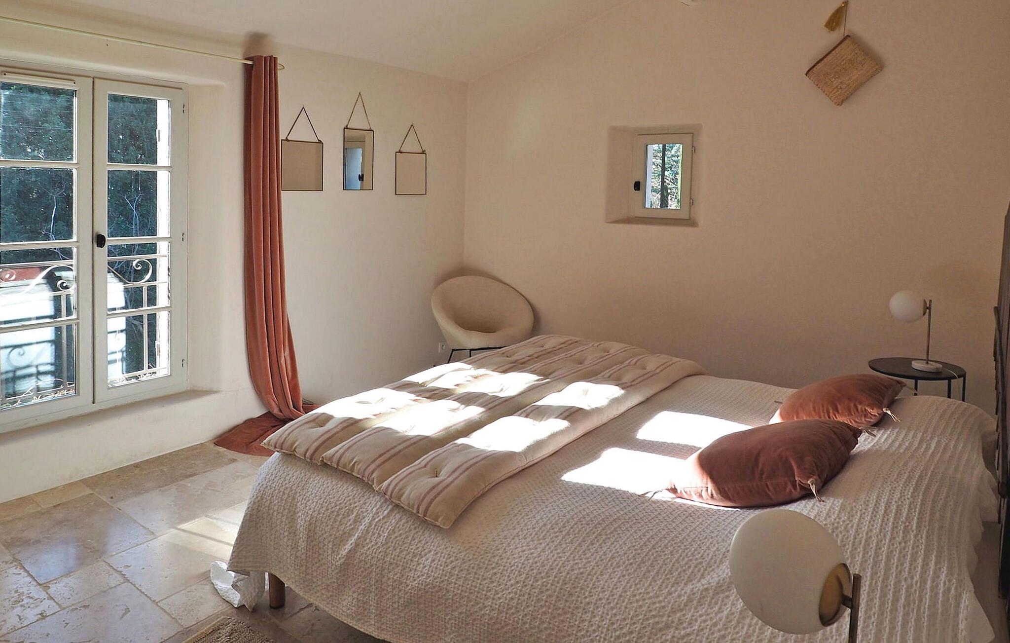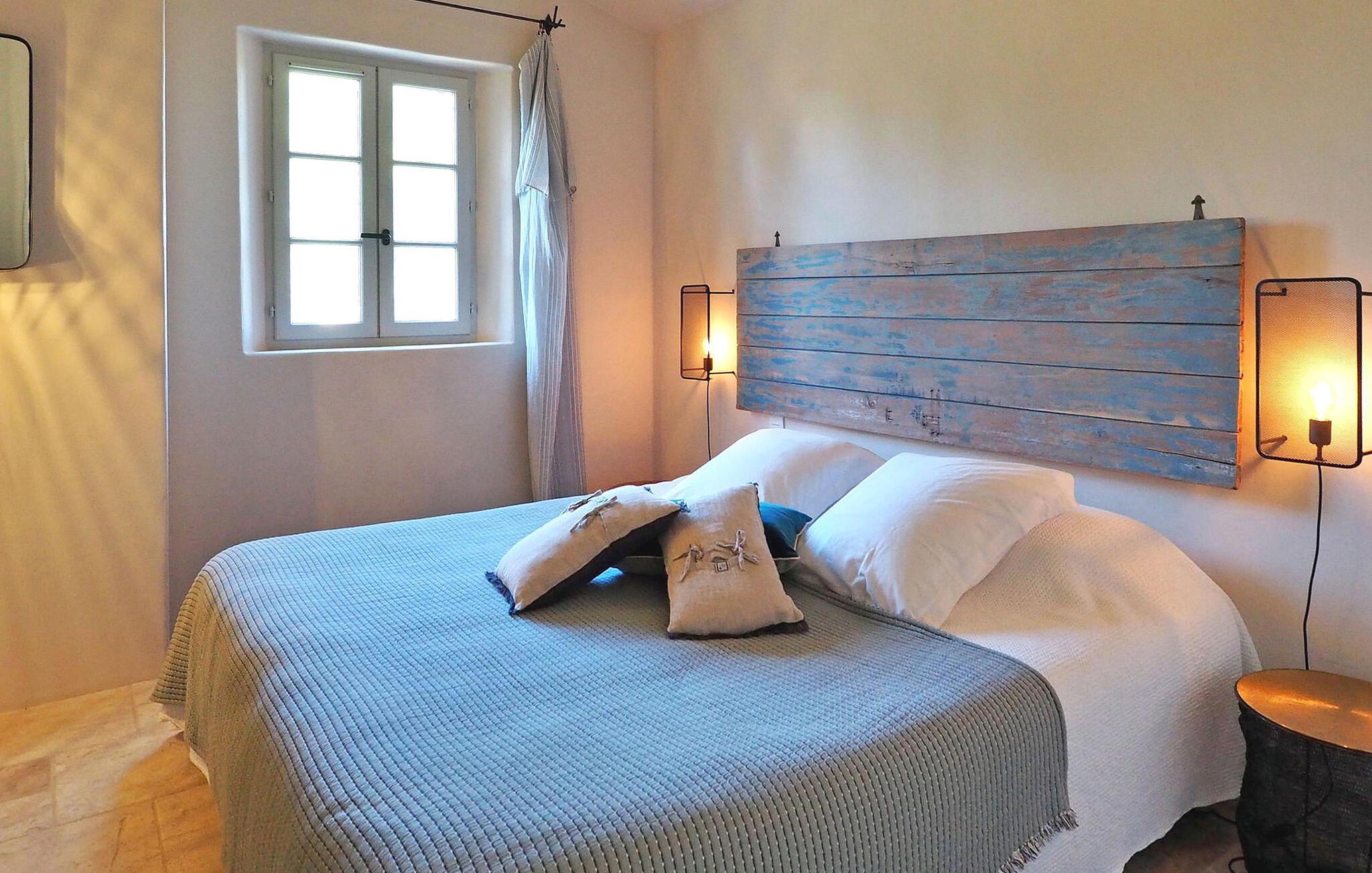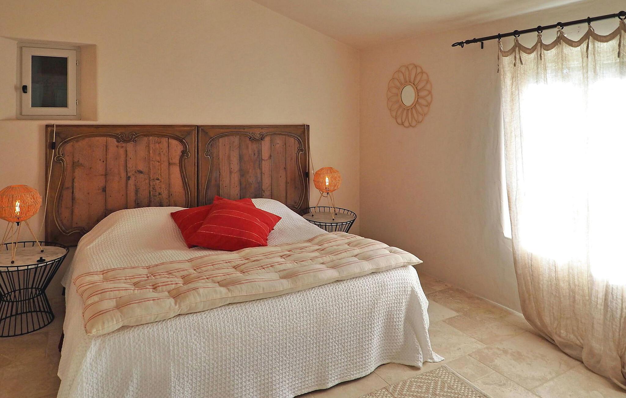 Dette store landsted med privat pool er bekvemt beliggende nær landsbyen Paradou landsby i Provence. Stueetagen har en indgang med toilet og vaskerum. Et åbent opholdsrum inkluderer et køkken med spisefaciliteter. Stueetagen er også vært for en master suite med en dobbeltseng og et privat badeværelse med badekar, bruseniche, dobbelt håndvask og toilet. På øverste etage er der fire soveværelser med dobbeltsenge og private bruserum eller et fælles badeværelse. Udenfor har en terrasse i skyggen af blåregn et bord og 12 stole, mens en anden overdækket terrasse har plads til havemøbler til 8. Derudover byder en separat overdækket terrasse på bordfodbold og dart sammen med en bowlingbane. Adgang til den indhegnede swimmingpool er sikret med to porte, og der er 6 liggestole og 2 liggestole til rådighed ved poolen. Paradous butikker ligger omkring 350 m fra huset. Der er supermarked, slagter, bageri, udlejning/salg af cykler, marked tirsdag morgen og sæsonmarked fredag aften. Landsbyfestivalen Paradou afholdes den første weekend i september med tyrefægtning, bold og kæmpe paella. En attraktiv ejendom med stor have og privat pool, tæt på lokale faciliteter.