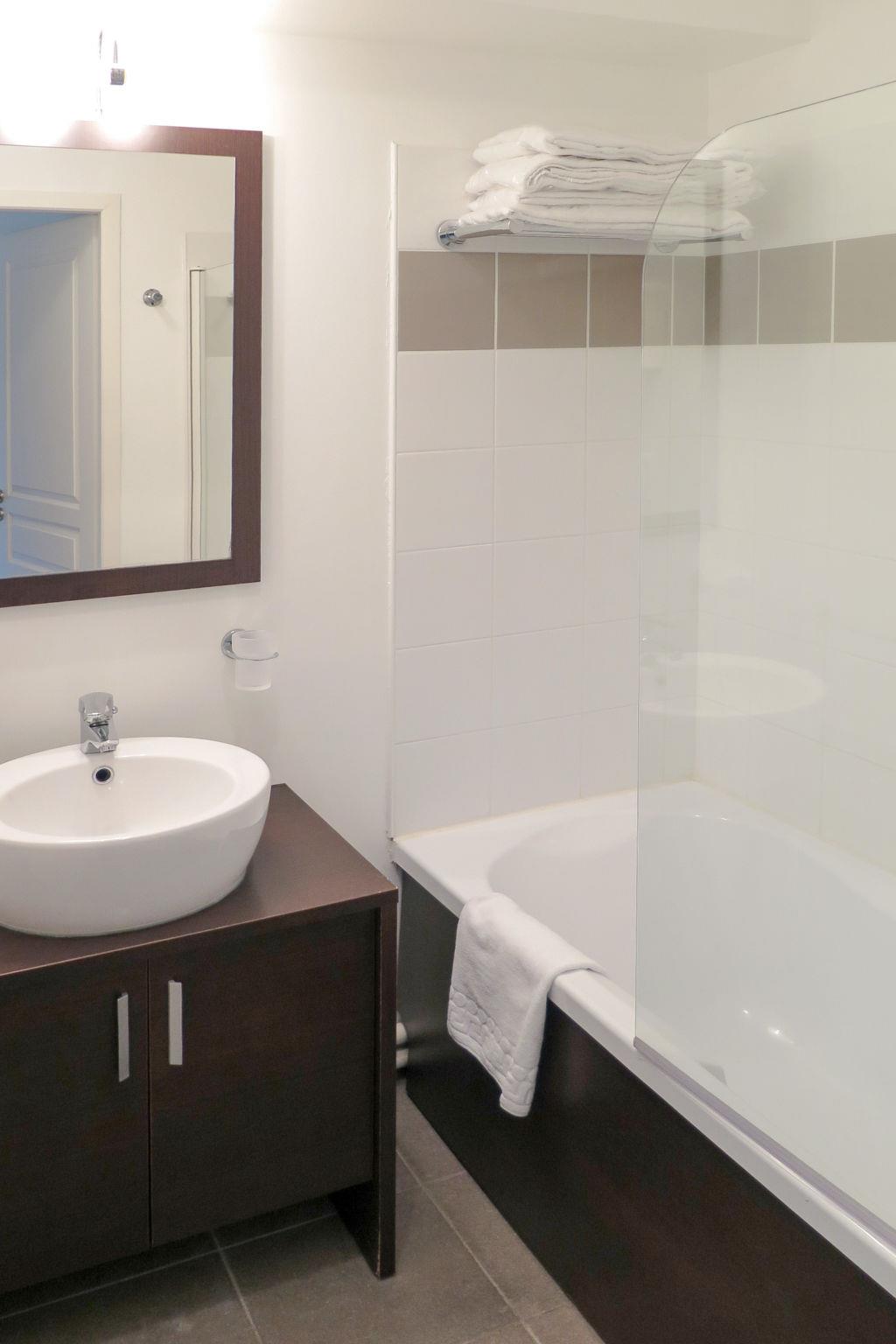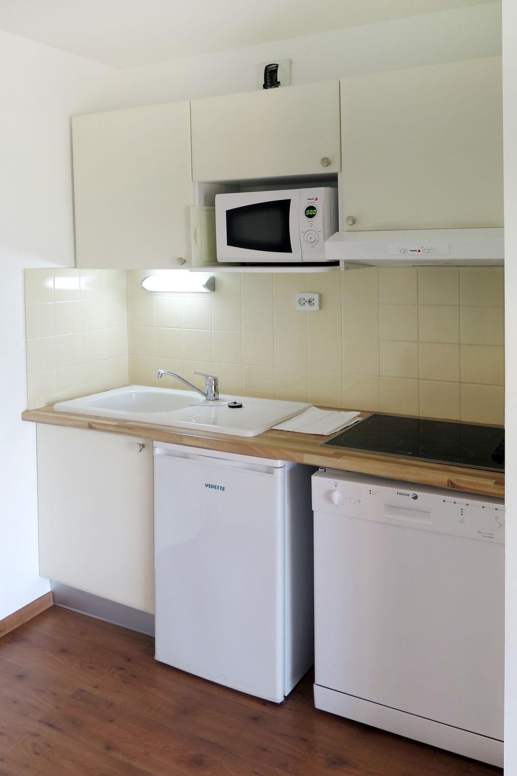 "Les Cottages du Lac T3 Privilège", 3-room apartment 38 m2. Bright, cosy furnishings: living/dining room with dining table and satellite TV (flat screen). Exit to the balcony, to the terrace. 1 room with sliding door with 1 french bed (140 cm, length 190 cm). 1 room with 1 x 2 bunk beds (80 cm, length 180 cm). Open kitchen (dishwasher, 4 ceramic glass hob hotplates, toaster, kettle, microwave, electric coffee machine, Capsules for coffee machine (Nespresso) extra). Bathroom, sep. WC. Electric heating. Balcony or terrace roofed. Balcony furniture. Facilities: children's high chair, baby cot (extra). Internet (WiFi, free). Please note: non-smokers only. Maximum 1 pet/ dog allowed. Smoke alarm, fire extinguisher.