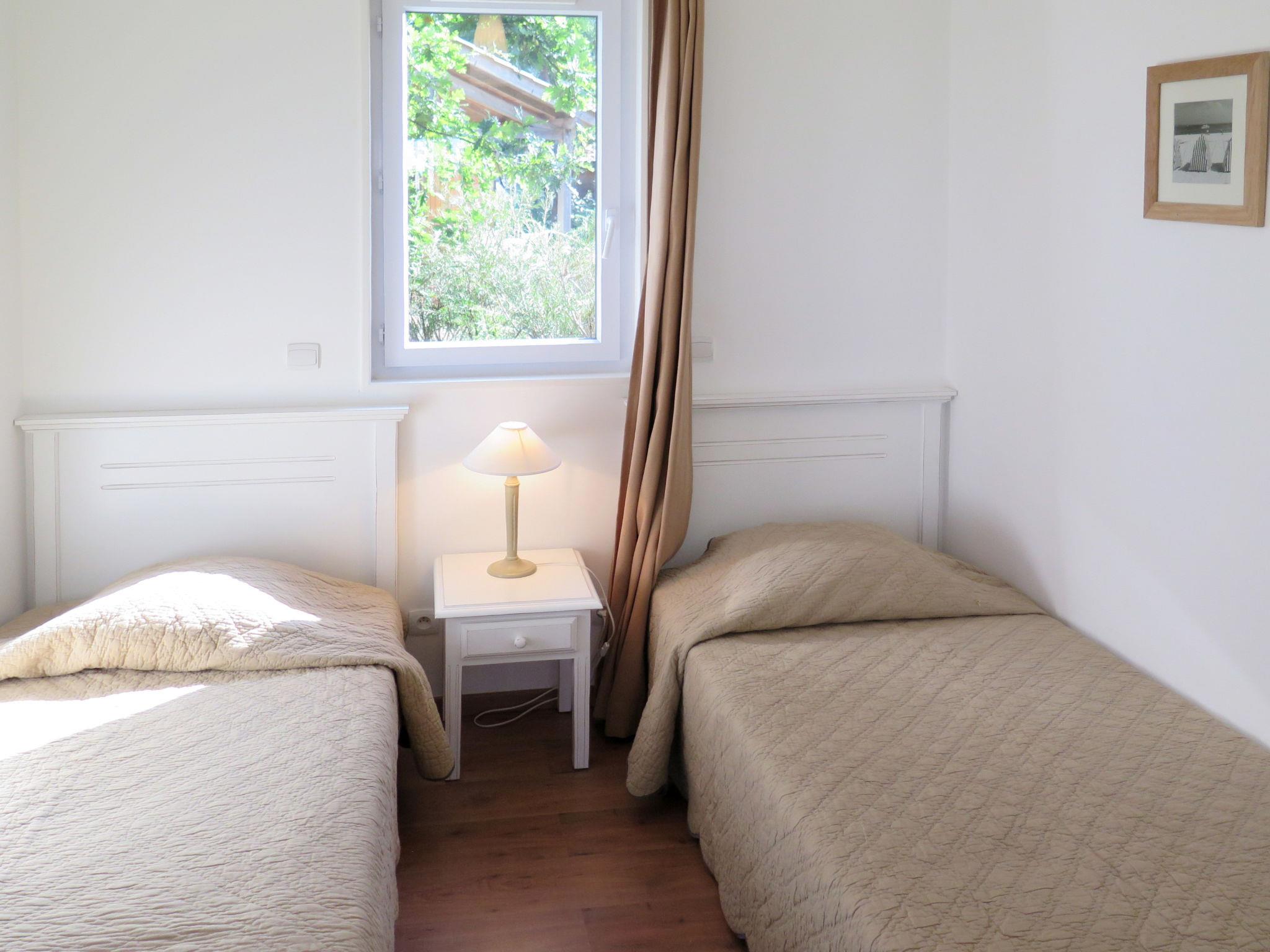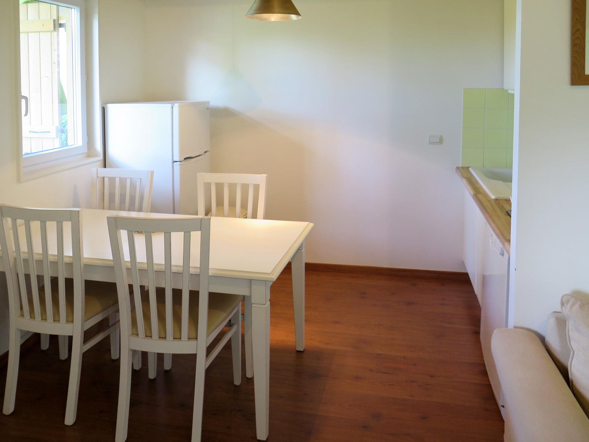 "Les Cottages du Lac M3 Privilège", 3-room chalet 43 m2. Bright, cosy furnishings: living/dining room with dining table and satellite TV (flat screen). Exit to the terrace. 1 room with 1 french bed (140 cm, length 190 cm). 1 room with 2 beds (80 cm, length 190 cm). Open kitchen (dishwasher, 4 ceramic glass hob hotplates, toaster, kettle, microwave, freezer, electric coffee machine, Capsules for coffee machine (Nespresso) extra). Bathroom, sep. WC. Electric heating. Terrace roofed. Terrace furniture, deck chairs (2). Facilities: children's high chair, baby cot (extra). Internet (WiFi, free). Please note: non-smokers only. Maximum 1 pet/ dog allowed. Smoke alarm, fire extinguisher.
