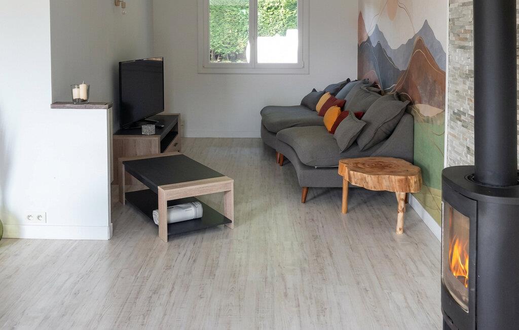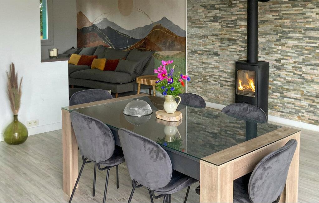Tilbring afslappende timer i den dejlige opholdsstue med den komfortable sofa, stilfulde vægbeklædning og den varme brændeovn. Læn jer tilbage, læs en bog eller nyd den fredelige atmosfære efter en udflugt. Brug den åbne spisestue med det store bord til fælles måltider og hyggelige aftener. Tilbered jeres måltider i det moderne køkken, hvor spisebordet er perfekt til socialt samvær.