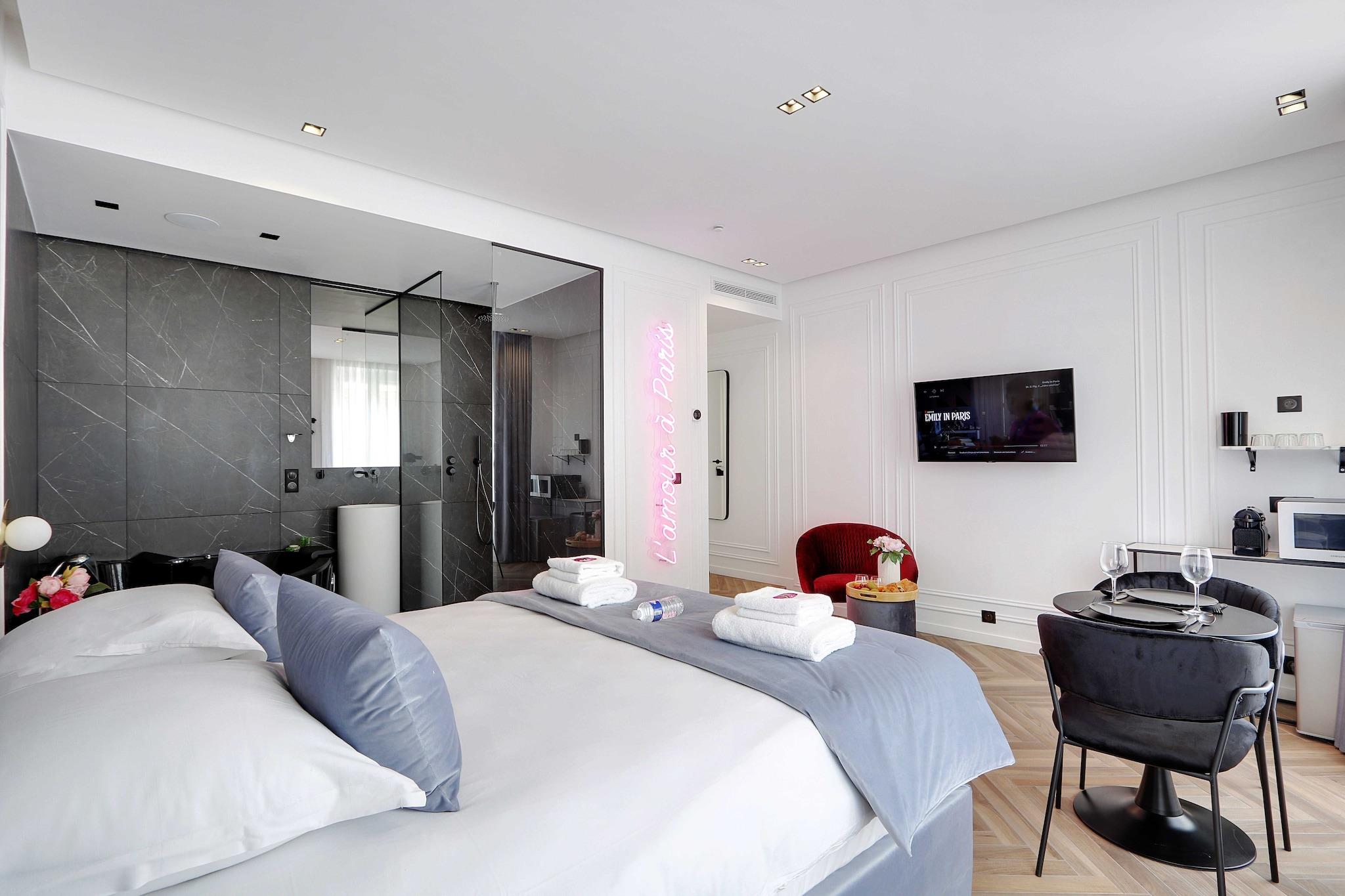 Fordyb dig i hjertet af den parisiske spænding med denne fantastiske suite til to personer med aircondition og jacuzzi, yderst godt placeret i det symbolske kvarter Rue de Rivoli. Forestil dig selv i dette moderne og raffinerede rum på 25 m², hvor du finder den privatliv og ro, du har brug for efter at have udforsket det berømte Marais-distrikt og Beaubourg centrum. Det er det ideelle sted for en uforglemmelig ferie i hovedstaden.