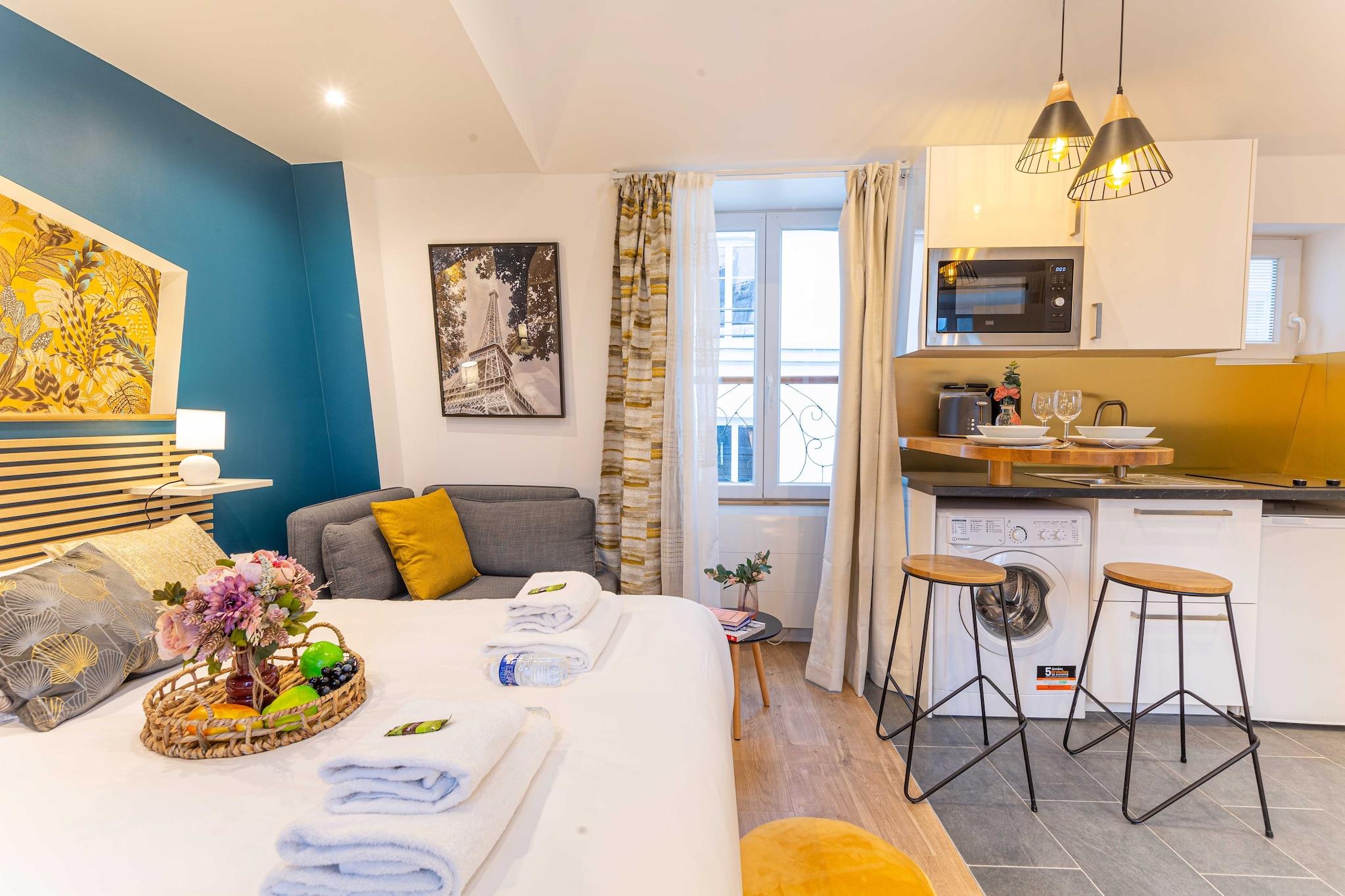 På 5. etage: (åbent køkken(spisebord, kakkelovn, elkedel, brødrister, kaffemaskine(espresso), mikrobølgeovn, køleskab, elektriske kogeplader, , , Wine glasses), Stue/soveværelse(dobbeltseng), badeværelse(bruser, håndvask, toilet)) , , , , Fjernsyn, vaskemaskine, varme, strygejern, føntørrer, Håndklæder/sengelinned (inkl.), ,