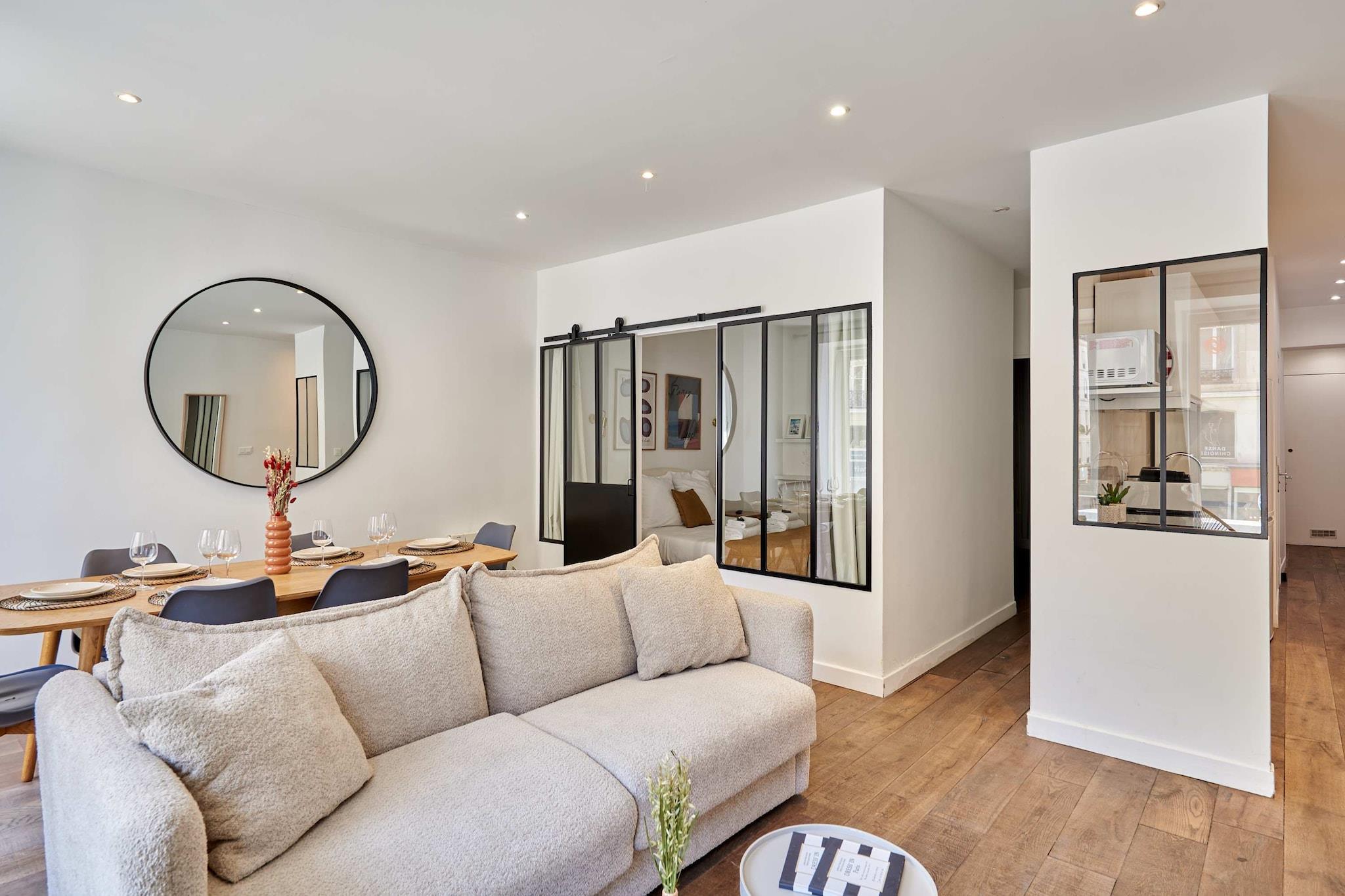 Oplev denne ideelt beliggende lejlighed i hjertet af Paris, halvvejs mellem Marais, Rue Montorgueil og Place des Victoires. Du finder alle de lokale butikker, de berømte teatre på Grands Boulevards og et udvalg af restauranter, der passer til din smag. Min lejlighed er elegant, rummelig, lys, smagfuldt indrettet og fuldt udstyret og er ideel til et vellykket ophold i hovedstaden, uanset om det er med familie eller venner.