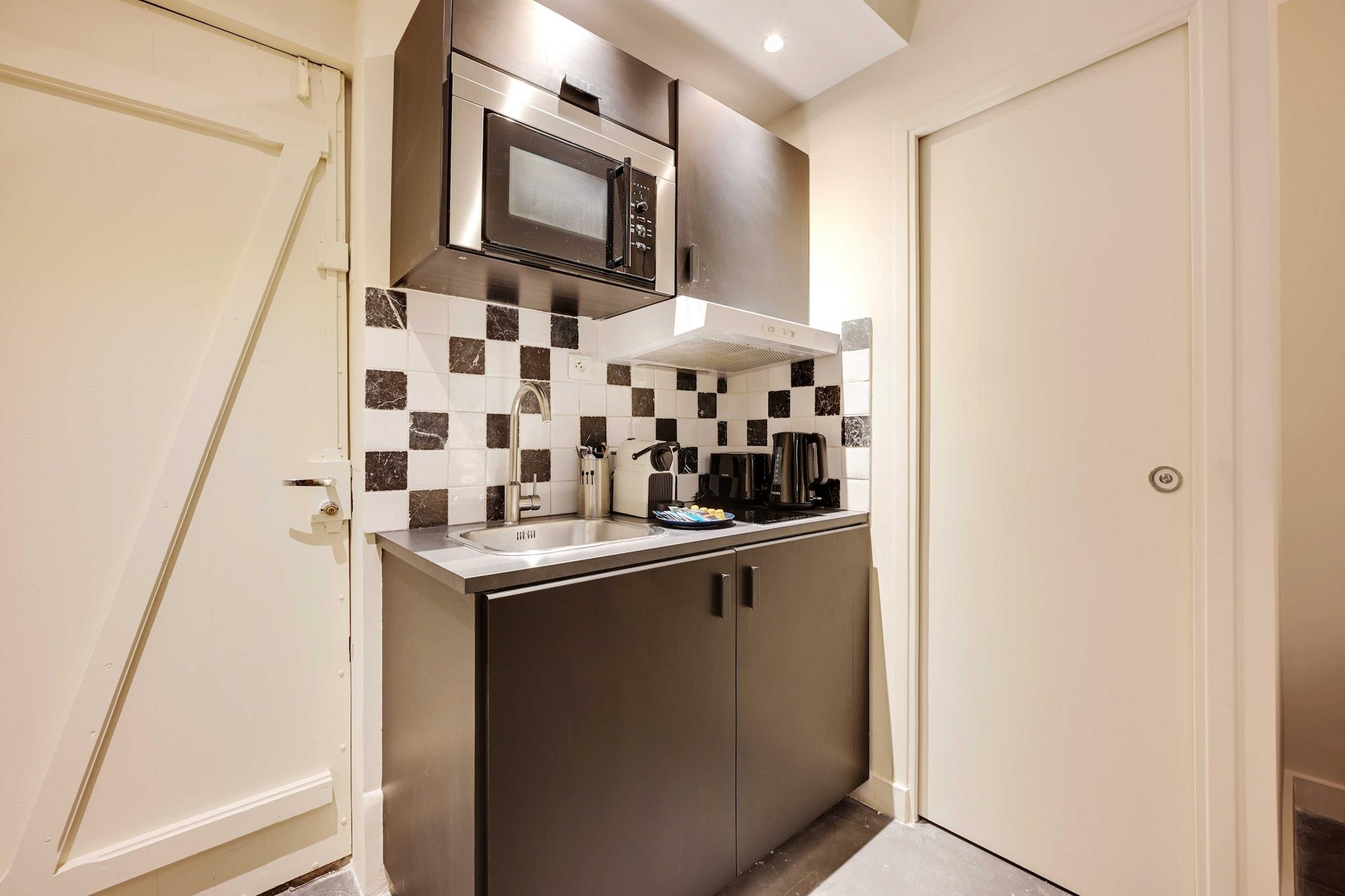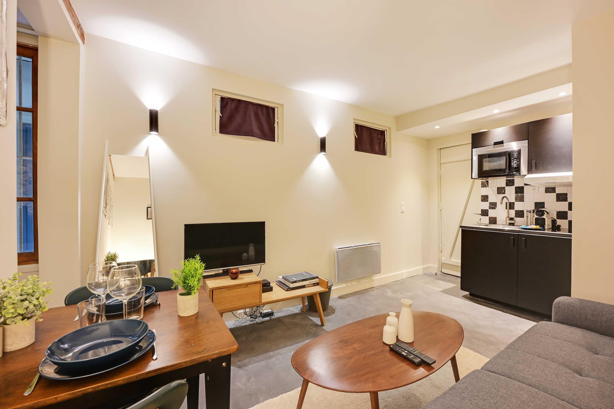 Stueetage: (Stue(dobbeltsovesofa, Fjernsyn, spisebord), åbent køkken(kakkelovn, elkedel, brødrister, kaffemaskine, mikrobølgeovn, køleskab, elektriske kogeplader, , , Wine glasses), soveværelse(, , Queen Bed), badeværelse(bruser, håndvask, toilet, føntørrer, , )) , varme, strygejern, Håndklæder/sengelinned (inkl.), , , Carbon monoxide detector, Cleaning Disinfection, Downtown, Enhanced cleaning practices, Extra pillows and blankets, High touch surfaces disinfected, Long term stays allowed, Path to entrance lit at night, Room-darkening shades, Town
