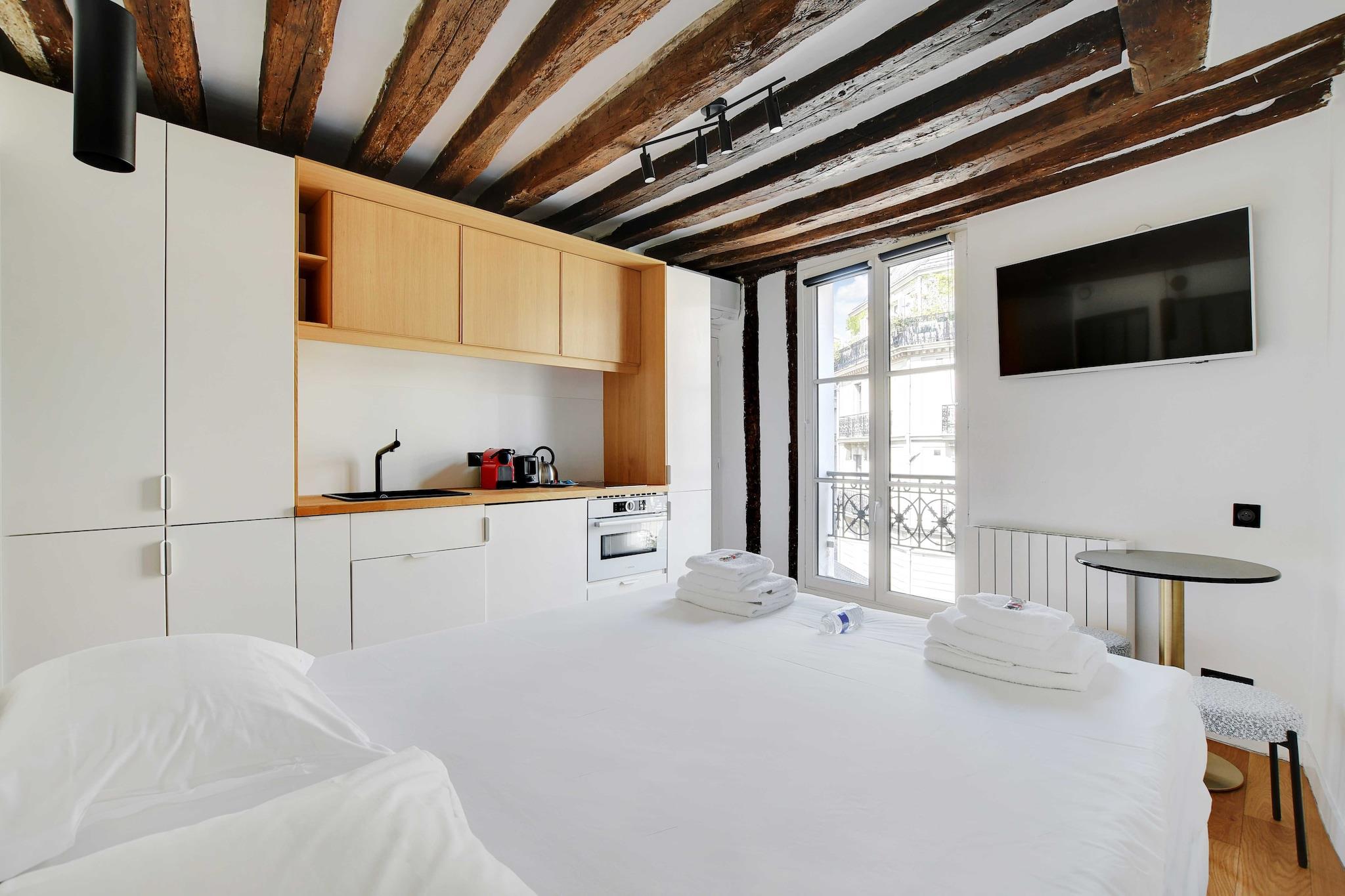På 4. etage: (Køkken(kakkelovn, elkedel, brødrister, kaffemaskine, ovn, køleskab, , ), Stue/soveværelse(, enkeltsovesofa, Fjernsyn), badeværelse(bruser, toilet, føntørrer, Håndklæder/sengelinned (inkl.), , )) , , Førstehjælp, Legeområde, vaskemaskine, varme, klimaanlæg, strygejern, Carbon monoxide detector, Cleaning Disinfection, Downtown, Enhanced cleaning practices, High touch surfaces disinfected, Long term stays allowed, Town