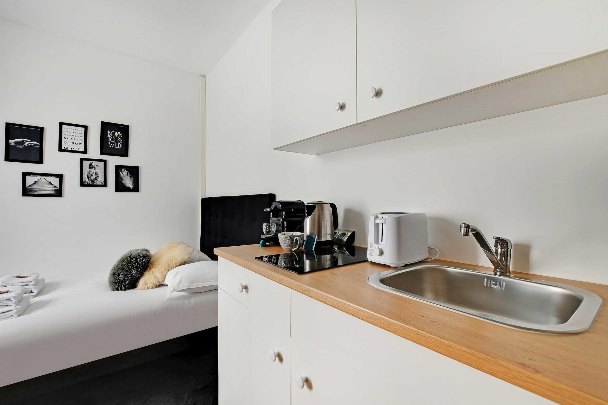 Stueetage: (Stue(dobbeltseng, spisebord), åbent køkken(spisebord, kogeplade, elkedel, brødrister, komfur, kaffemaskine, combi-mikroovn, køleskab, , , Wine glasses), badeværelse(bruser, toilet, føntørrer, , , )) , , , Førstehjælp, Legeområde, Fjernsyn, kakkelovn, varme, Håndklæder/sengelinned (inkl.), , Carbon monoxide detector, Downtown, Long term stays allowed, Room-darkening shades, Town