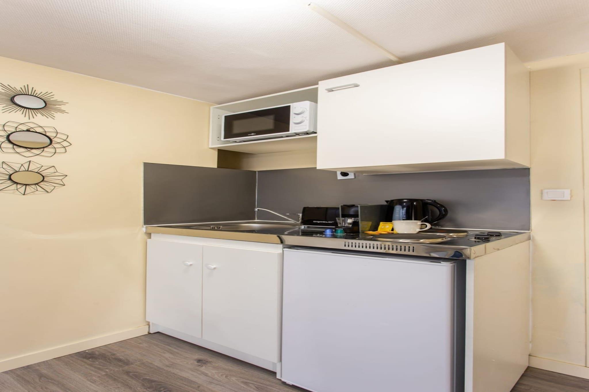 På 1. etage: (Køkken(kakkelovn, elkedel, brødrister, kaffemaskine, mikrobølgeovn, køleskab, ), Stue/soveværelse(, , dobbeltseng, Fjernsyn), badeværelse(bruser, toilet, føntørrer, Håndklæder/sengelinned (inkl.), )) , , , Førstehjælp, Legeområde, vaskemaskine, varme, strygejern, , , , Cleaning Disinfection, Downtown, Enhanced cleaning practices, High touch surfaces disinfected, Long term stays allowed, Town, Washer in common space