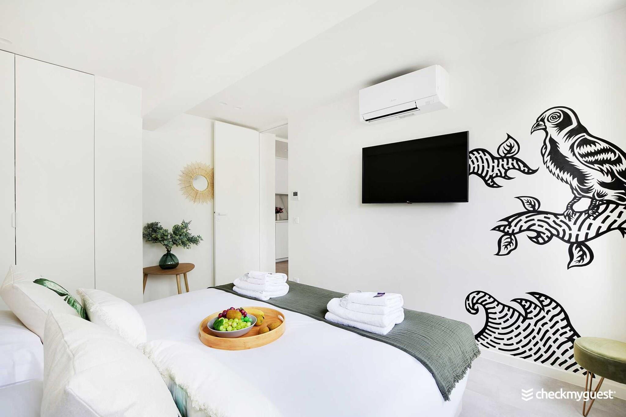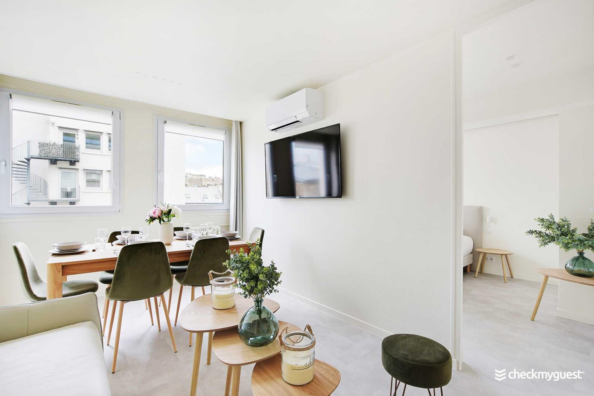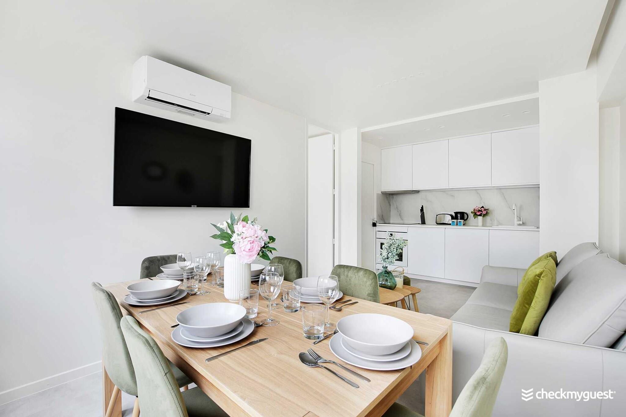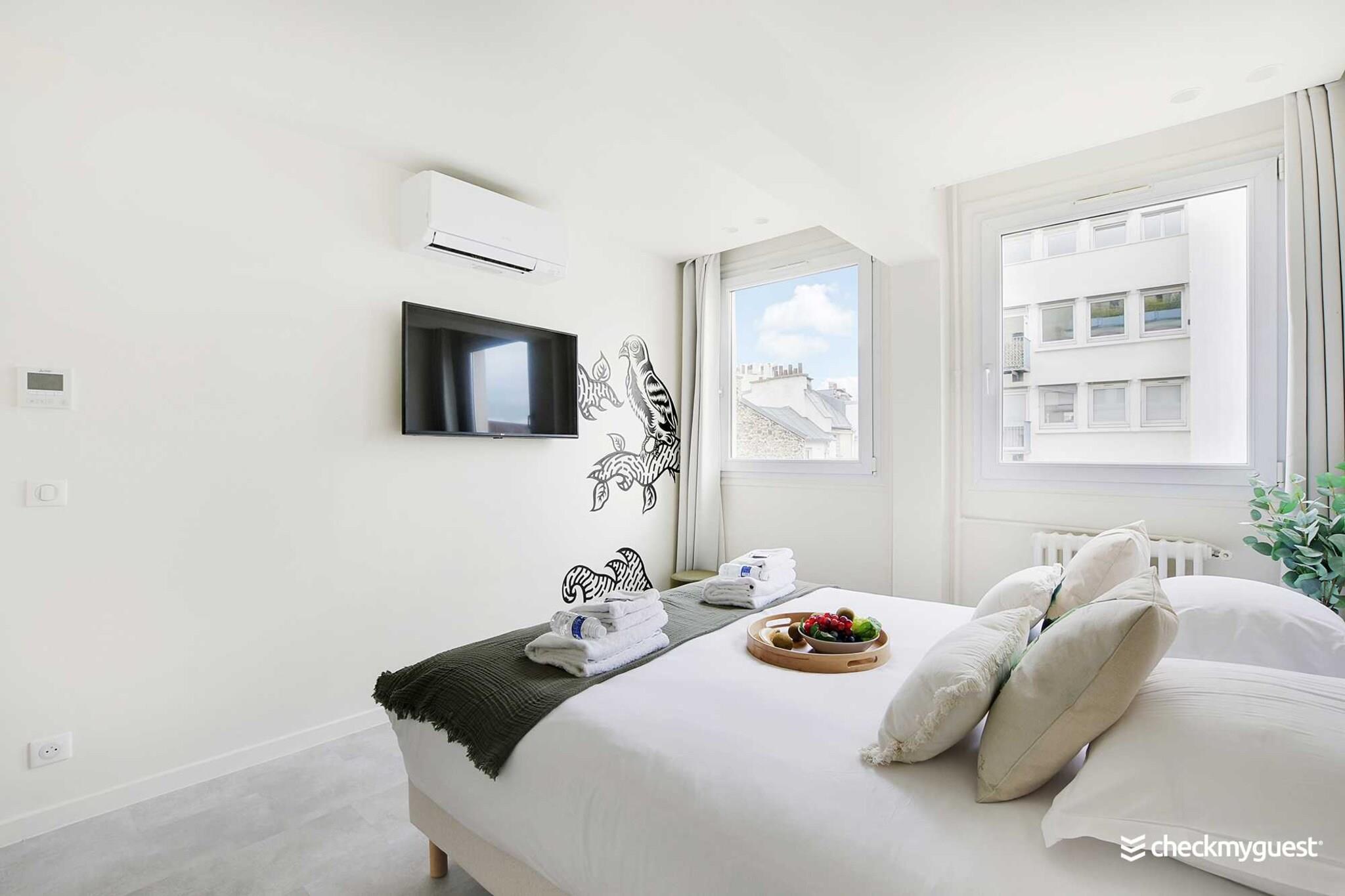 På 5. etage: (Stue(dobbeltsovesofa, Fjernsyn, spisebord), åbent køkken(kakkelovn, kogeplade, elkedel, brødrister, kaffemaskine, ovn, combi-mikroovn, opvaskemaskine , køleskab, elektriske kogeplader, , , Wine glasses), soveværelse(Fjernsyn, klimaanlæg, Queen Bed), soveværelse(, Fjernsyn, klimaanlæg, Queen Bed), badeværelse(bruser, håndvask), badeværelse(bruser, håndvask), toilet(toilet)) , , , , Førstehjælp, Legeområde, vaskemaskine, varme, strygejern, føntørrer, crib(free), Håndklæder/sengelinned (inkl.), , , , Carbon monoxide detector, Cleaning Disinfection, Downtown, Enhanced cleaning practices, High touch surfaces disinfected, Long term stays allowed, Room-darkening shades, Town
