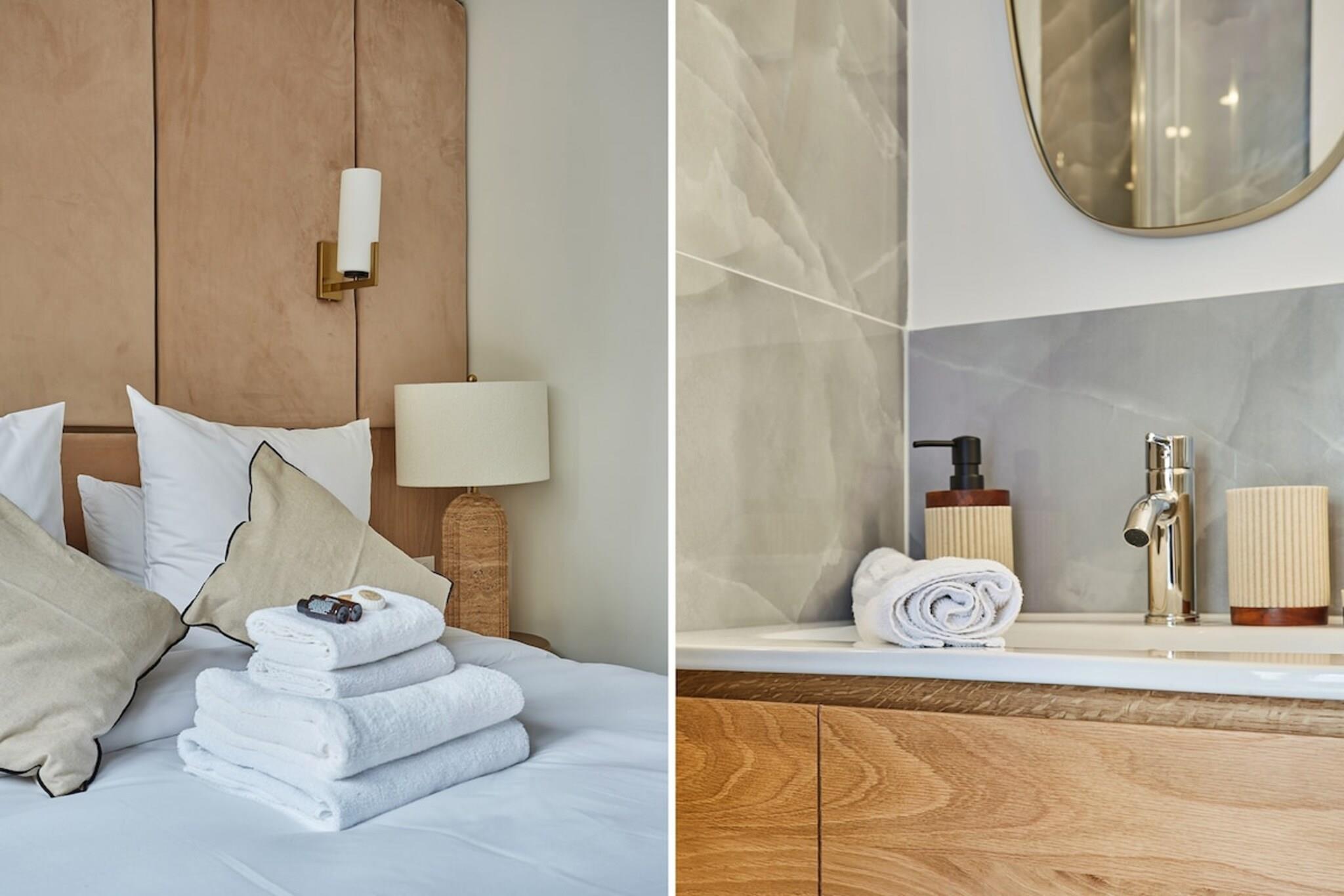 På 1. etage: (Stue(dobbeltsovesofa, Fjernsyn), Køkken(kogeplade, elkedel, brødrister, komfur, kaffemaskine, ovn, mikrobølgeovn, , ), Soveværelse med badeværelse(bruser, håndvask, toilet, Håndklæder inkl., Queen Bed), Soveværelse med badeværelse(bruser, håndvask, toilet, Håndklæder inkl., , Queen Bed)) , , , Førstehjælp, Fjernsyn, tørretumbler, vaskemaskine, varme, klimaanlæg, strygejern, føntørrer, crib(free), , , , , , , Carbon monoxide detector, Downtown