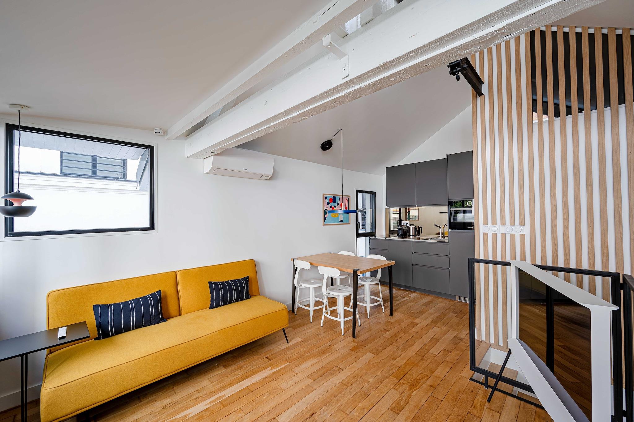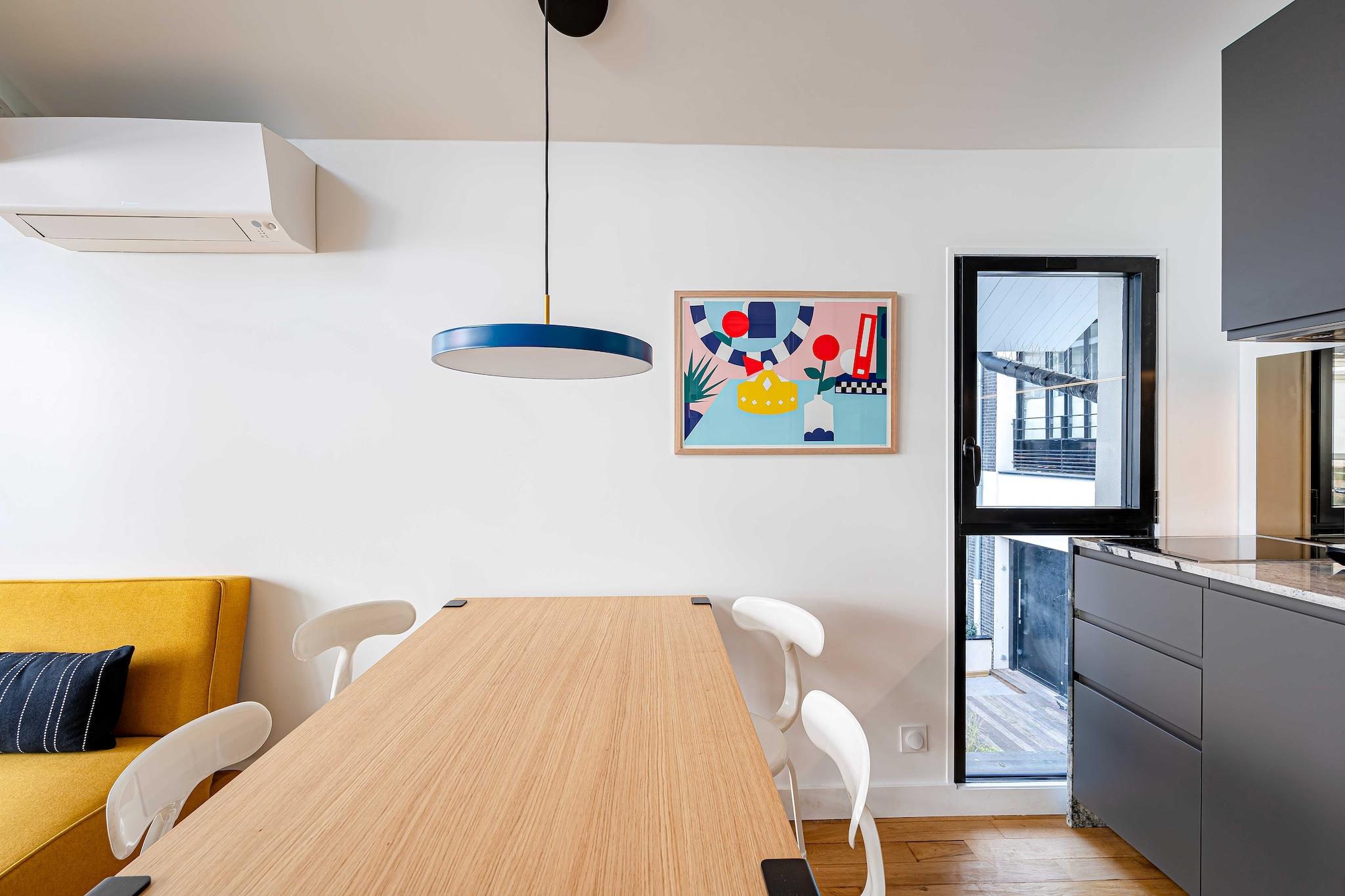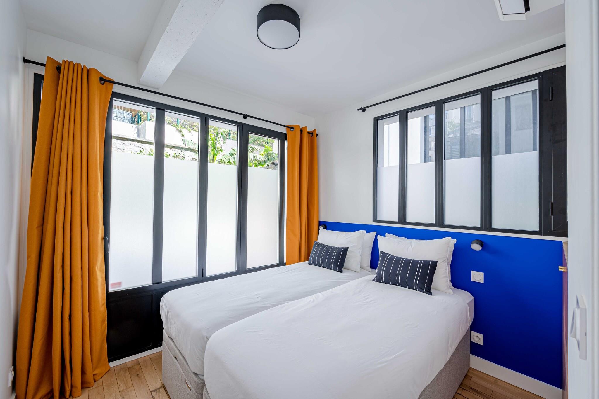Denne moderne lejlighed ligger i hjertet af Paris på adressen 60 Rue Amelot, kun en kort gåtur fra livlige caféer, butikker og større attraktioner. Indkvarteringen er fordelt på to etager: entréen og et soveværelse ligger i stueetagen, mens opholdsstuen, det åbne køkken, det andet soveværelse og badeværelset ligger ovenpå og er tilgængelige via en intern trappe. Lejligheden har et åbent køkken med komfur, elkedel, brødrister, kaffemaskine, mikrobølgeovn, opvaskemaskine, køleskab og alt nødvendigt køkkenudstyr. Den lyse opholdsstue tilbyder tv, skrivebord, aircondition, internetadgang og en komfortabel dobbeltsovesofa. De to soveværelser har et med en dobbeltseng og et med to enkeltsenge. Badeværelset er udstyret med bruser, toilet, hårtørrer, håndklæder og toiletartikler. Der er også vaskemaskine, varme og strygejern til rådighed for gæsterne. Gæsterne kan nyde en privat balkon eller terrasse og drage fordel af faciliteter såsom forbedret rengøring, varme og Wi-Fi. Bemærk venligst, at ejendommen på grund af den interne trappe muligvis ikke er egnet til gæster med nedsat mobilitet. Langtidsophold er velkomne, og lejlighedens centrale beliggenhed gør den ideel til både fritids- og forretningsophold i Paris.