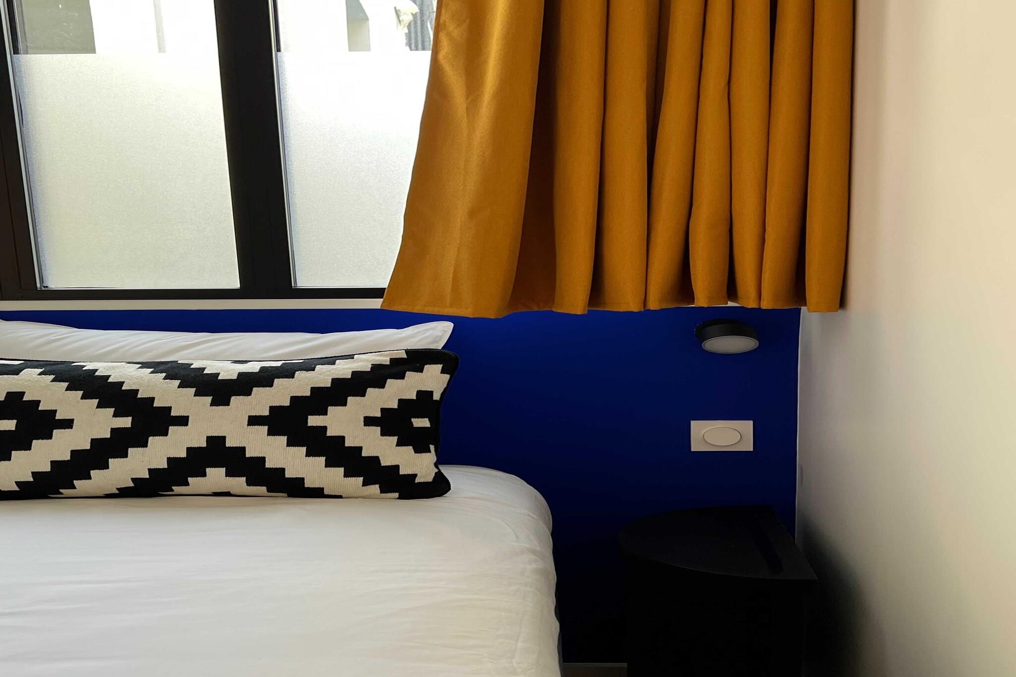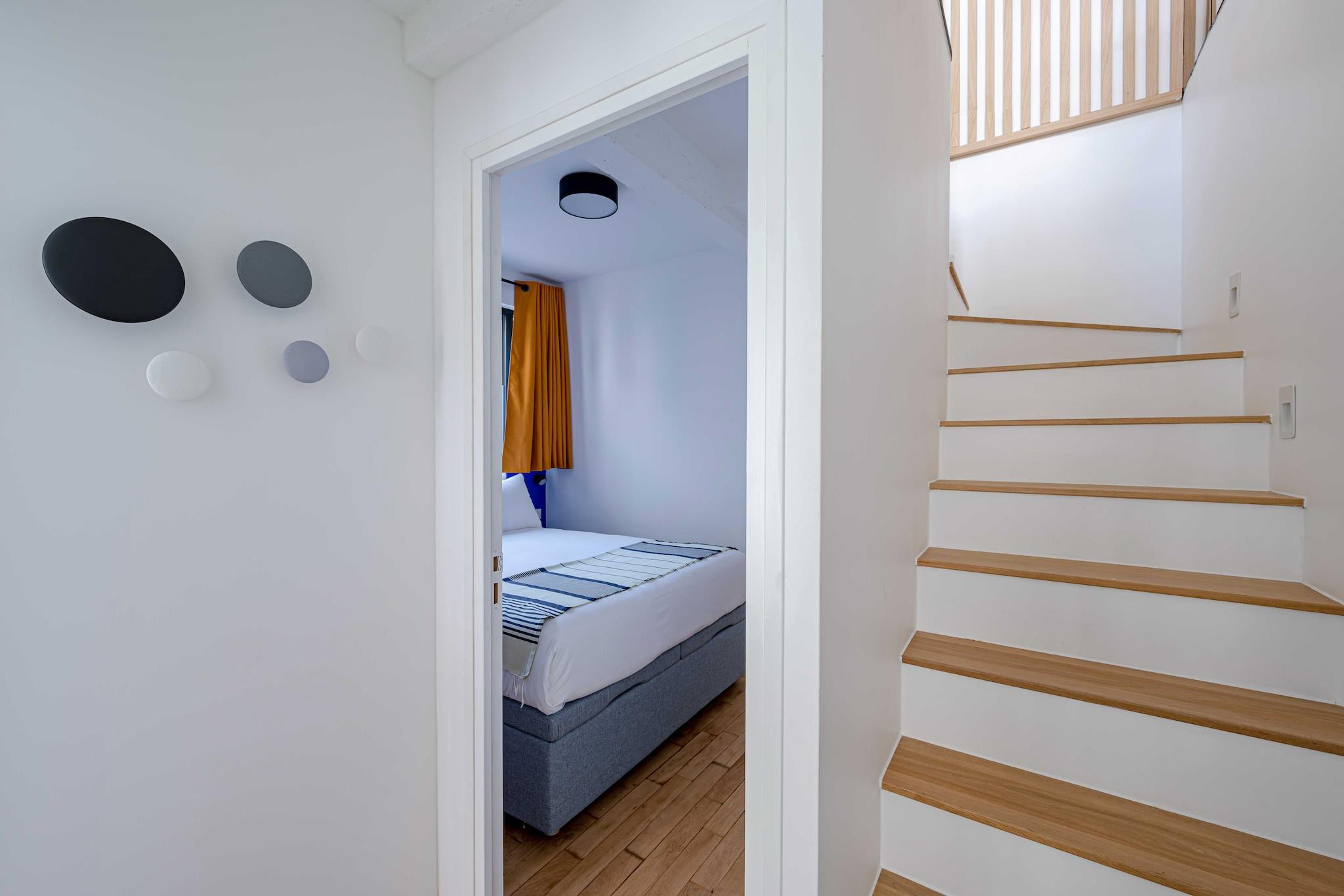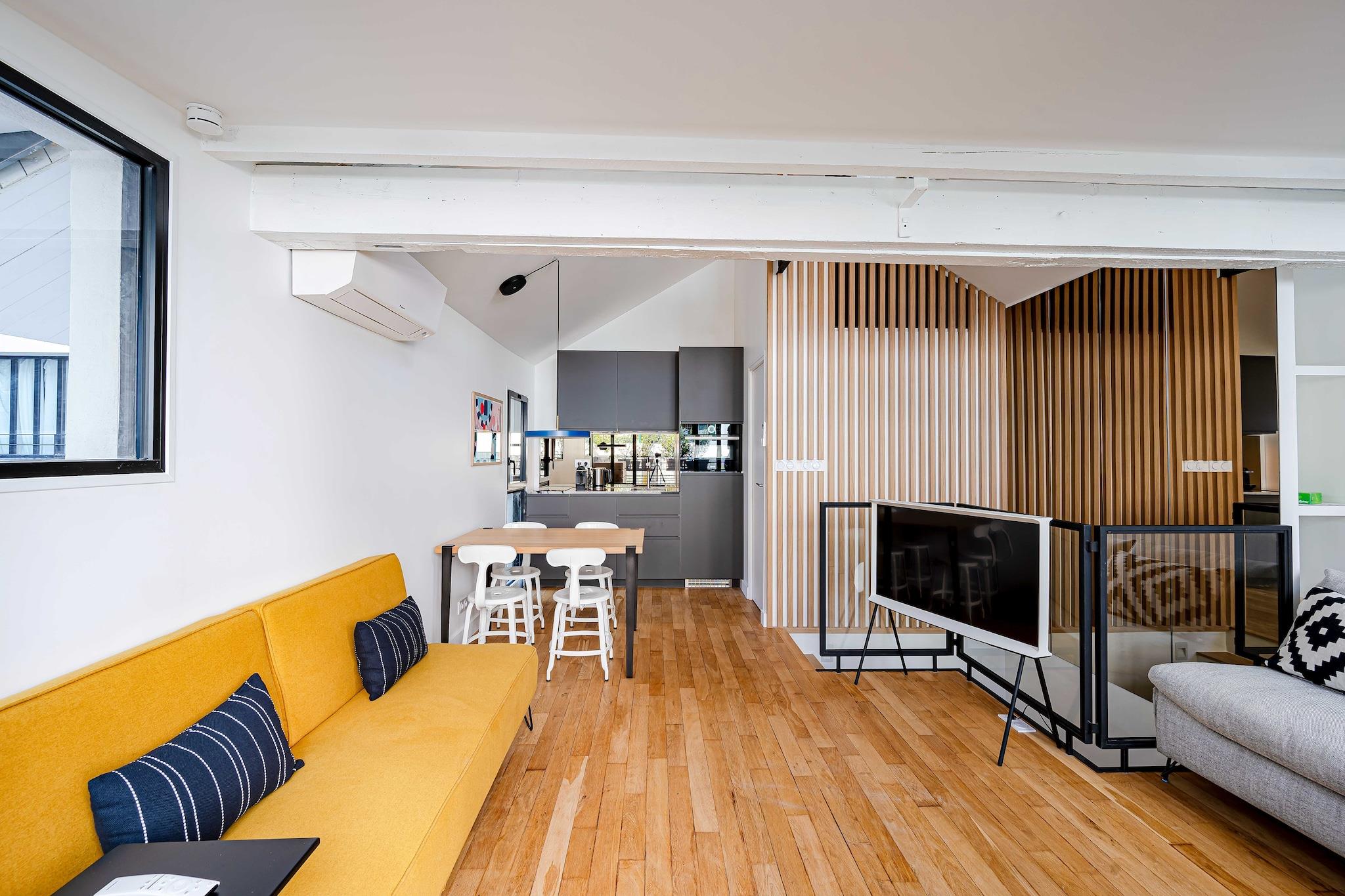 Denne moderne lejlighed ligger i hjertet af Paris på adressen 60 Rue Amelot, kun en kort gåtur fra livlige caféer, butikker og større attraktioner. Indkvarteringen er fordelt på to etager: entréen og et soveværelse ligger i stueetagen, mens opholdsstuen, det åbne køkken, det andet soveværelse og badeværelset ligger ovenpå og er tilgængelige via en intern trappe. Lejligheden har et åbent køkken med komfur, elkedel, brødrister, kaffemaskine, mikrobølgeovn, opvaskemaskine, køleskab og alt nødvendigt køkkenudstyr. Den lyse opholdsstue tilbyder tv, skrivebord, aircondition, internetadgang og en komfortabel dobbeltsovesofa. De to soveværelser har et med en dobbeltseng og et med to enkeltsenge. Badeværelset er udstyret med bruser, toilet, hårtørrer, håndklæder og toiletartikler. Der er også vaskemaskine, varme og strygejern til rådighed for gæsterne. Gæsterne kan nyde en privat balkon eller terrasse og drage fordel af faciliteter såsom forbedret rengøring, varme og Wi-Fi. Bemærk venligst, at ejendommen på grund af den interne trappe muligvis ikke er egnet til gæster med nedsat mobilitet. Langtidsophold er velkomne, og lejlighedens centrale beliggenhed gør den ideel til både fritids- og forretningsophold i Paris.